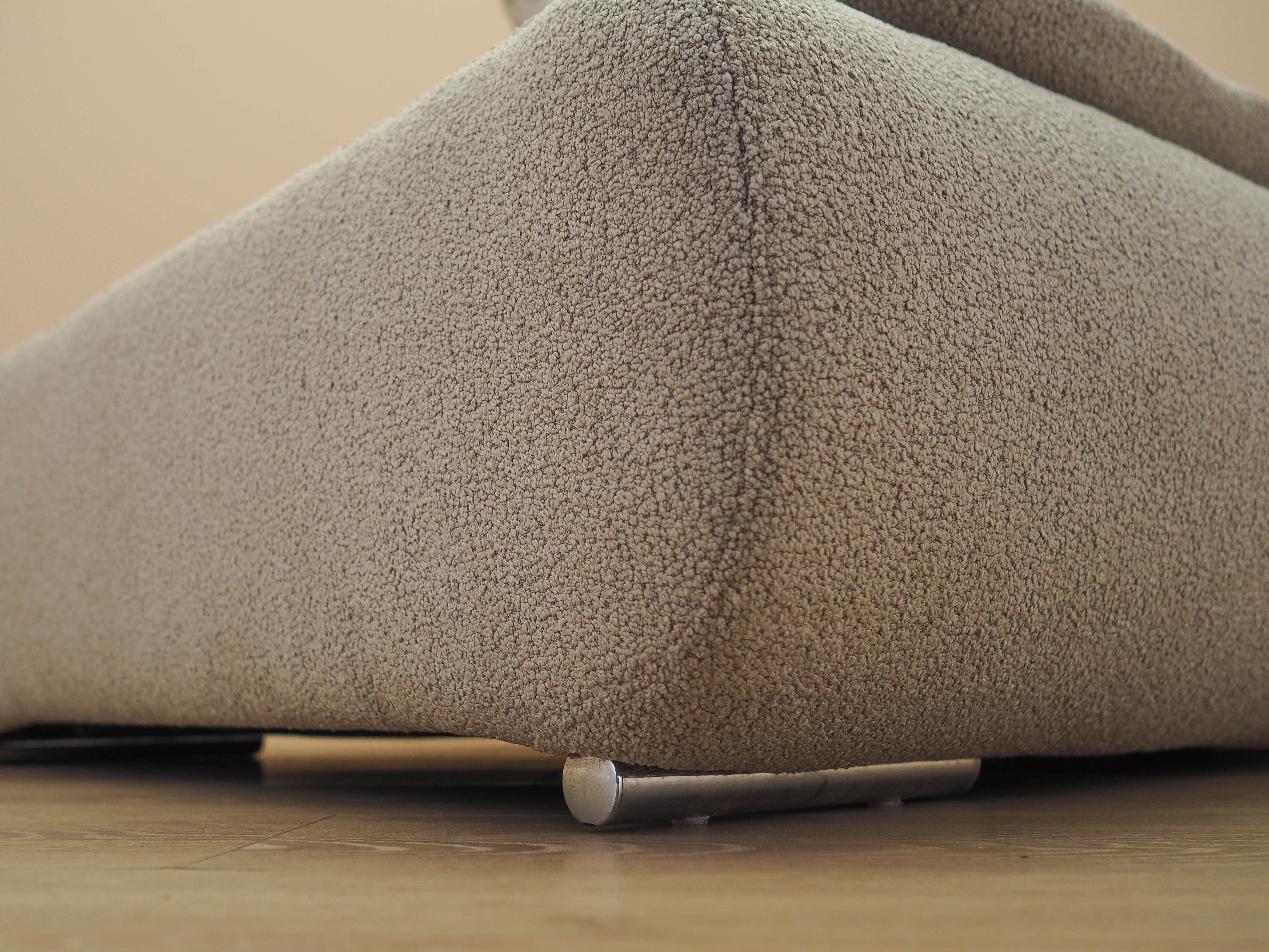 The legs are made of metal. The sofa has been reupholstered, with the foam and fabric replaced with new materials. A high-quality beige fabric has been used. An additional feature is the adjustable headrest.