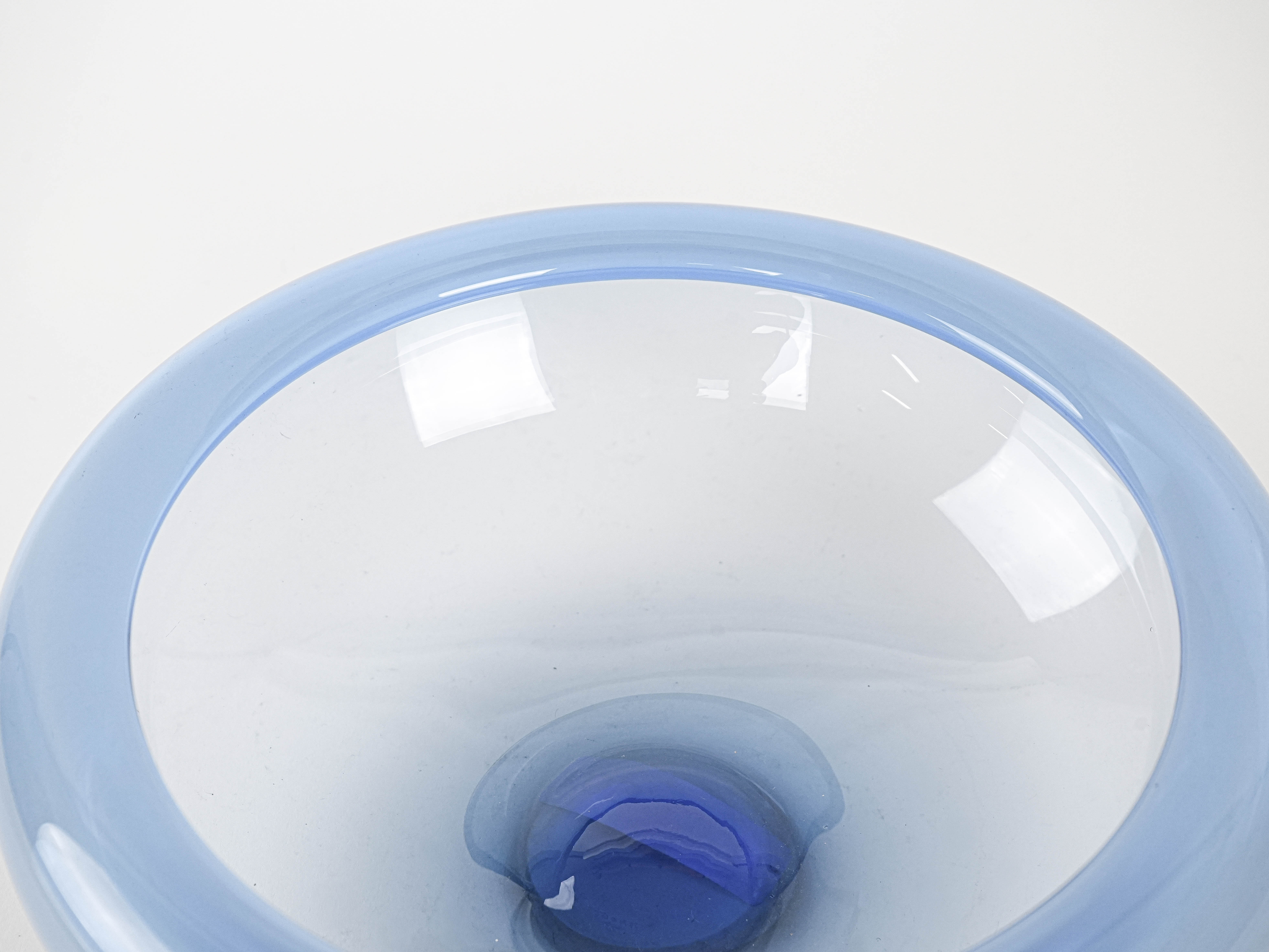 A designer glass bowl in shades of cobalt and blue, characteristic of mid-20th-century Danish design. Its minimalist, organic form and interplay of colours make it both a functional item and a collector’s piece in the mid-century modern style.