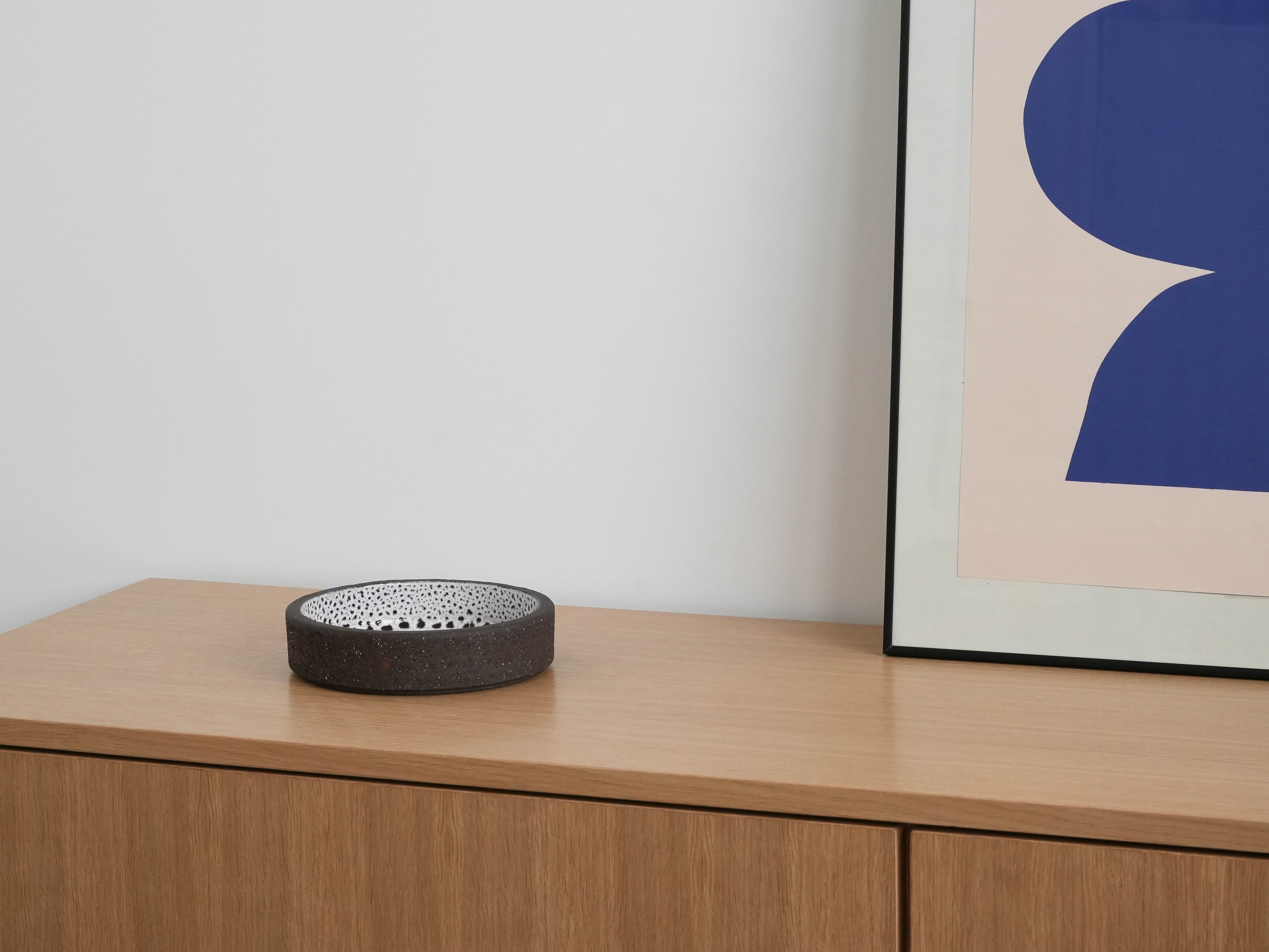 Decorated in shades of gray and white, with characteristic contrasting glazing on the inside, creating a decorative dotted effect. The simple, geometric form emphasizes the minimalist character of the vessel, perfect both as a functional and decorative item.