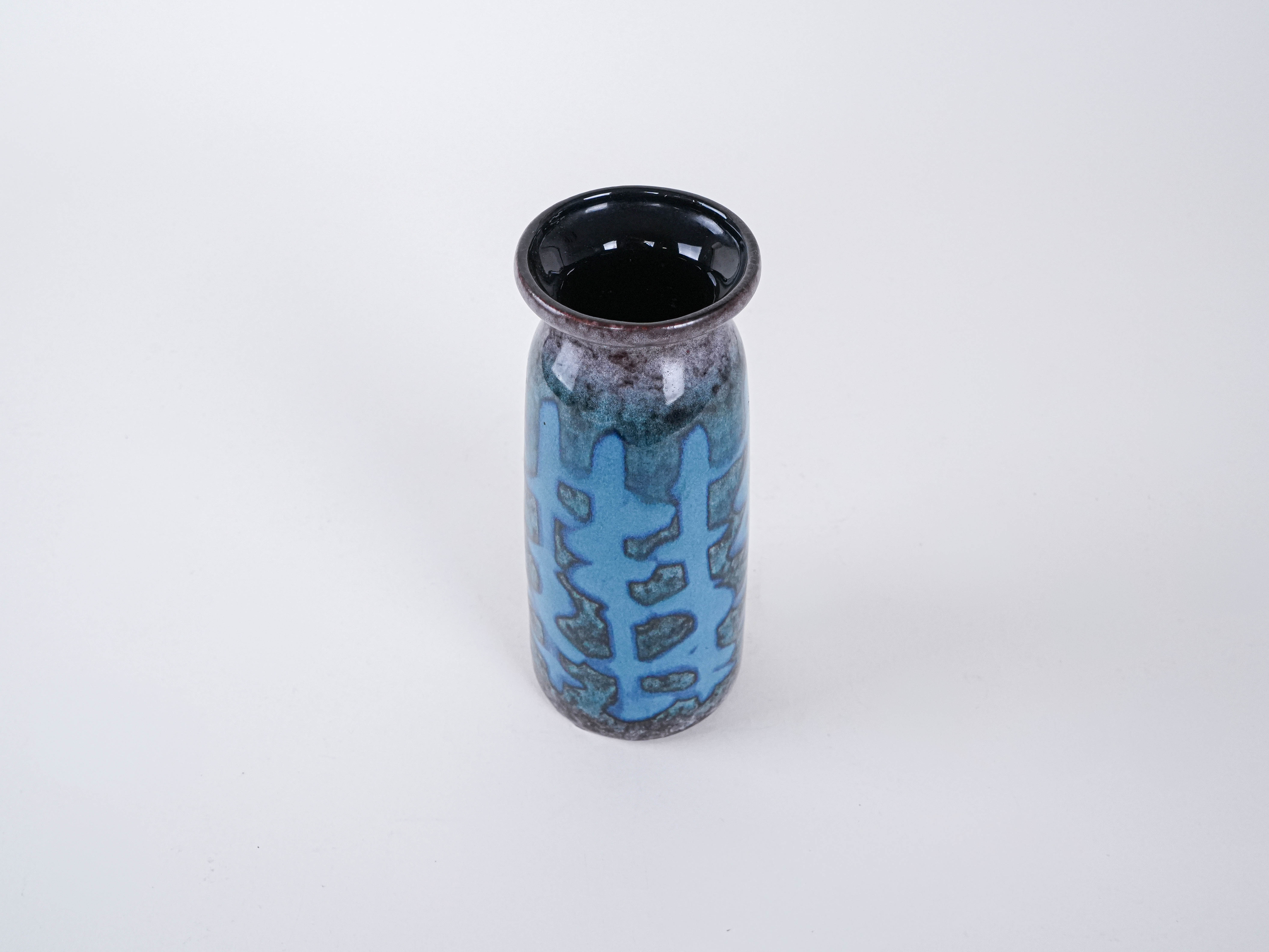 An elegant, cylindrical vase in shades of turquoise and grey, adorned with a decorative geometric pattern. The distinctive glaze with its intense sheen gives it a modern, timeless character. The perfect addition to a vintage collection or a striking feature in a retro-style interior.