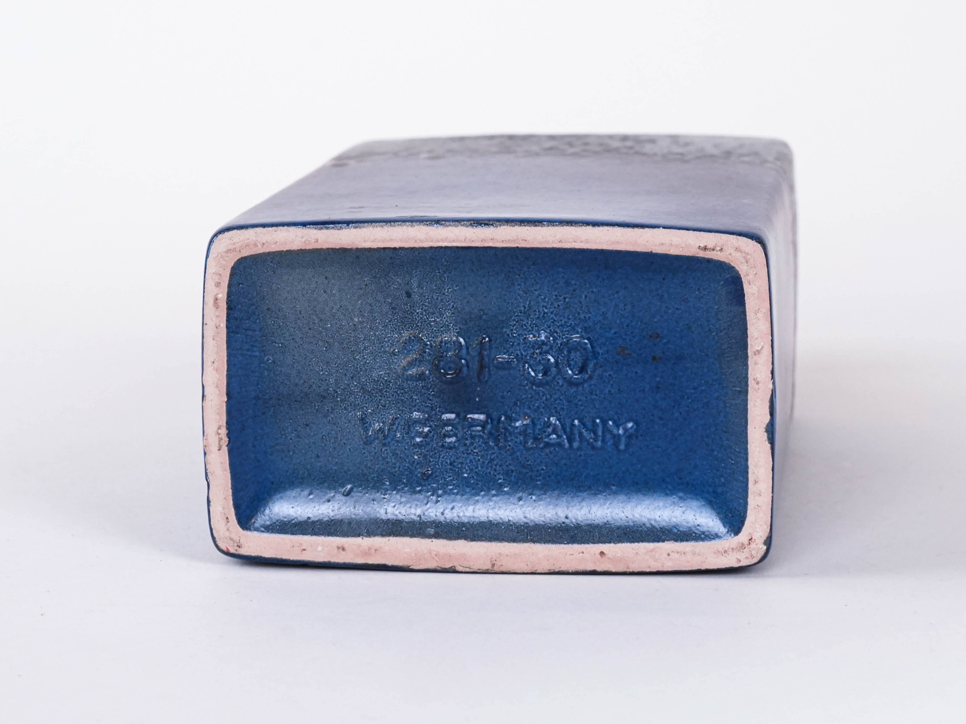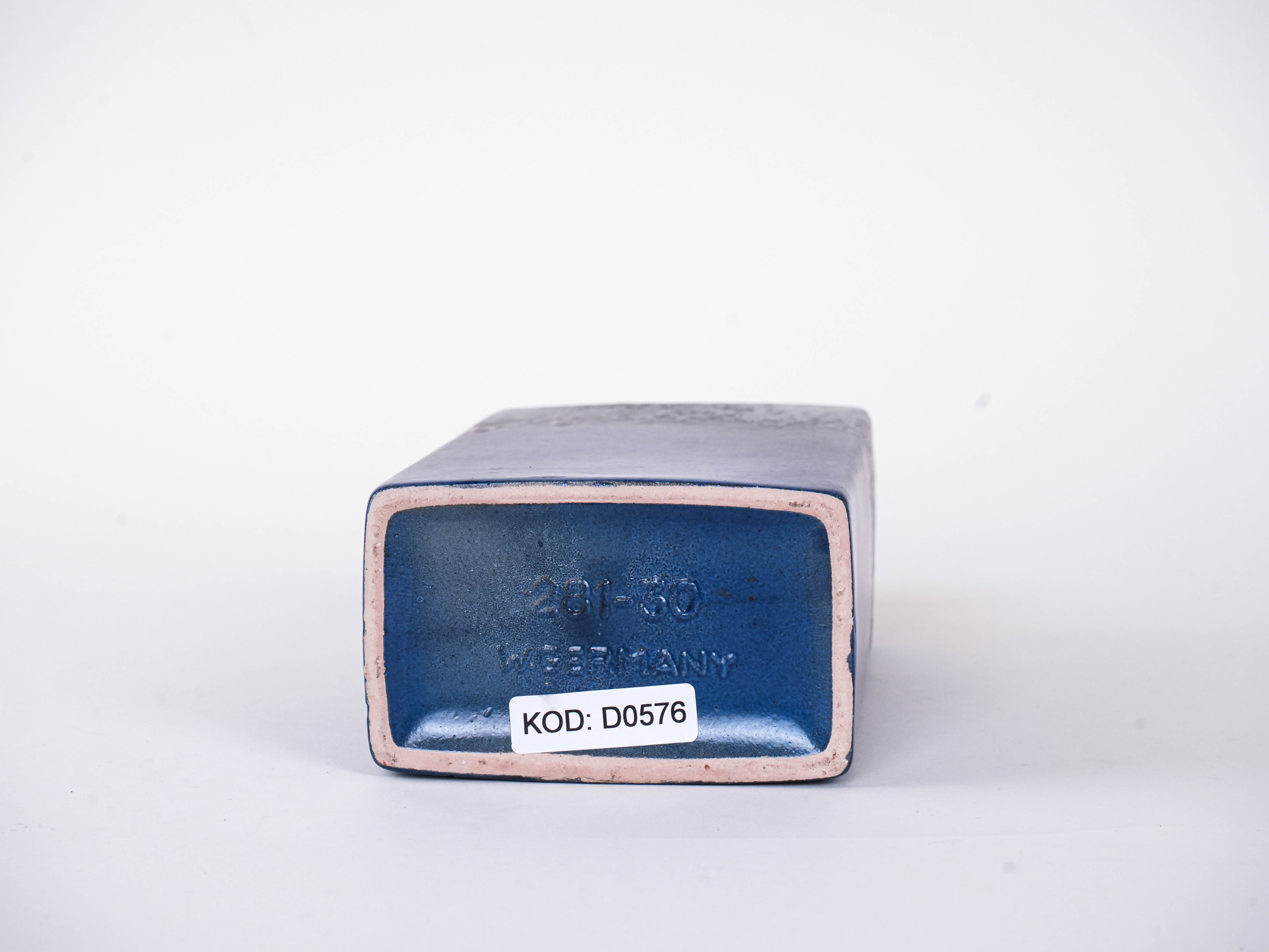 A ceramic vase in a geometric, rectangular shape with a distinctive drip glaze. The deep cobalt hue transitioning into light, lava-like drips lends it elegance and a unique character. An iconic example of mid-century German design, which works perfectly both as a standalone piece and when paired with other Fat Lava items.