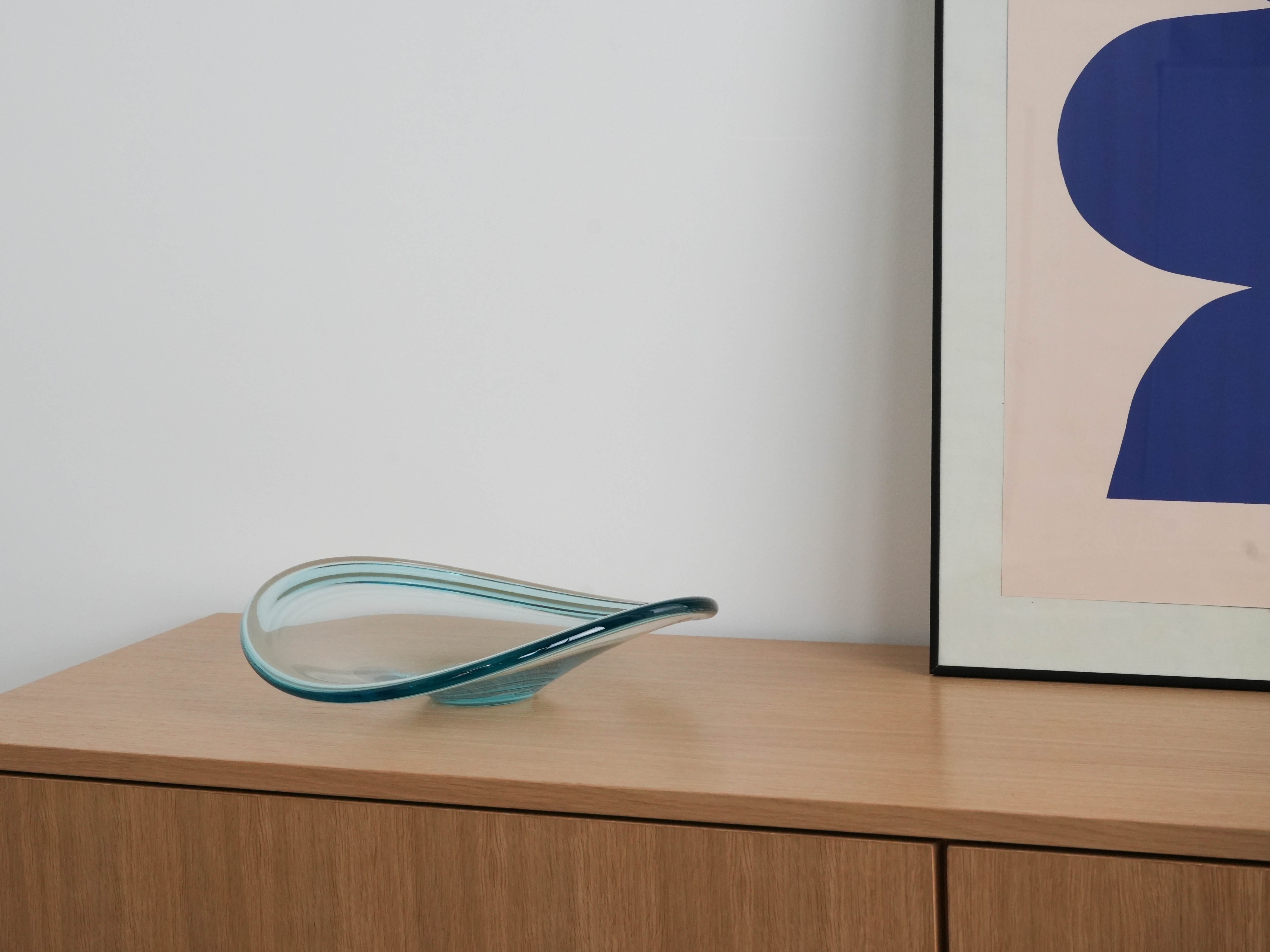 A large, hand-formed crystal platter with an organic, fluid shape. A minimalist yet extremely elegant form typical of Danish modernism of the 1960s. Subtle refractions of light and a slightly bluish tint of the glass add depth and a sculptural character. A timeless example of Scandinavian design that works well as both a decorative and functional item.