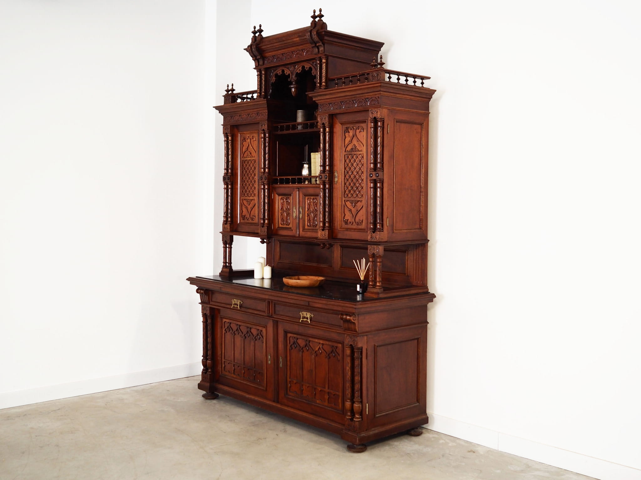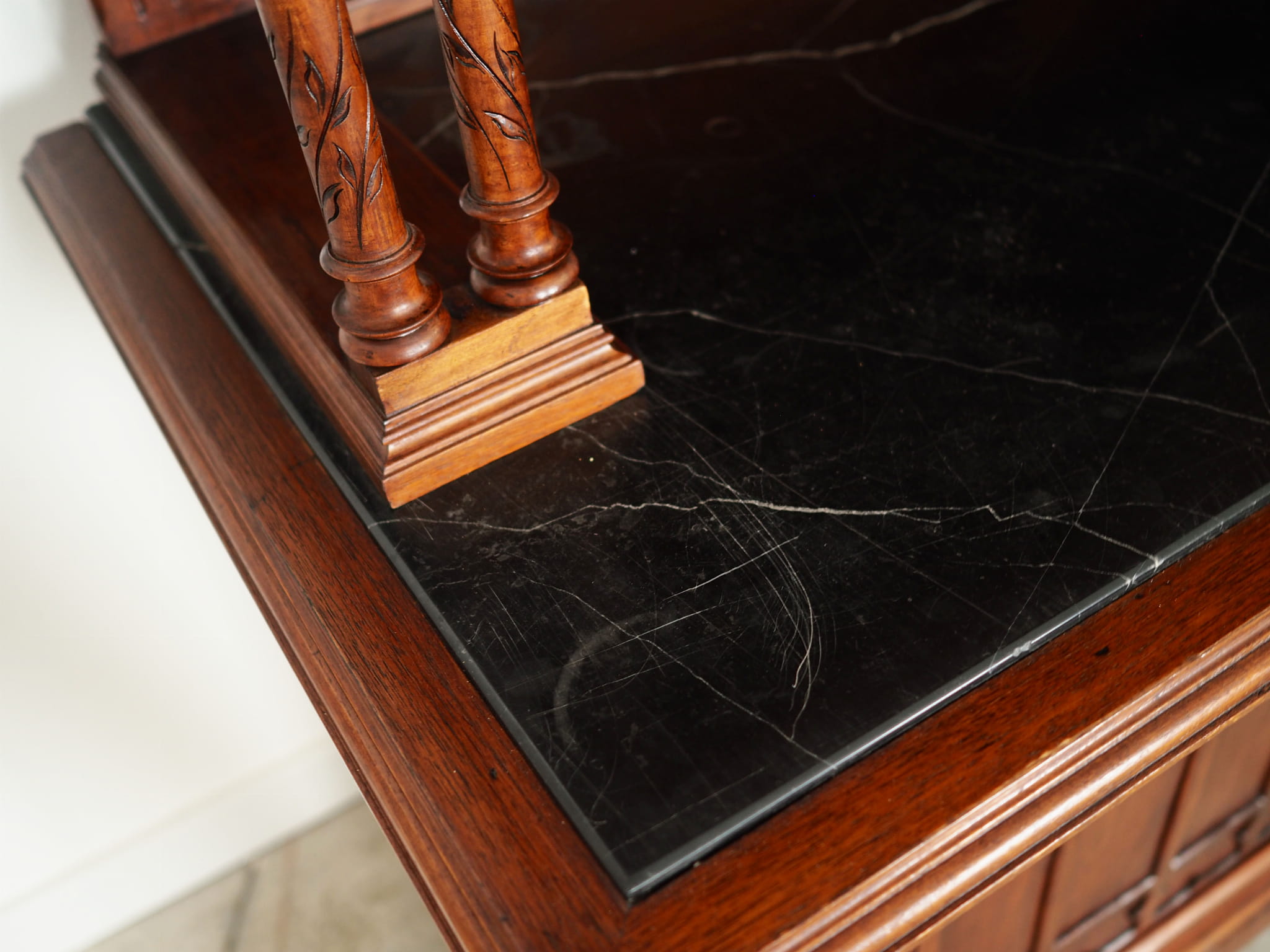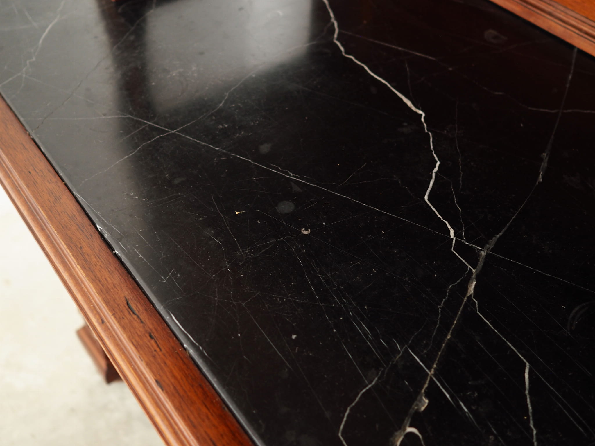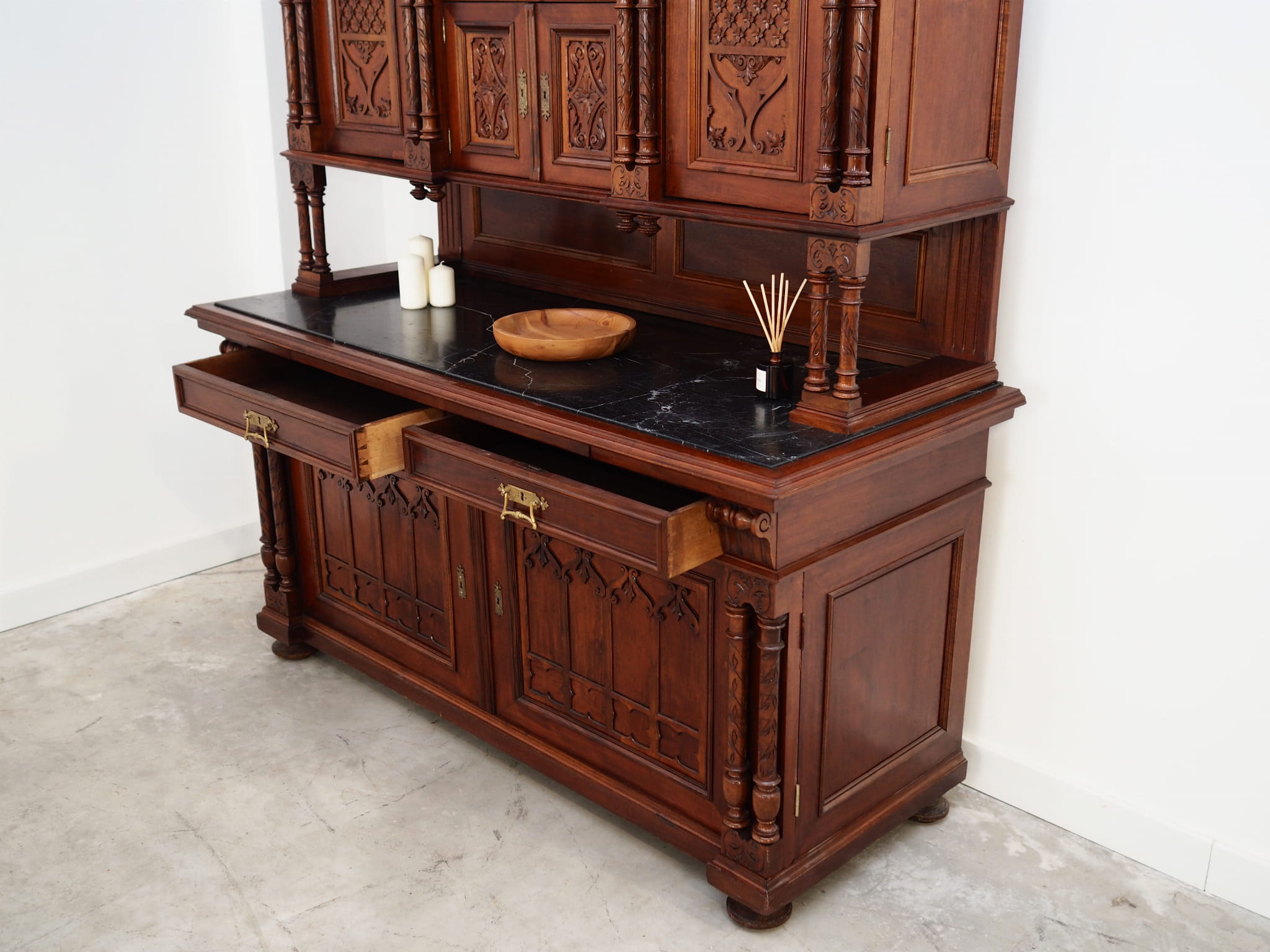 The structure is made of solid oak wood. The top was made of marble. The surface has been refreshed. Inside the space has been filled with two practical drawers and capacious cabinets. The cabinets feature non-adjustable shelves. The cupboard with the classic solution of opening doors, thanks to which we have free access to the entire interior of the furniture. Key included, not all locks are functional.