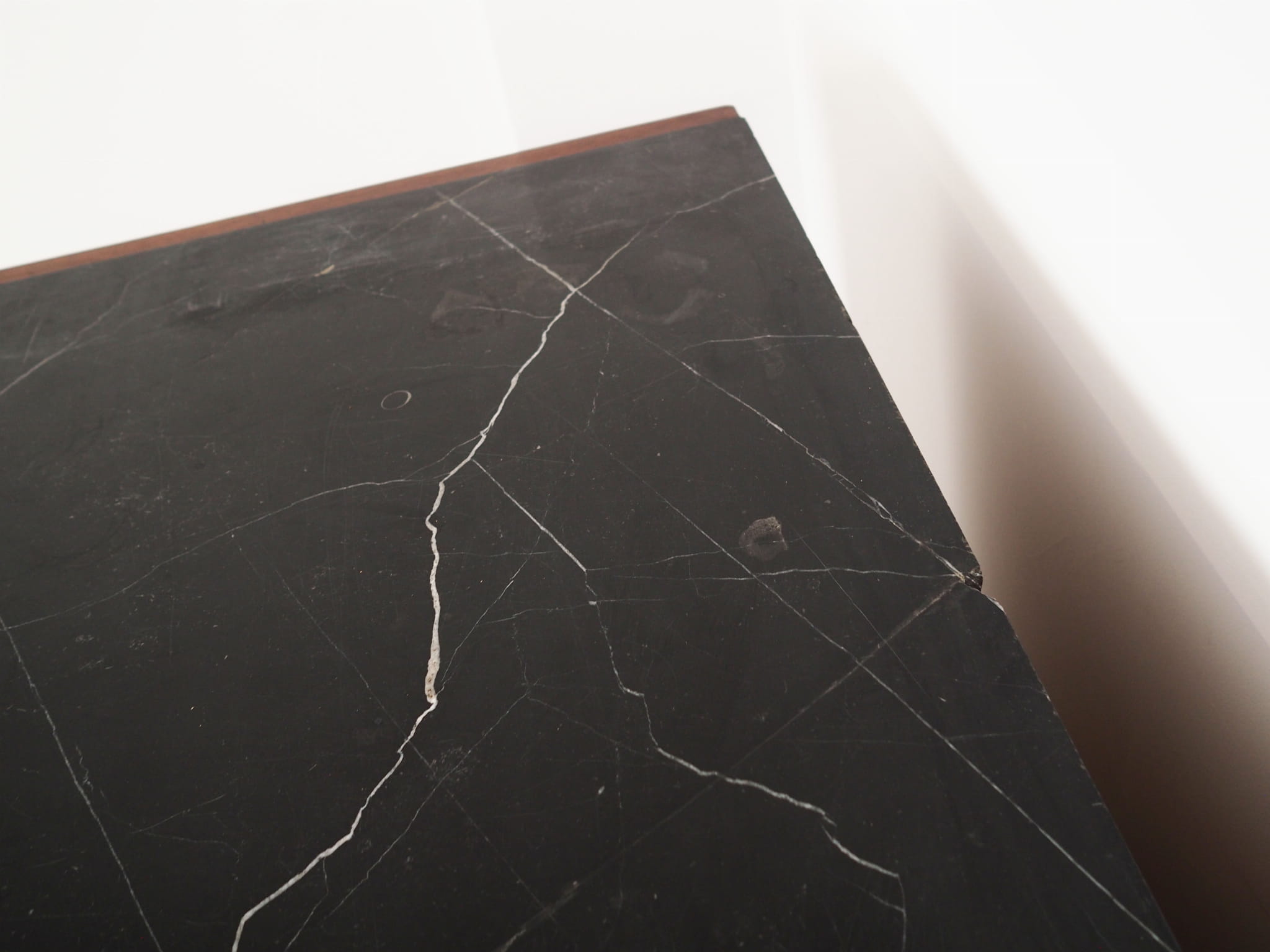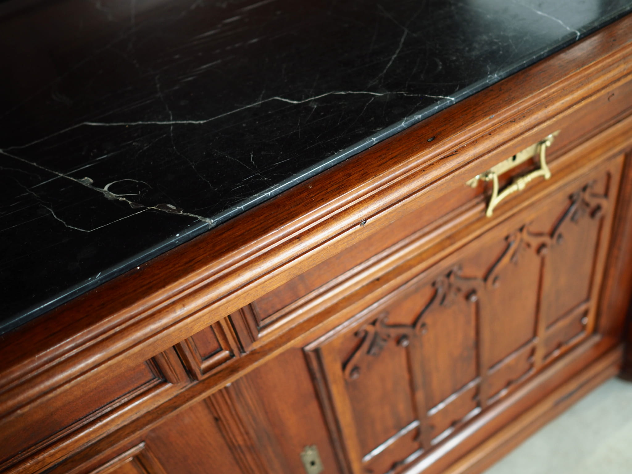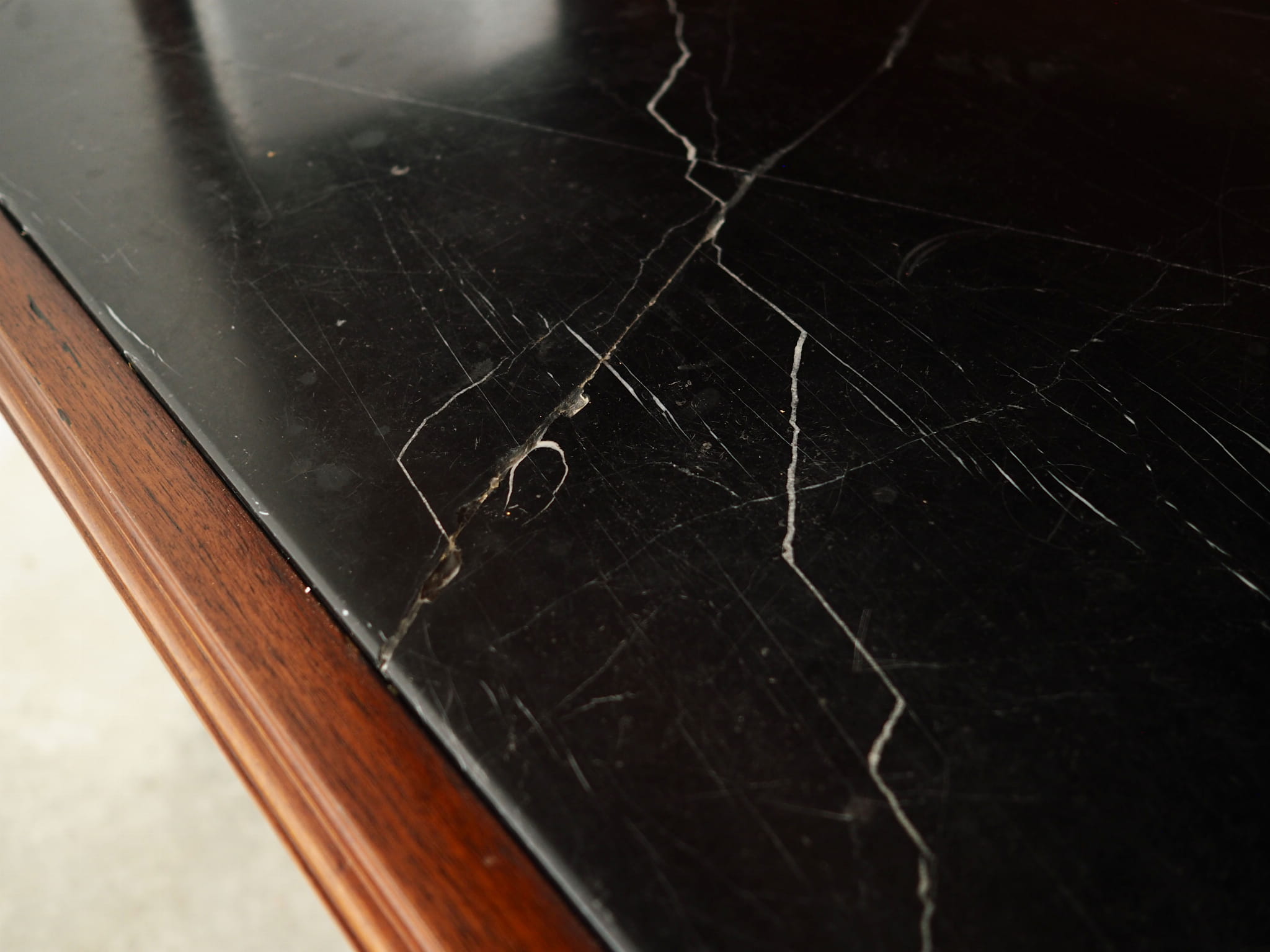 The structure is made of solid oak wood. The top was made of marble. The surface has been refreshed. Inside the space has been filled with two practical drawers and capacious cabinets. The cabinets feature non-adjustable shelves. The cupboard with the classic solution of opening doors, thanks to which we have free access to the entire interior of the furniture. Key included, not all locks are functional.