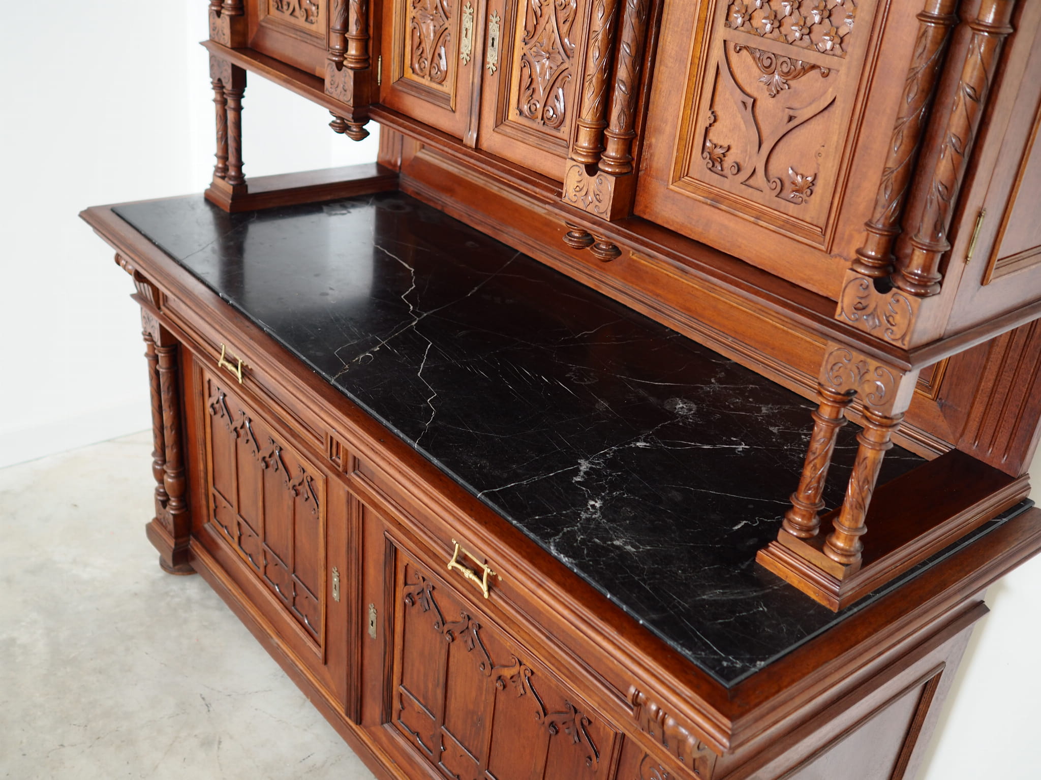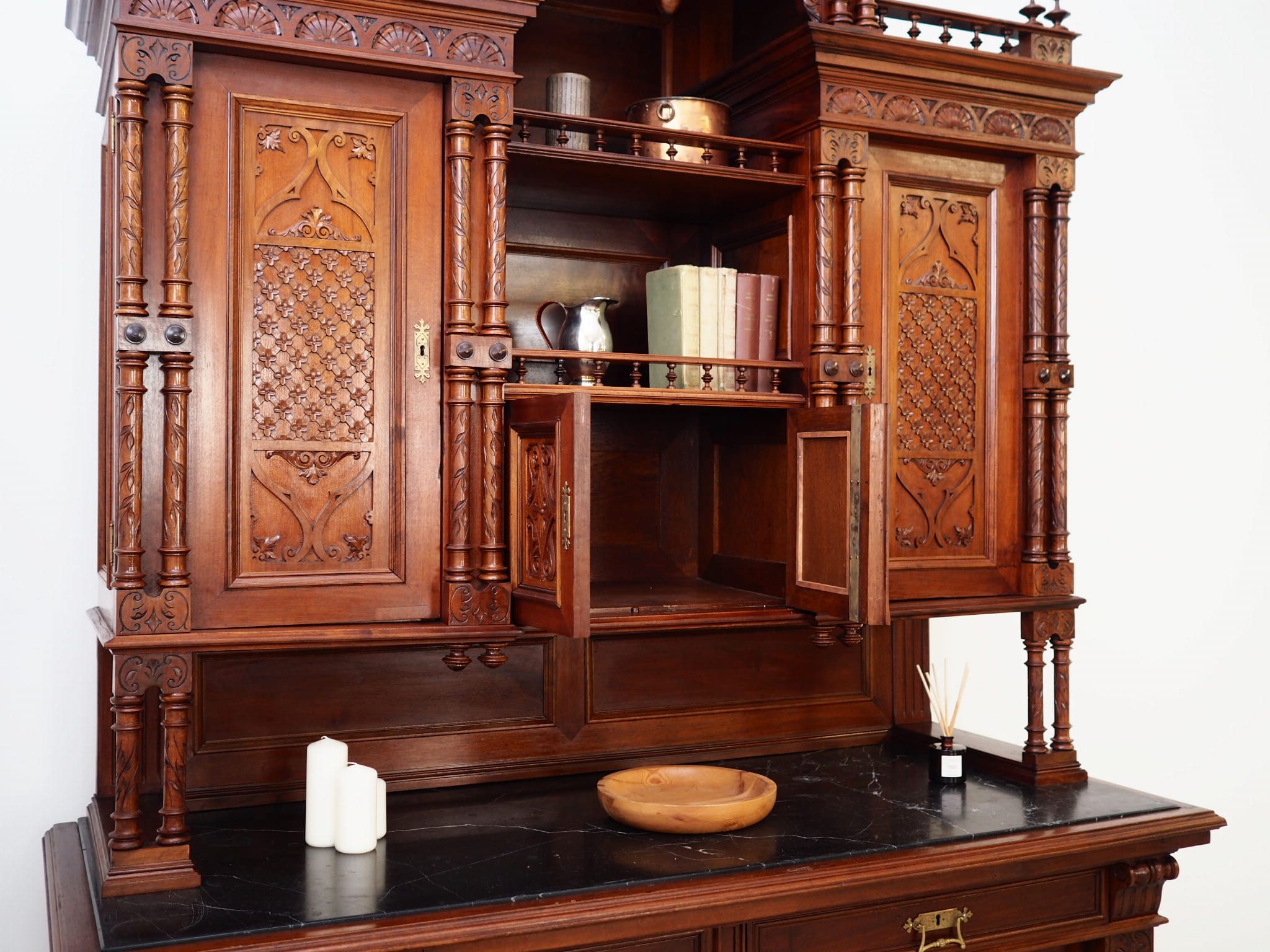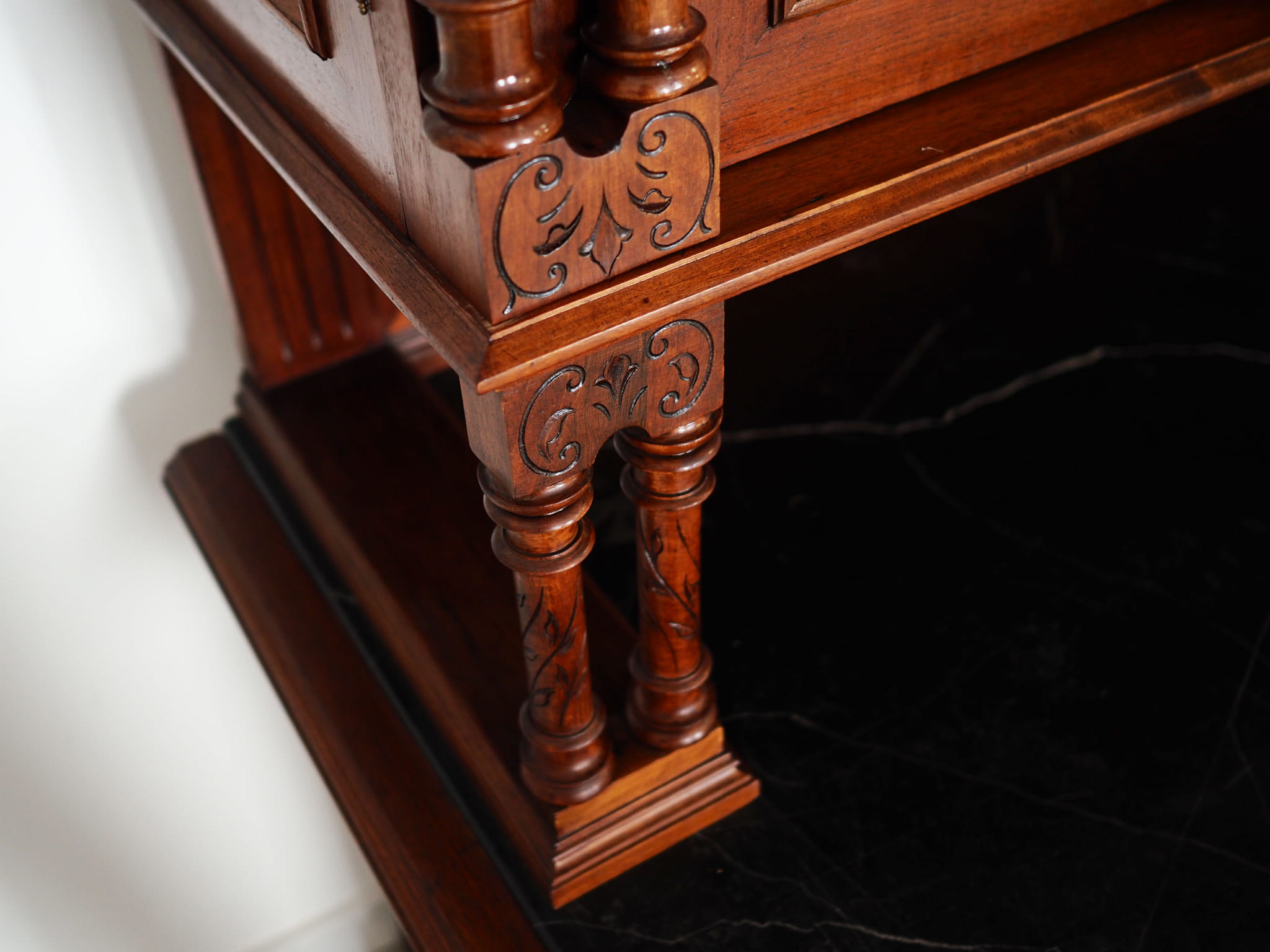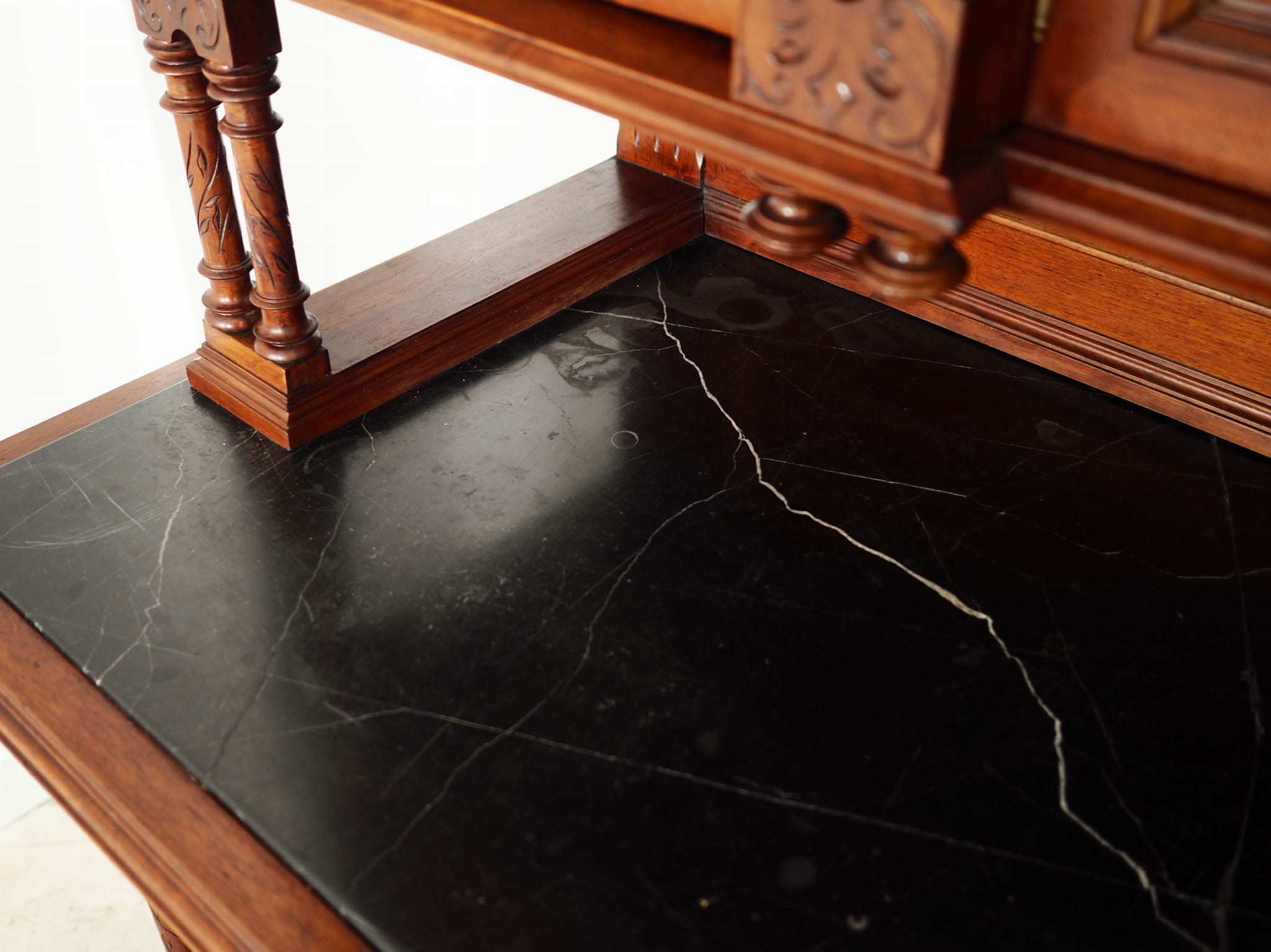 The structure is made of solid oak wood. The top was made of marble. The surface has been refreshed. Inside the space has been filled with two practical drawers and capacious cabinets. The cabinets feature non-adjustable shelves. The cupboard with the classic solution of opening doors, thanks to which we have free access to the entire interior of the furniture. Key included, not all locks are functional.