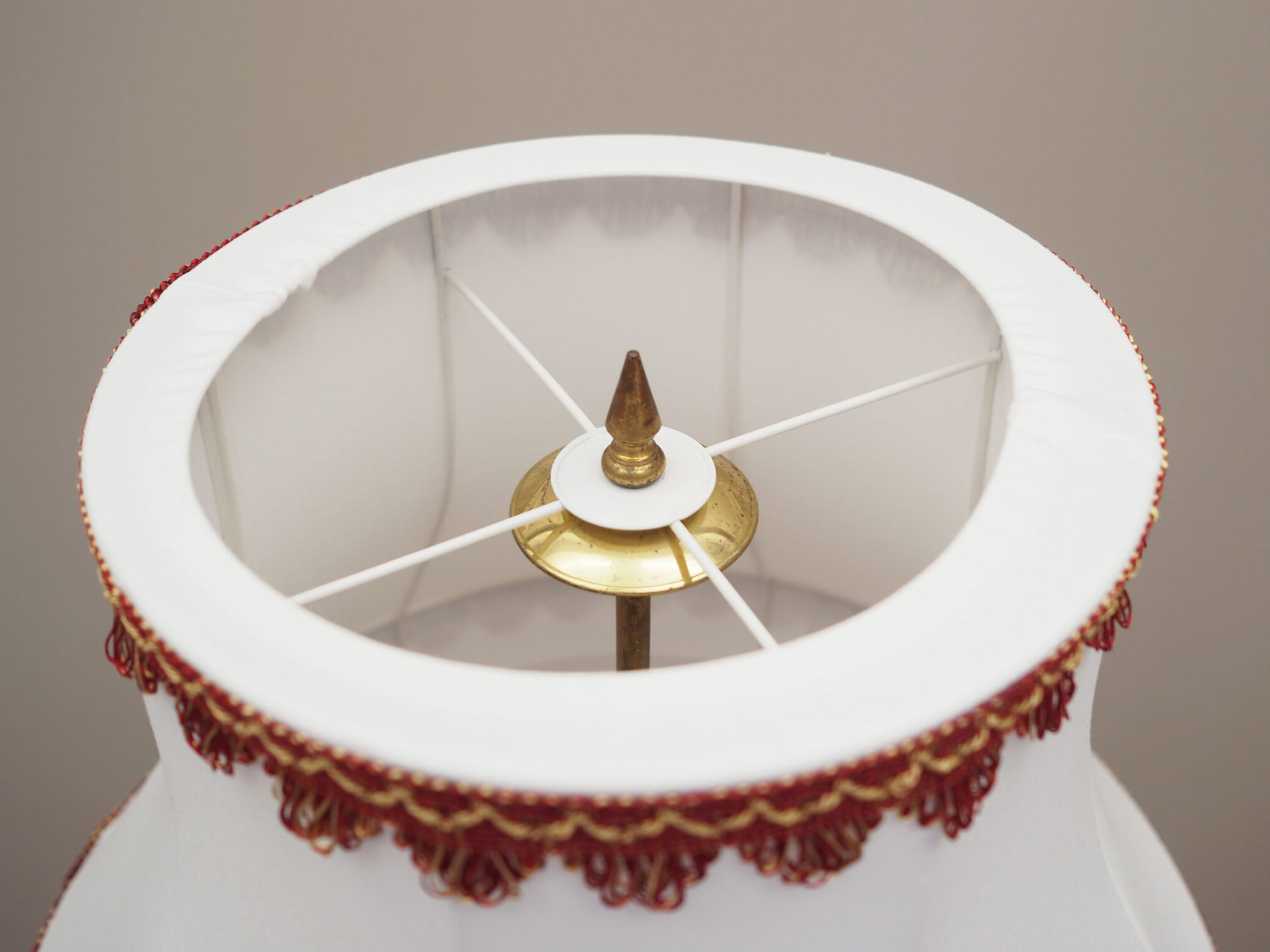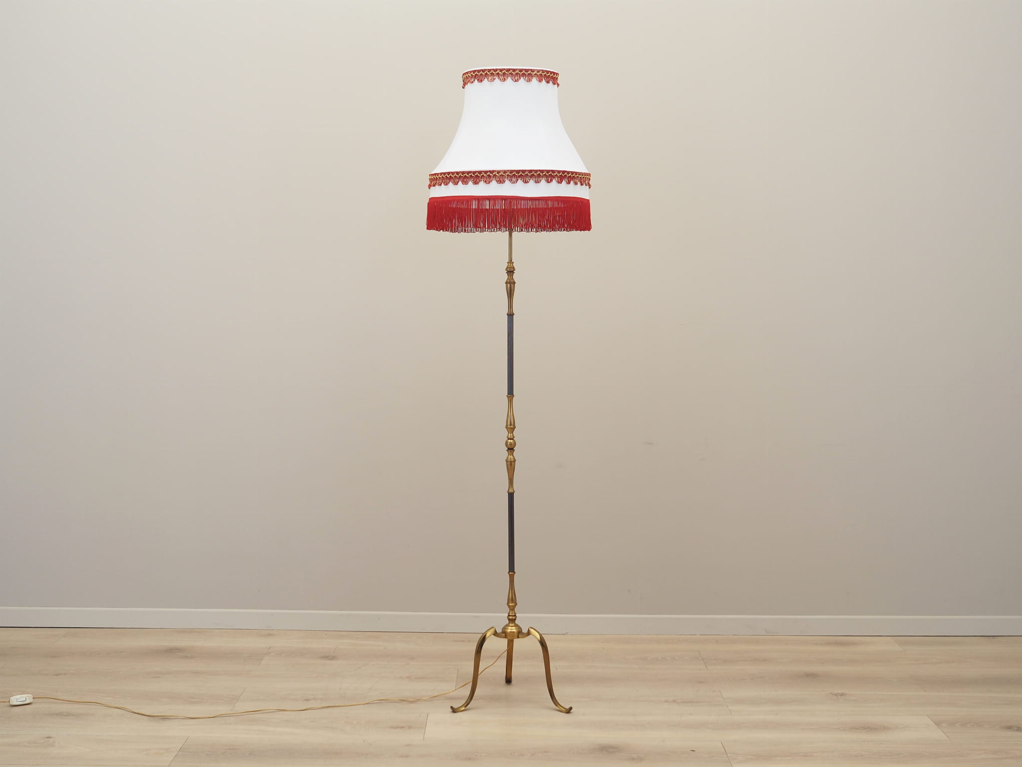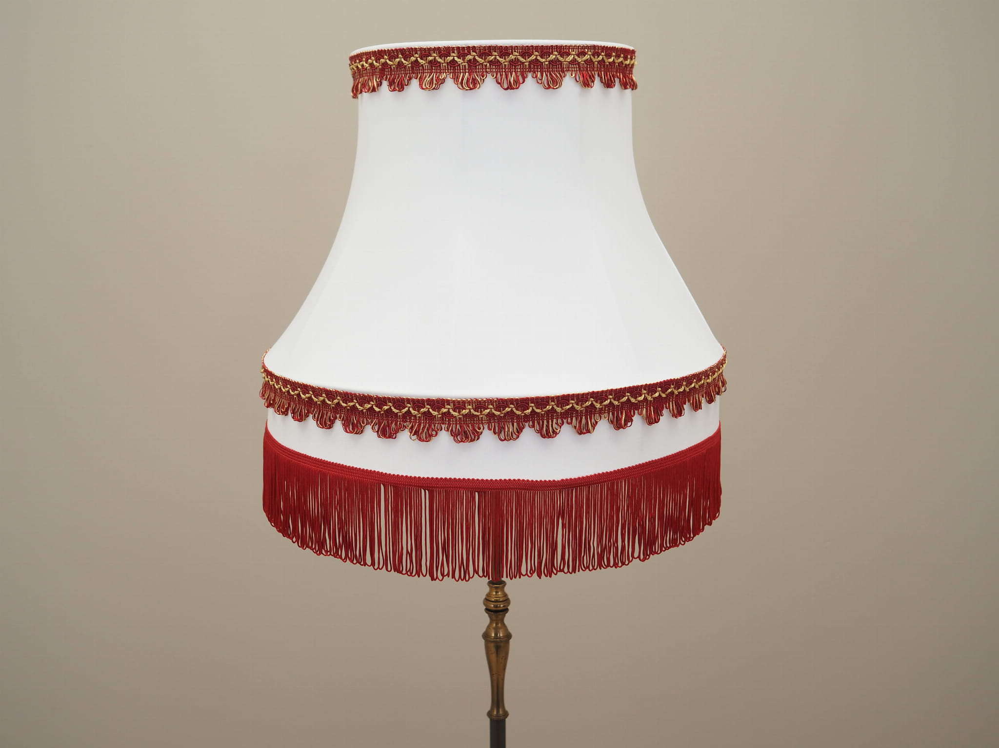 Made of brass. The lampshade is covered with fabric in gold, white and red colours.