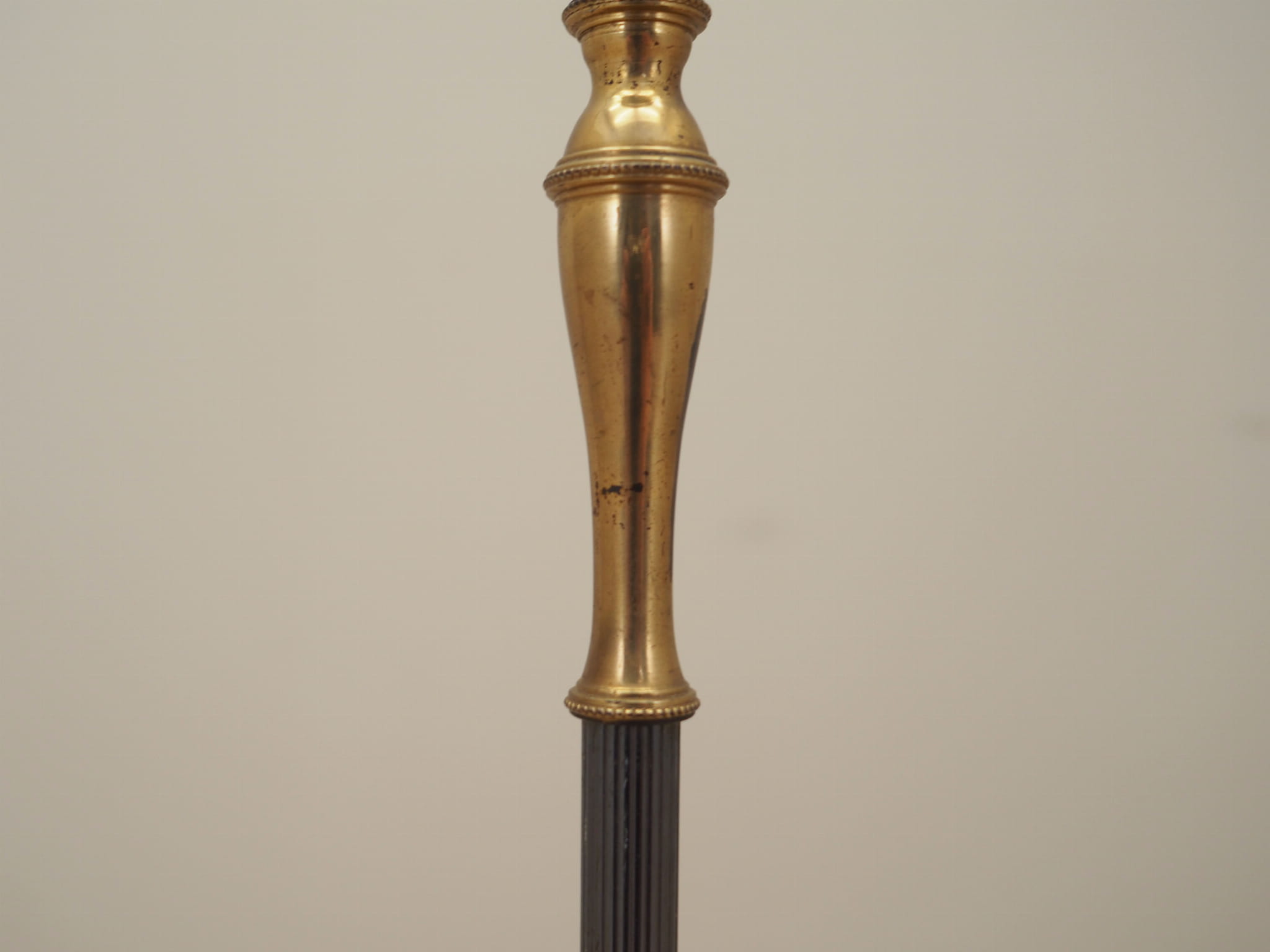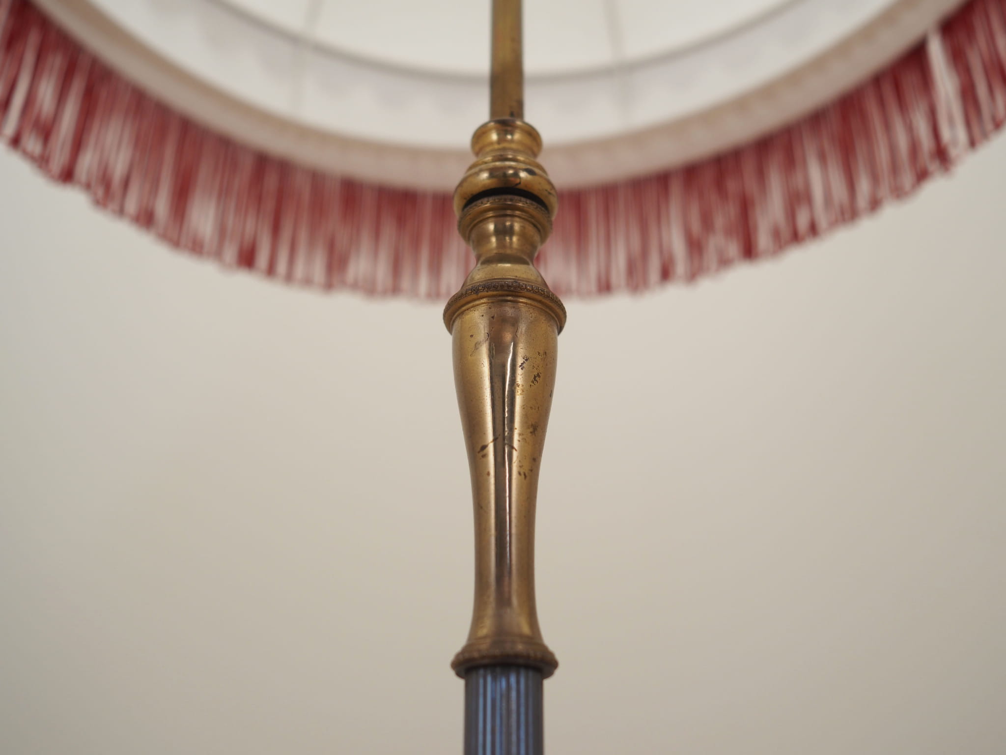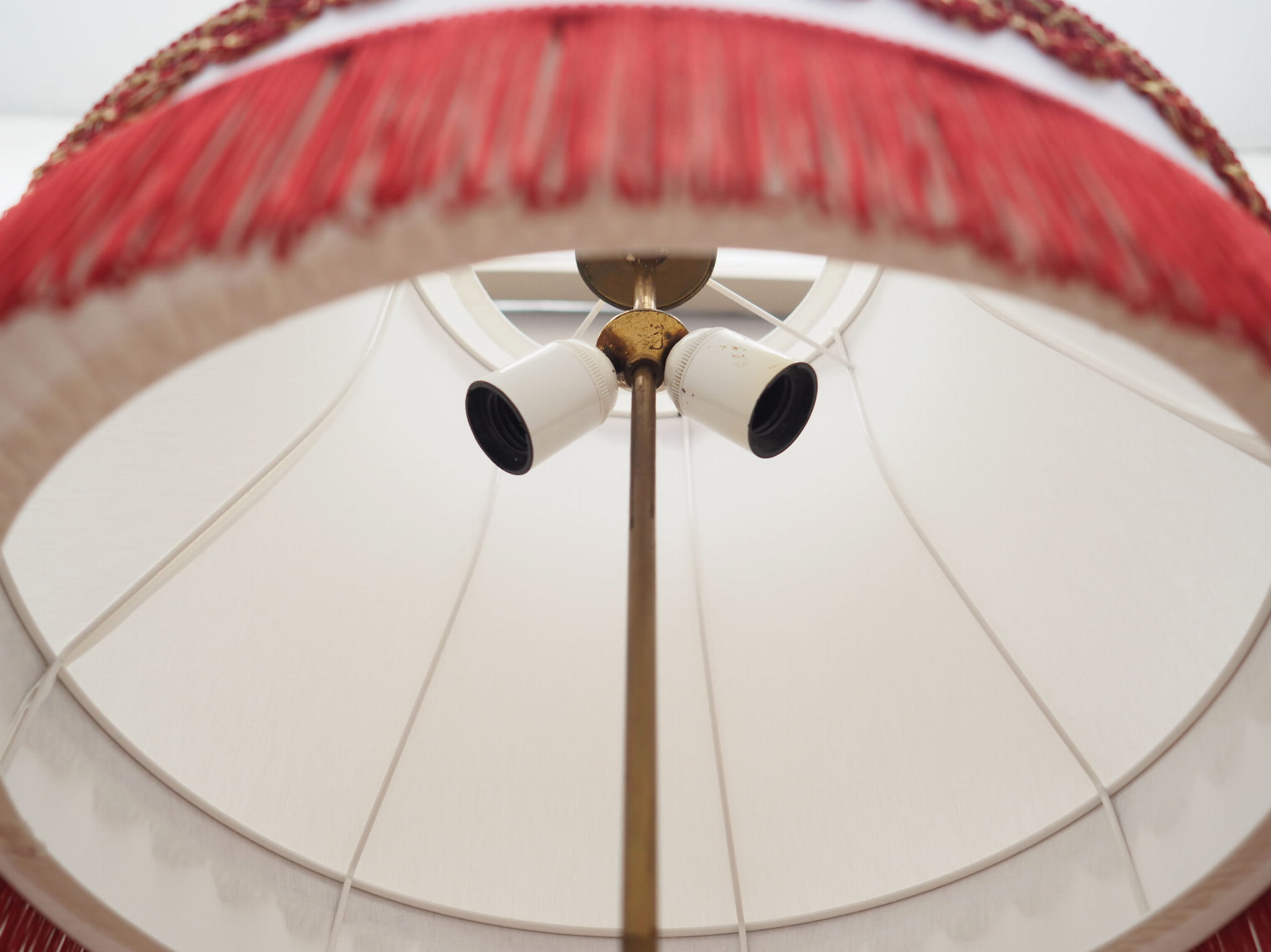Made of brass. The lampshade is covered with fabric in gold, white and red colours.