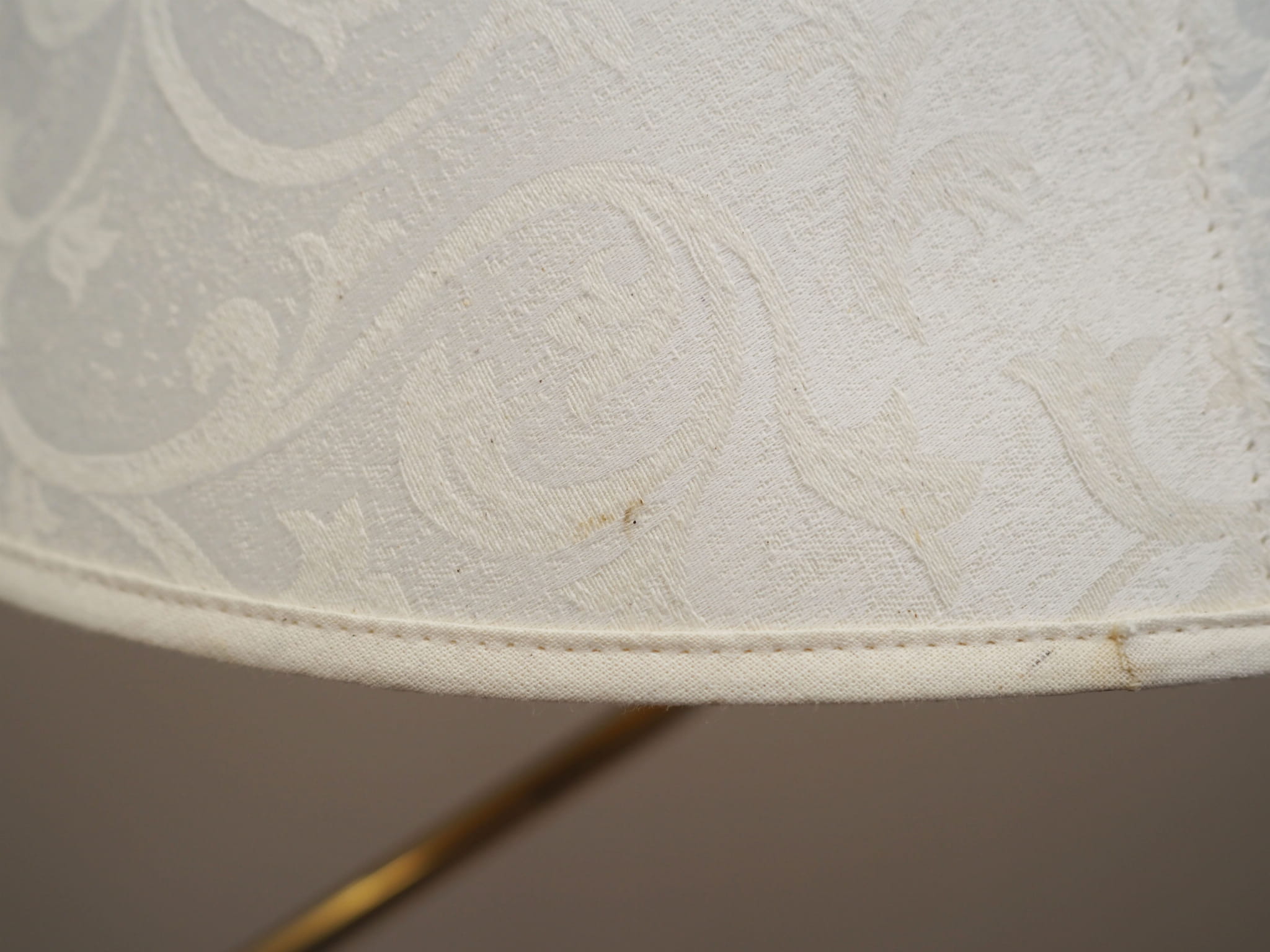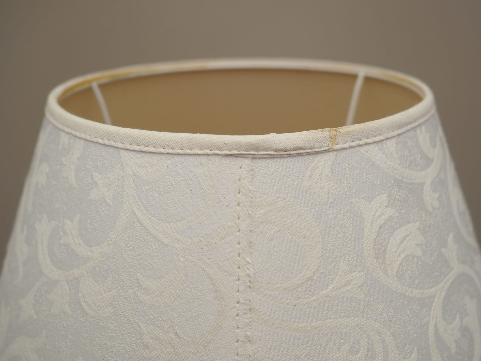Made of metal. The lampshade is covered with fabric in white.