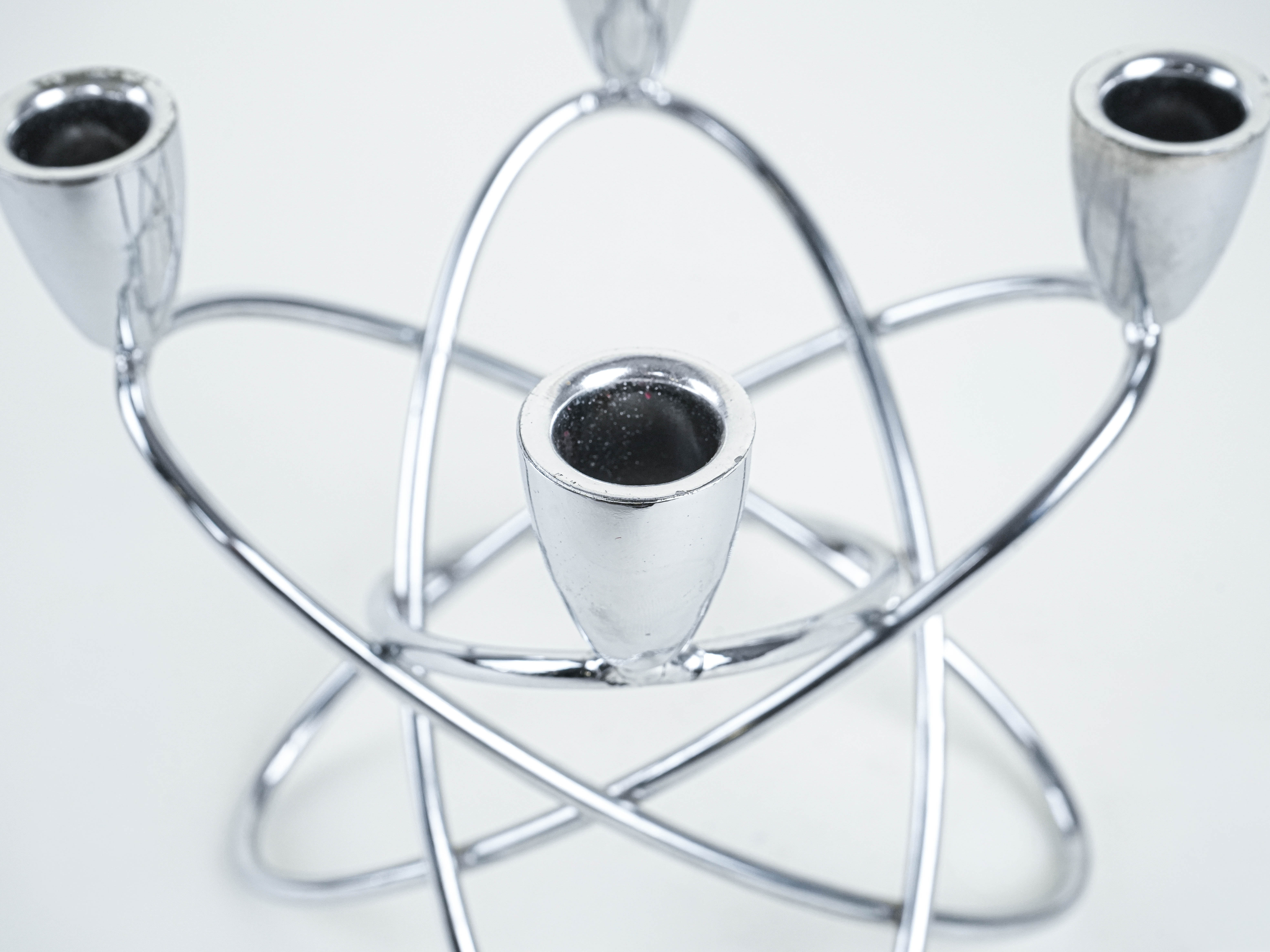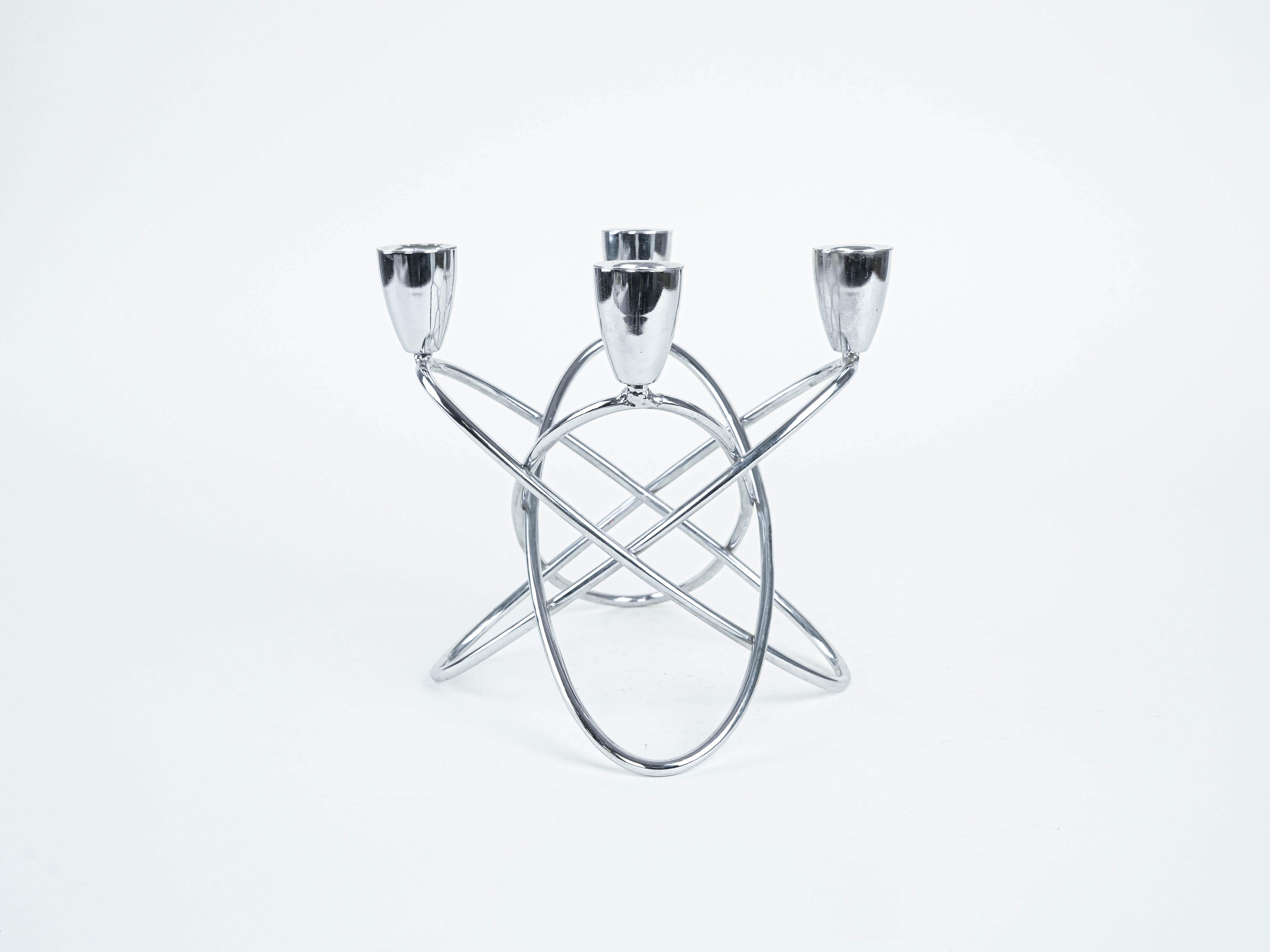 A geometric candlestick from the mid-20th century, crafted from chrome-plated metal. Its minimalist, sculptural form in the modernist style makes it look great both as a decorative piece and as a functional element of interior design. Ideal for vintage, mid-century or contemporary interiors.