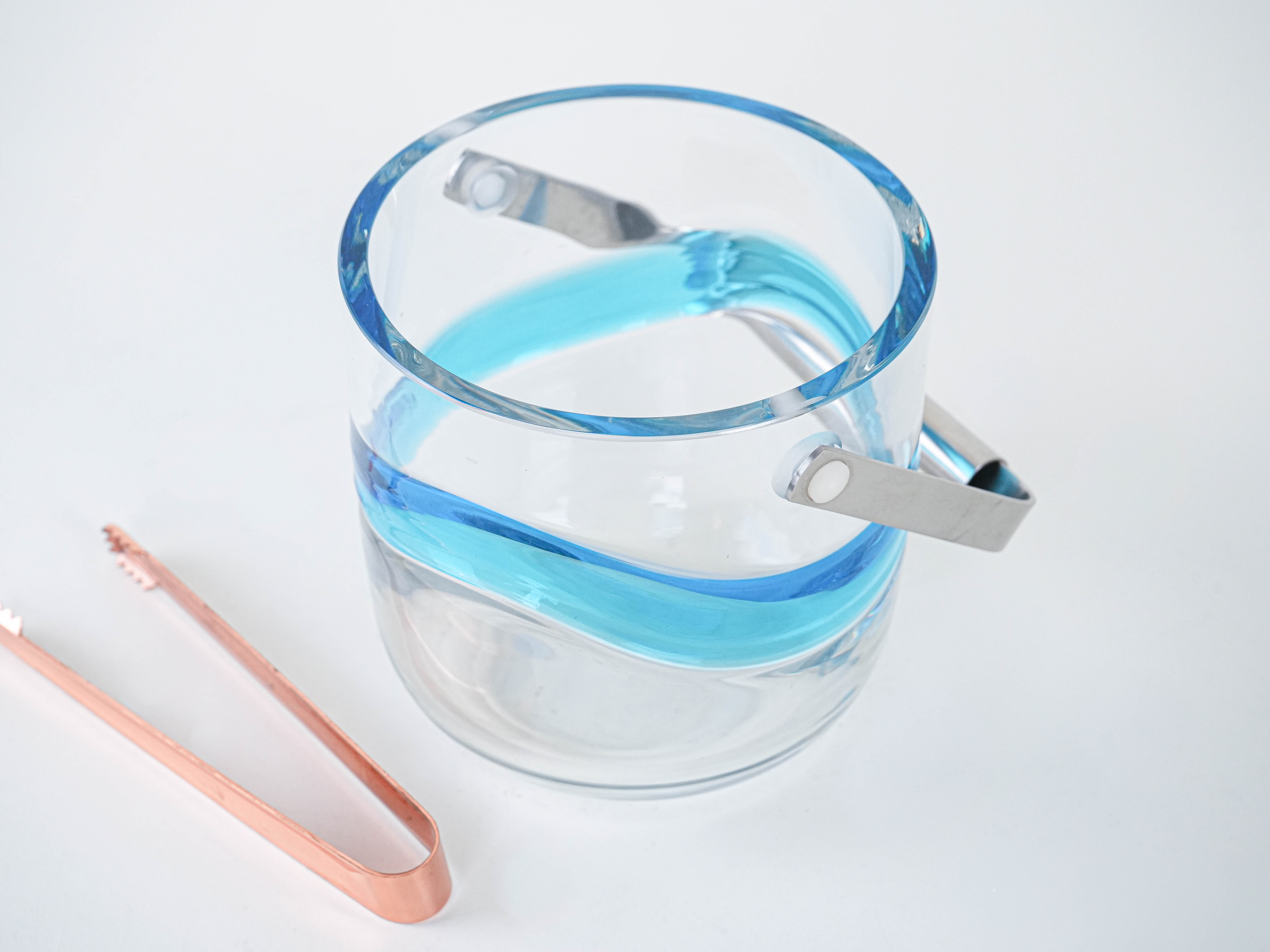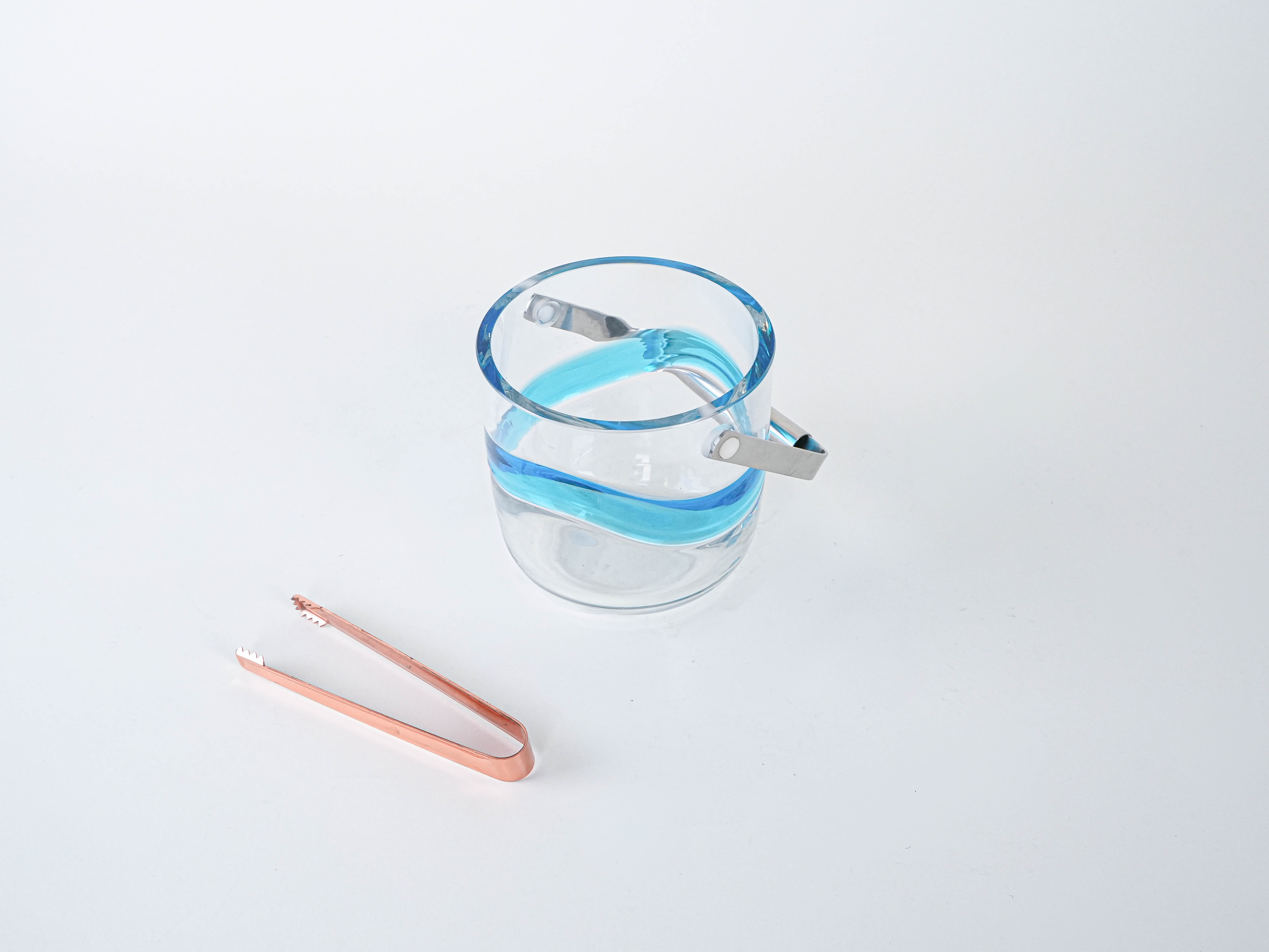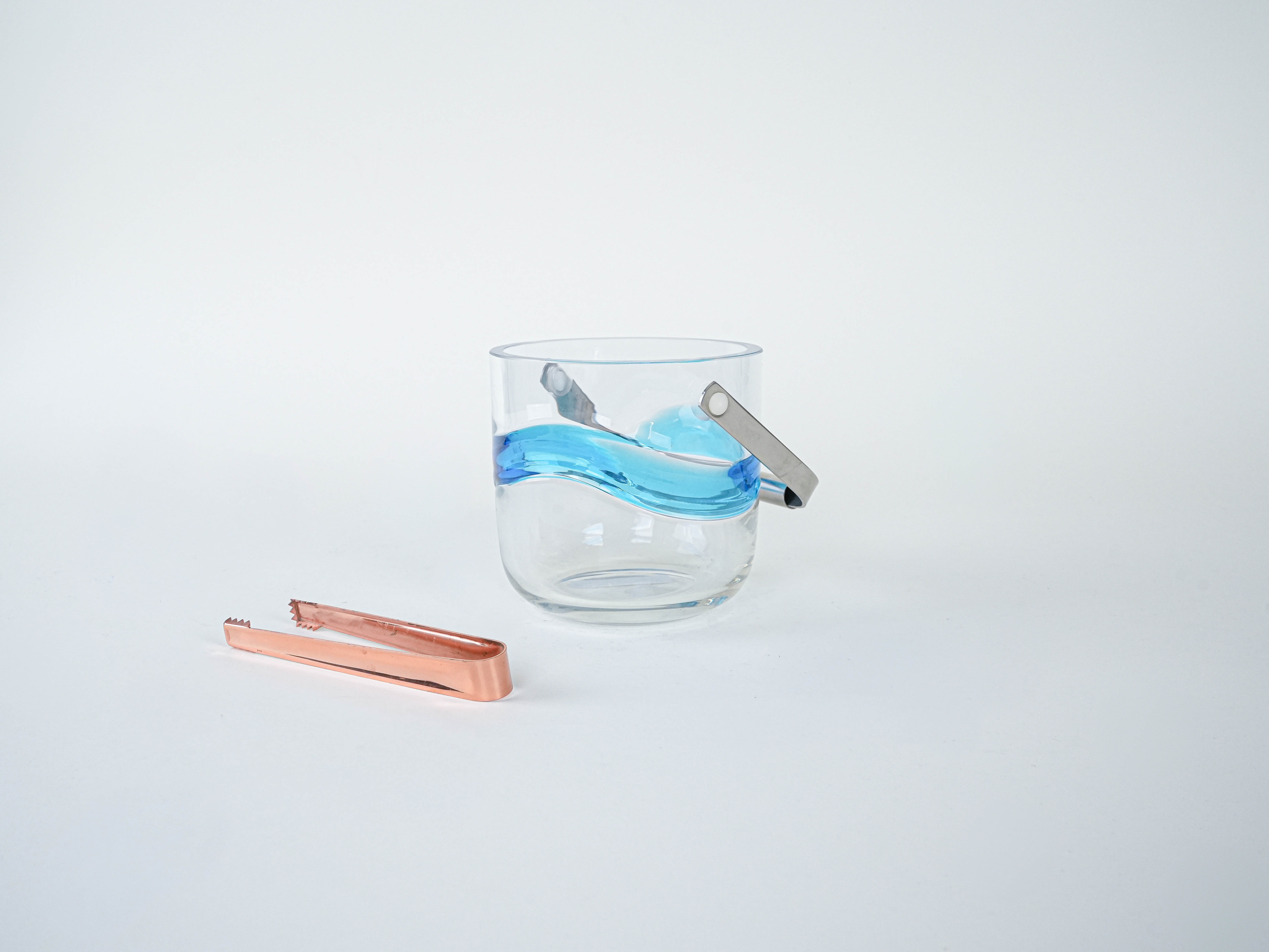 An elegant ice bucket from the Danish manufacturer Holmegaard—a classic of Scandinavian bar design from the 1960s and 1970s. The minimalist form, crafted from thicker glass, is accented by a decorative, wavy blue band, giving the piece a distinctive, collector’s-worthy character. It is an example of design that combines functionality with premium aesthetics: perfect for serving ice at parties, in a home bar, or as a stylish display piece. The set also includes tongs, which emphasize the item’s complete, elegant character.