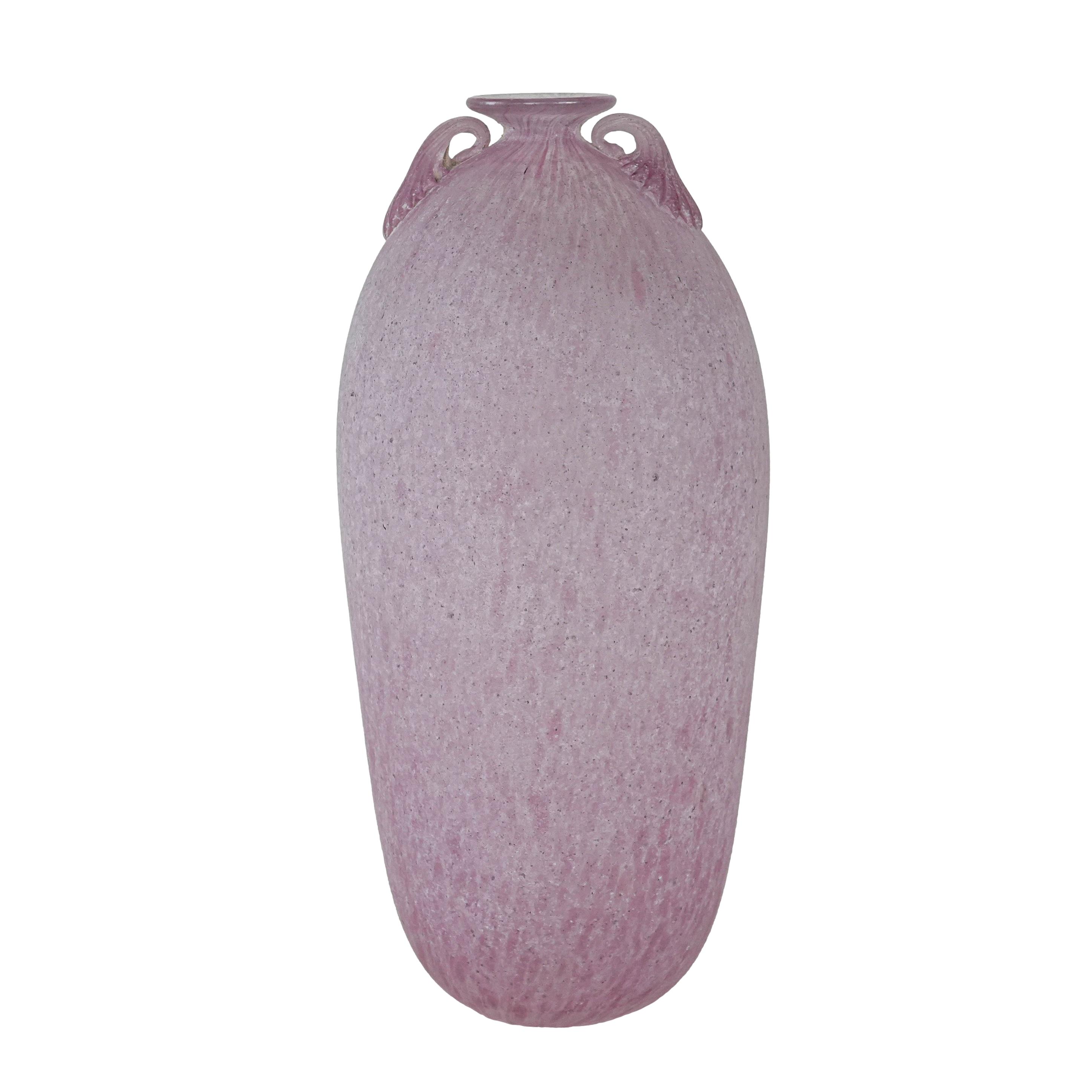 A handmade vase made of pink Murano glass with a matte, slightly porous texture and decorative handles in the form of stylised ears. Probably created in the 1970s–1980s, it delights with its subtle shade and unique frosting effect. A classic example of Italian craftsmanship from the island of Murano – perfect for collectors and lovers of vintage design.
