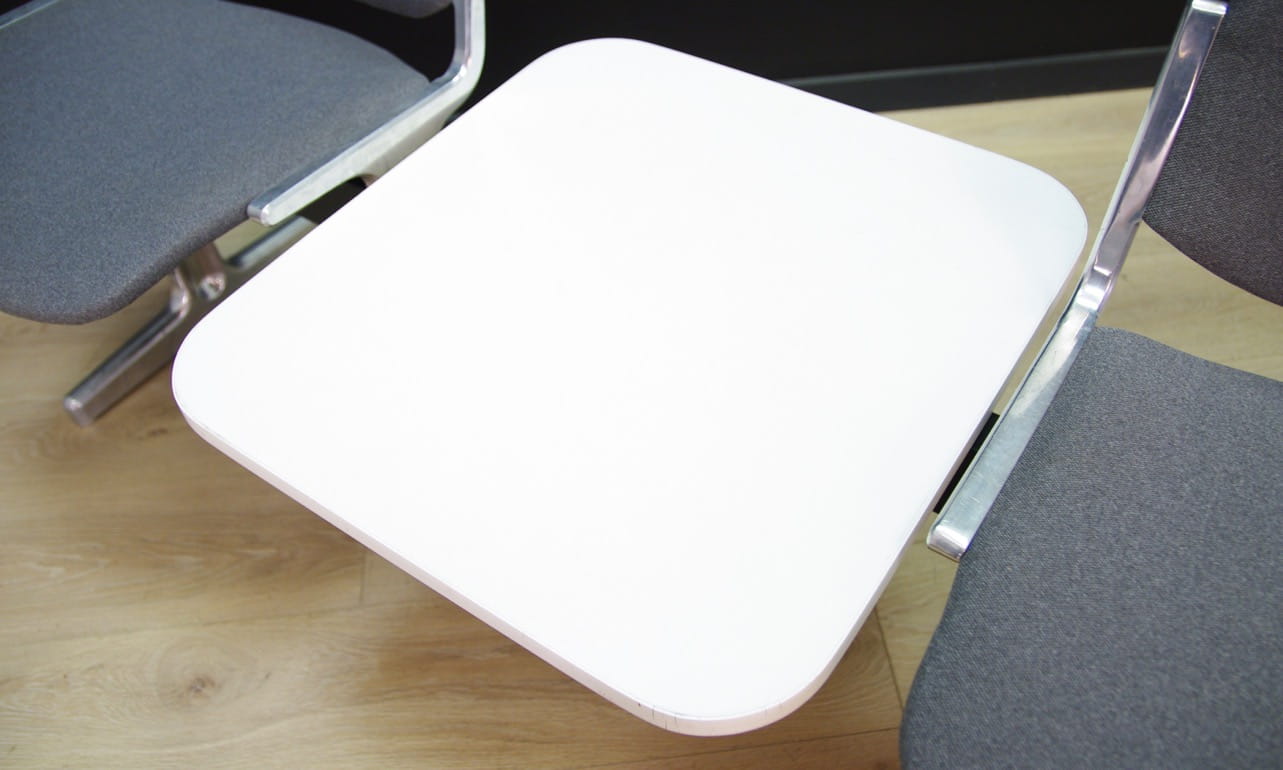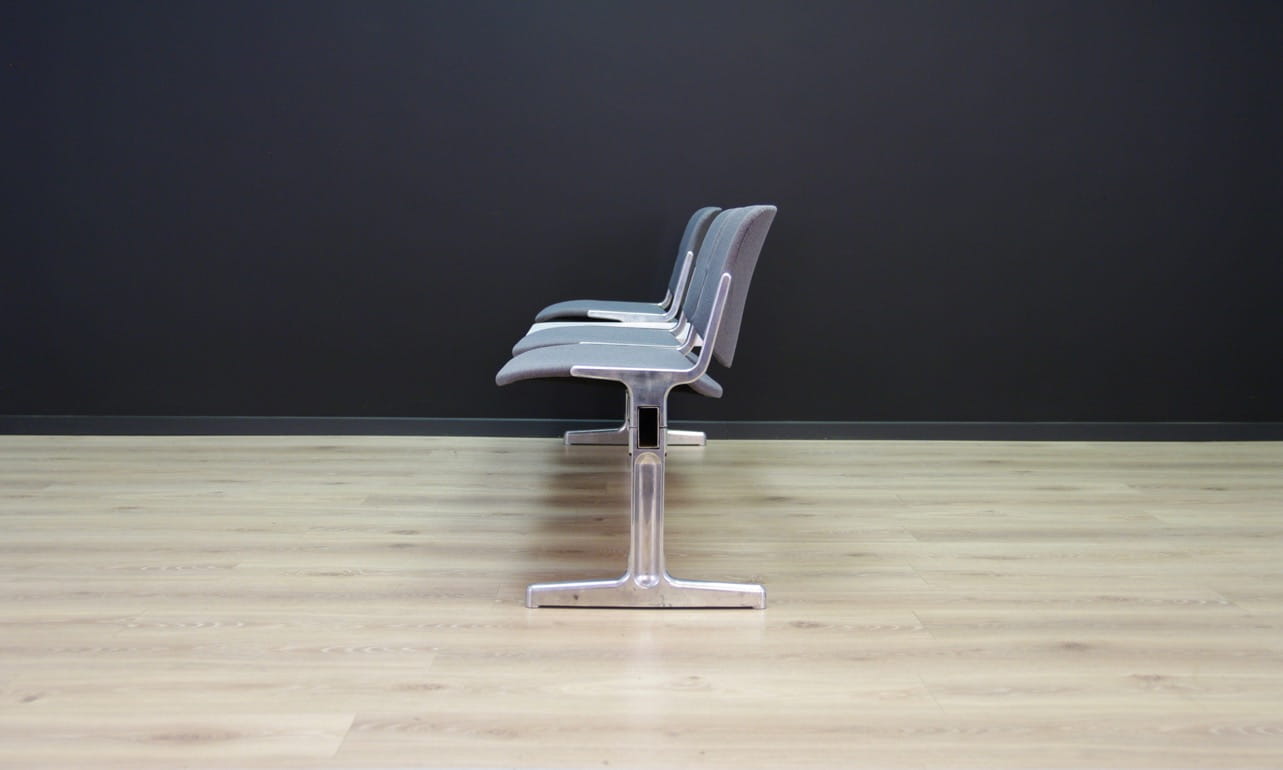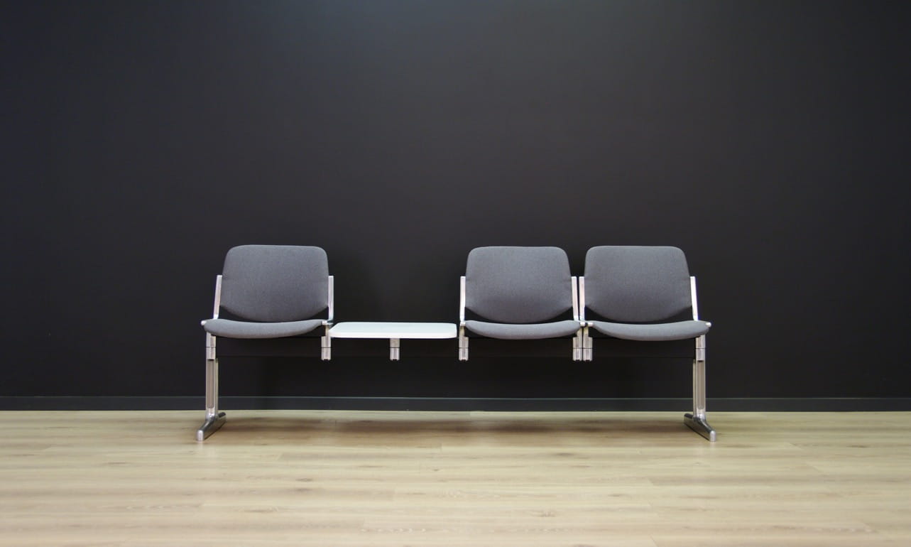 The structure is made of chrome-plated metal. The seats have been upholstered, the seat sponges and fabric replaced with new ones. The upholstery was made in grey, a high-quality fabric with a fine weave was used. An additional feature is the top in white. An ideal accessory for any retro-style waiting room.