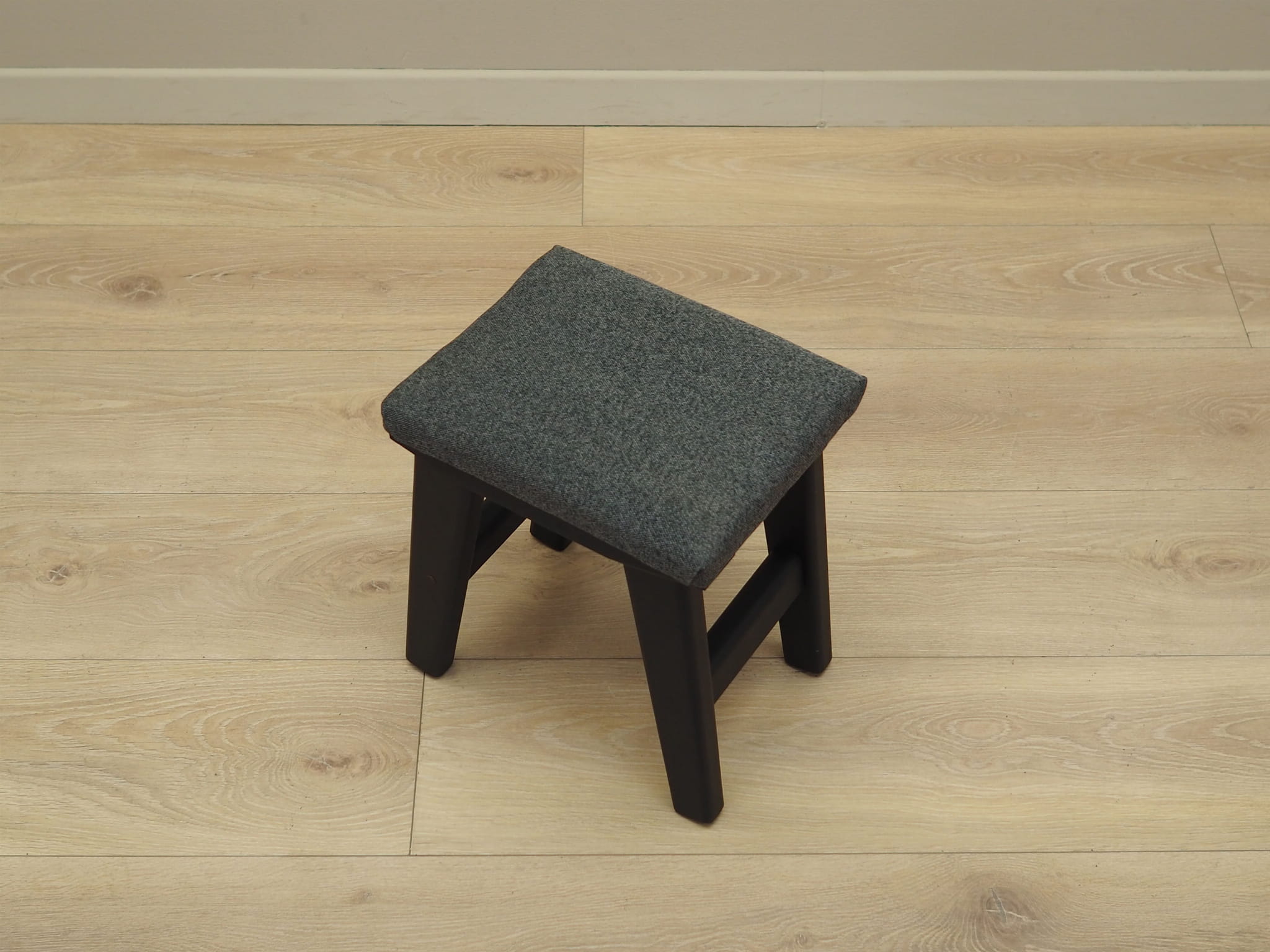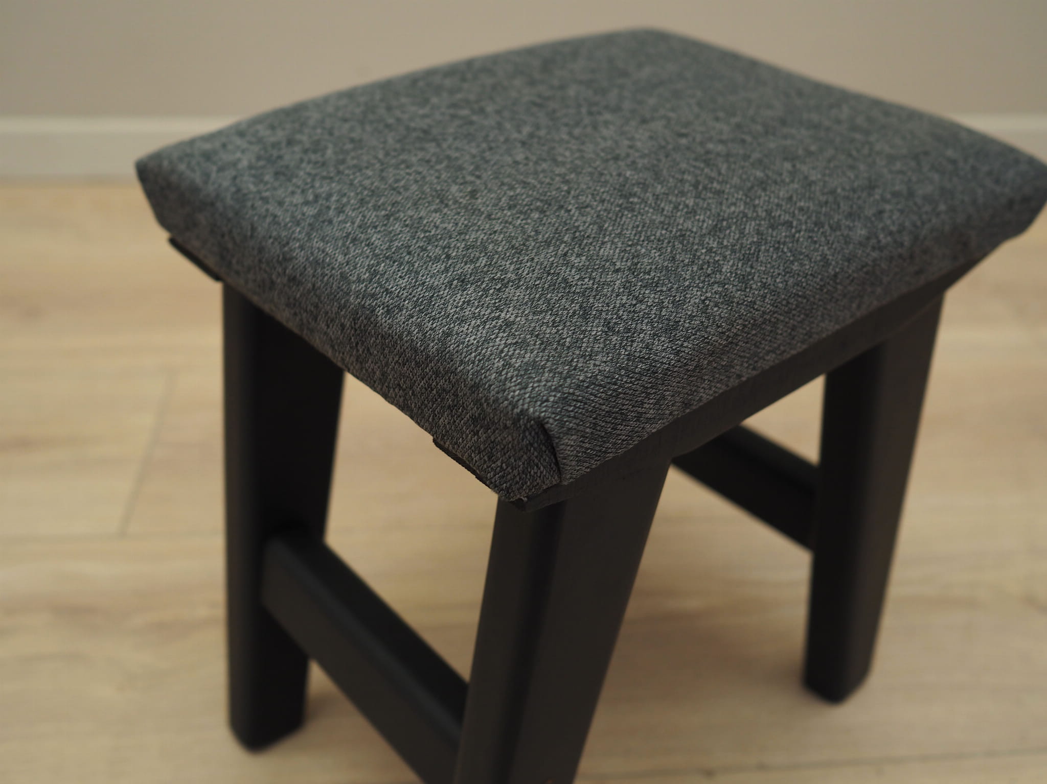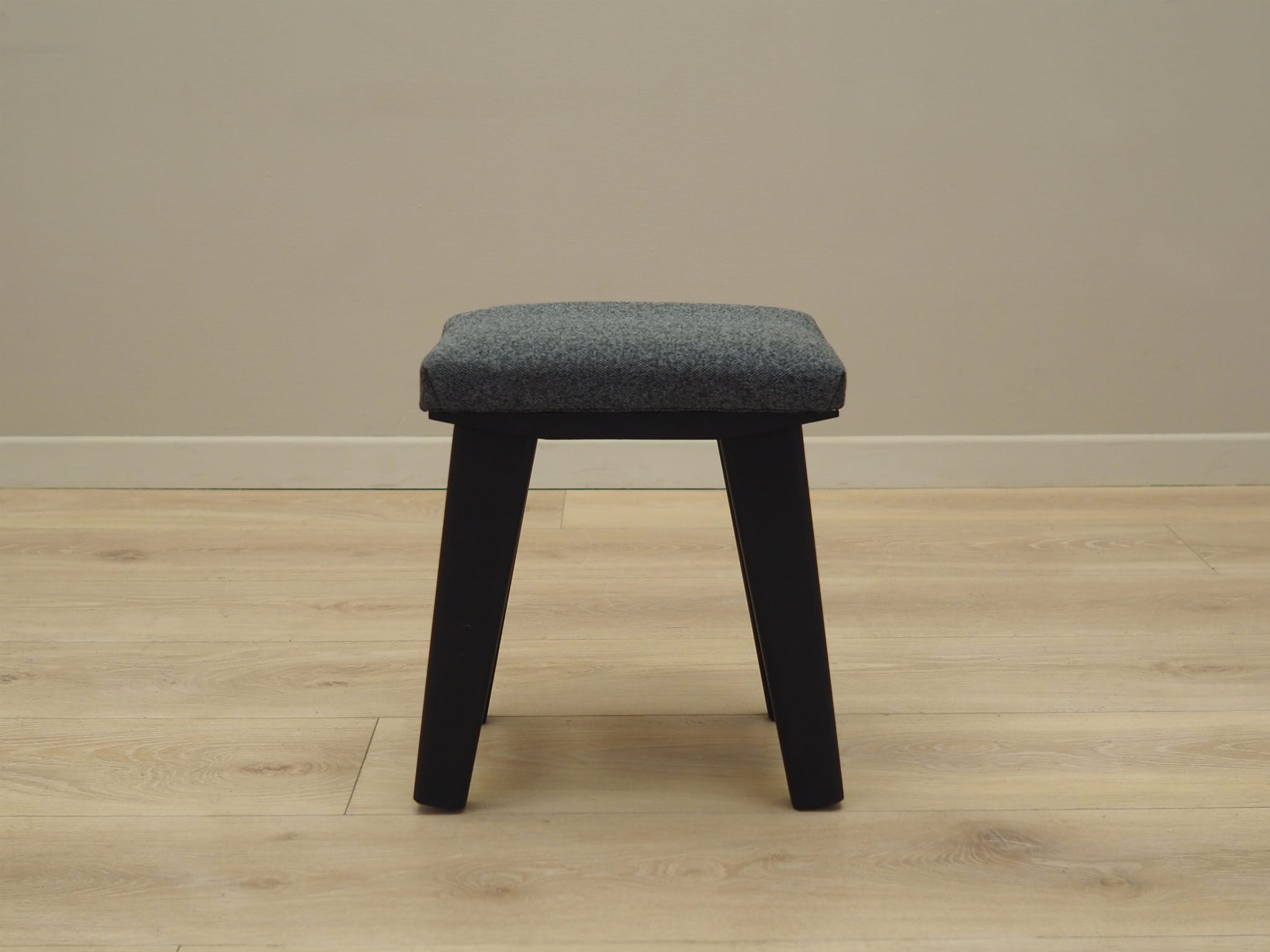 The seat has undergone upholstery restoration. The upholstery has been replaced with new upholstery. It was made in grey, high-quality fabric was used. The legs are made of wood stained black.