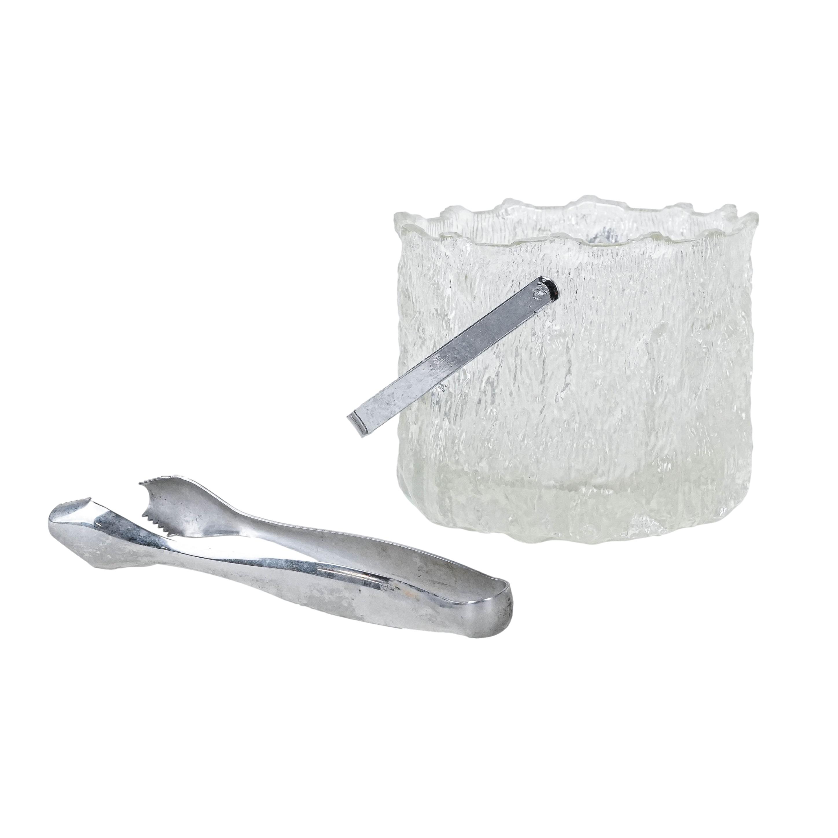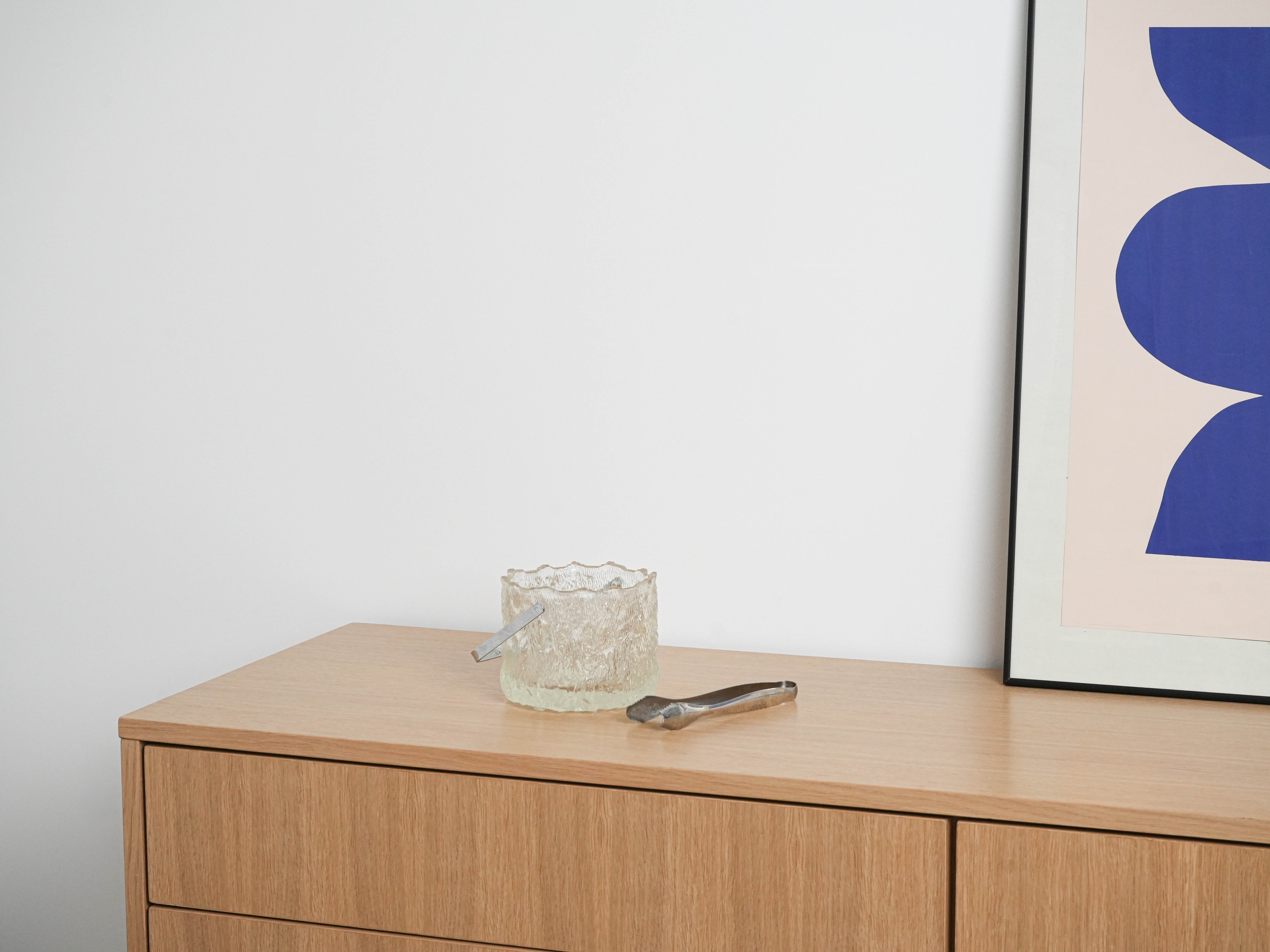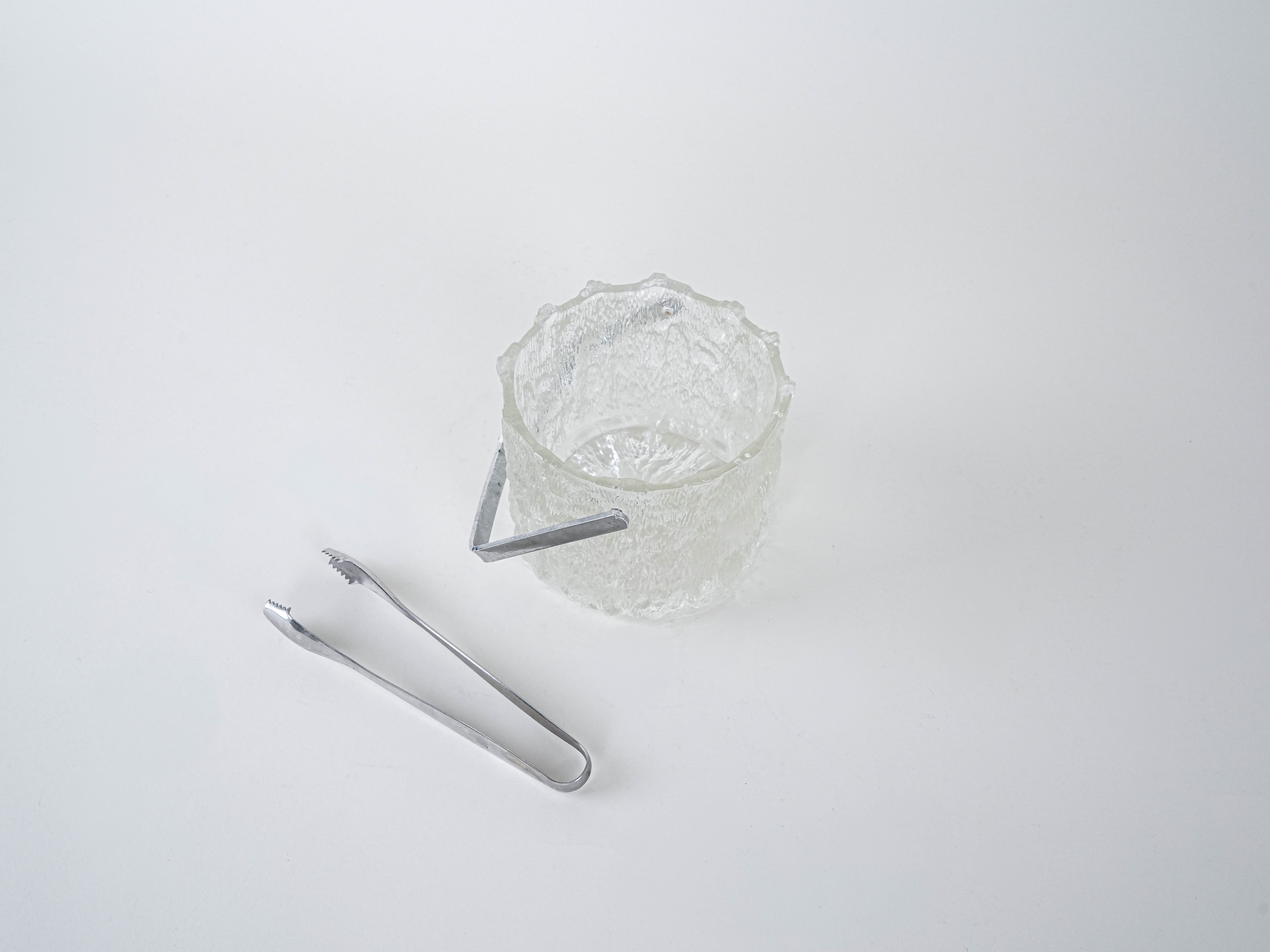 An elegant glass ice bucket from the Swedish glassworks Pukeberg—a classic of Scandinavian functional design. The thick glass with a decorative, “frosted” texture beautifully refracts light and lends the piece a refined character. The set includes metal tongs that emphasize the bar-inspired, modernist style of the set. It is a unique addition to your home bar and dining table—perfect for serving ice during gatherings, but also as a striking decorative container.
