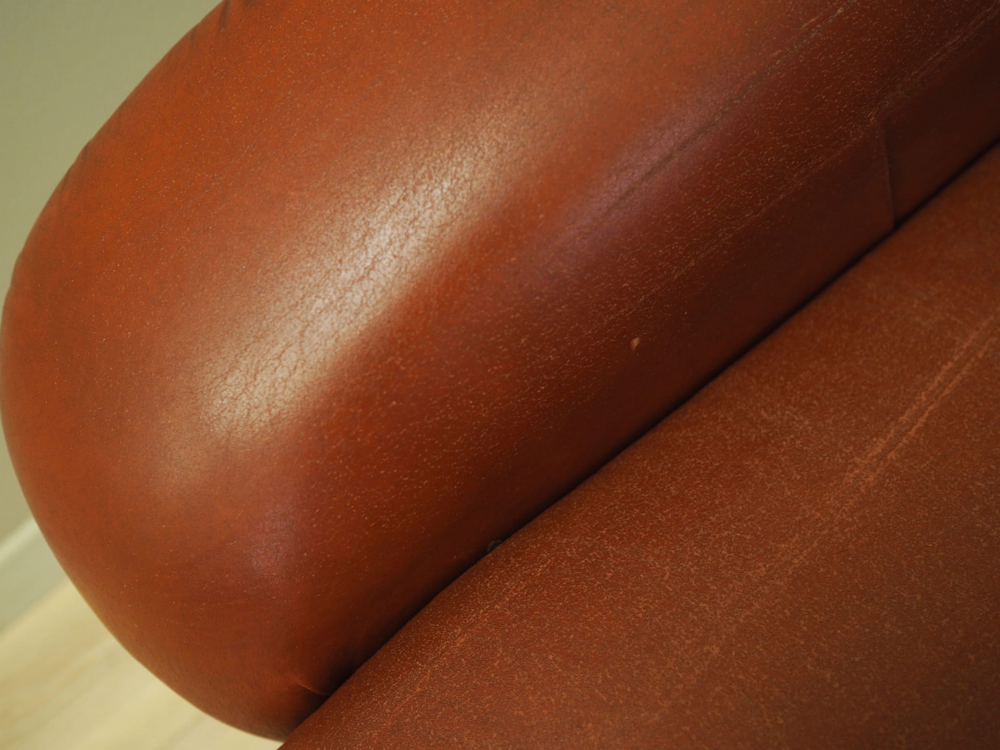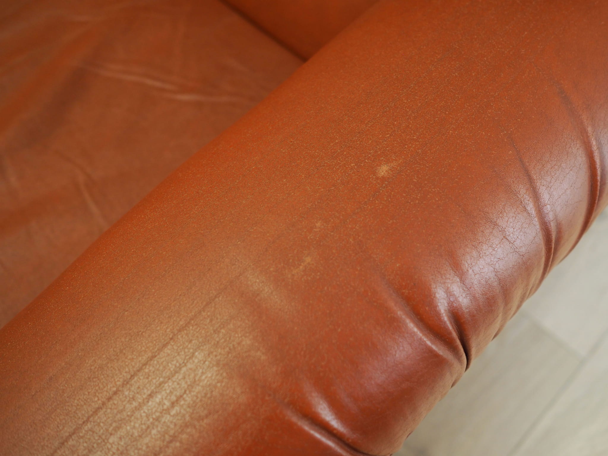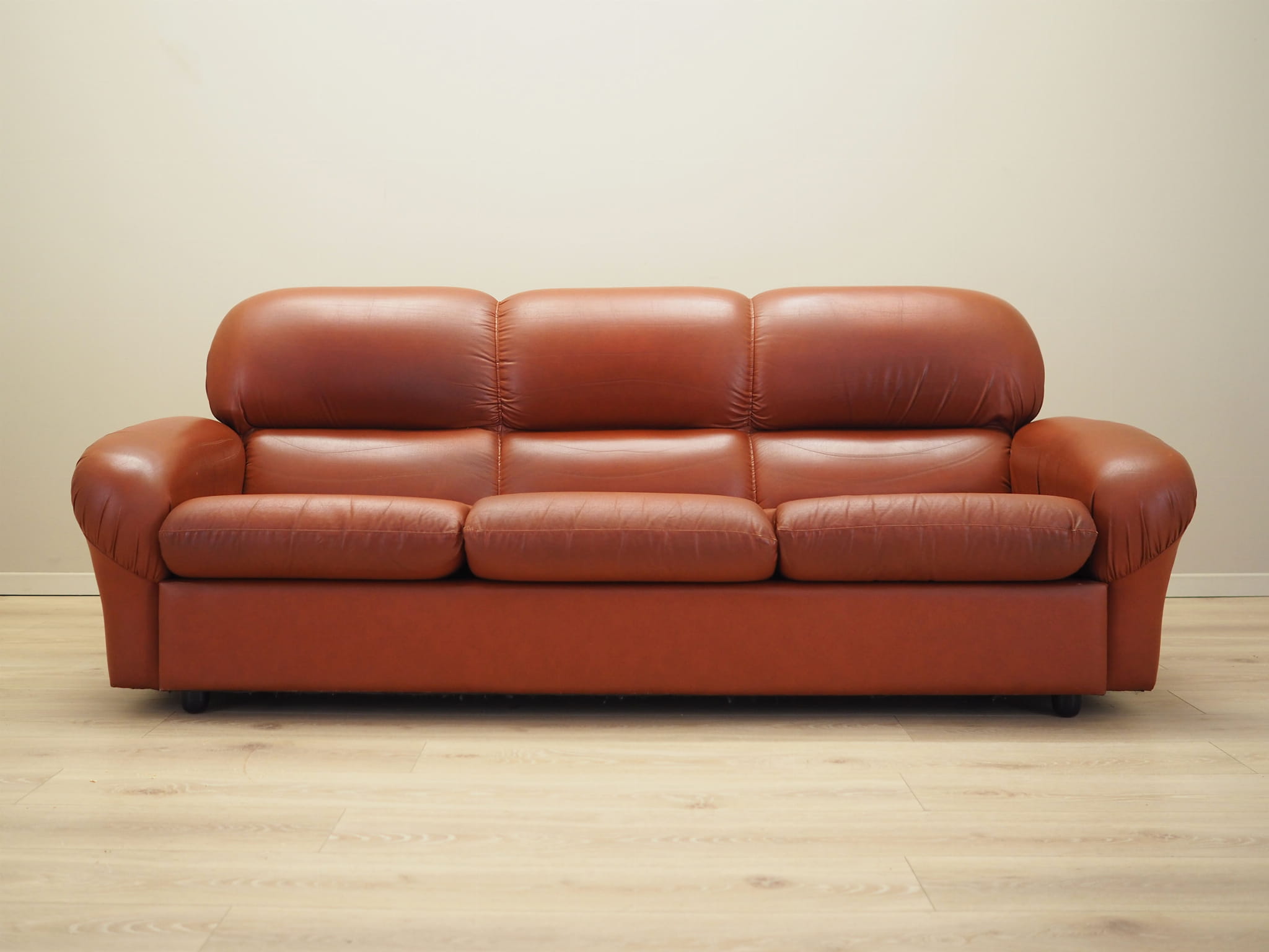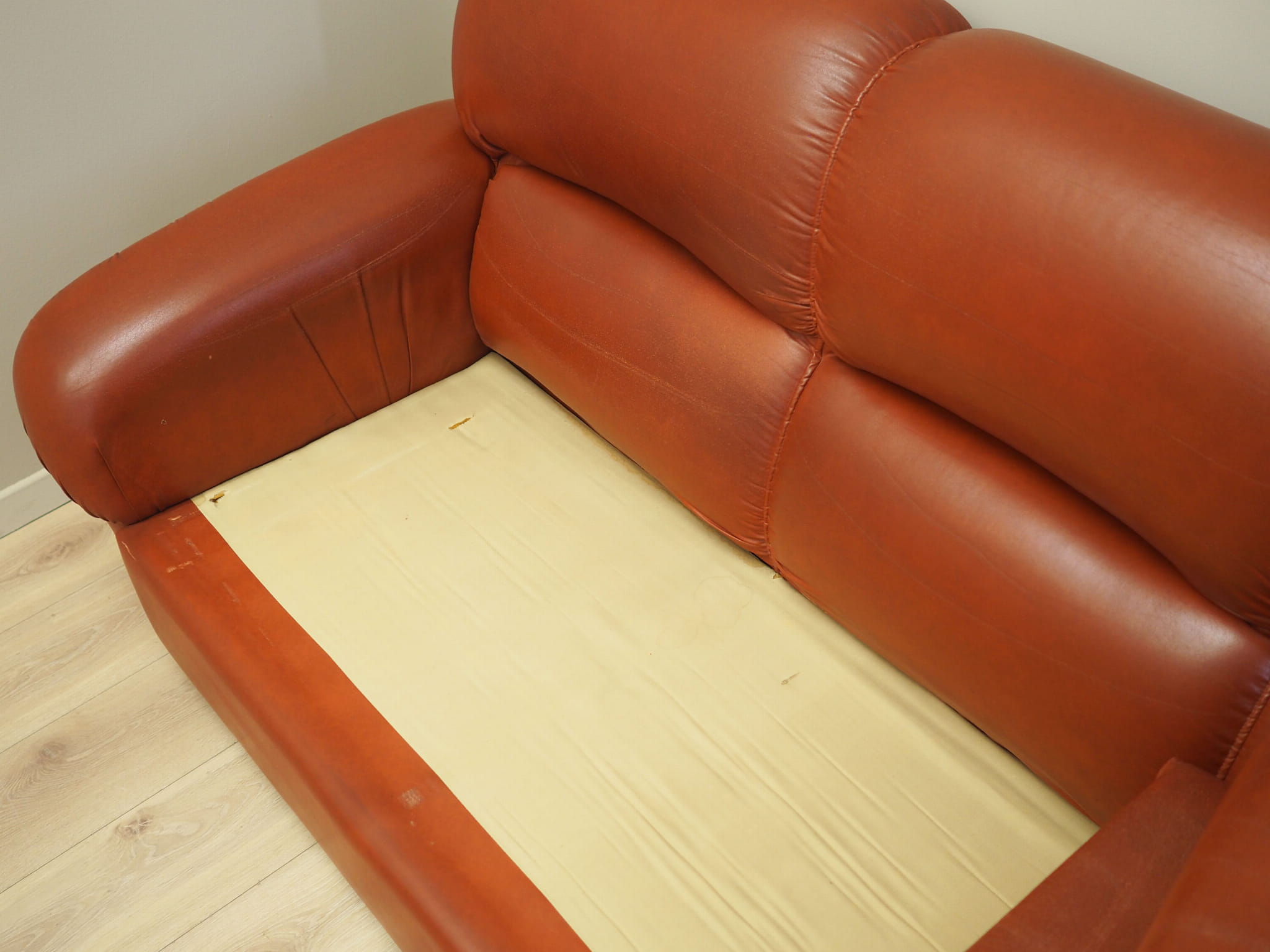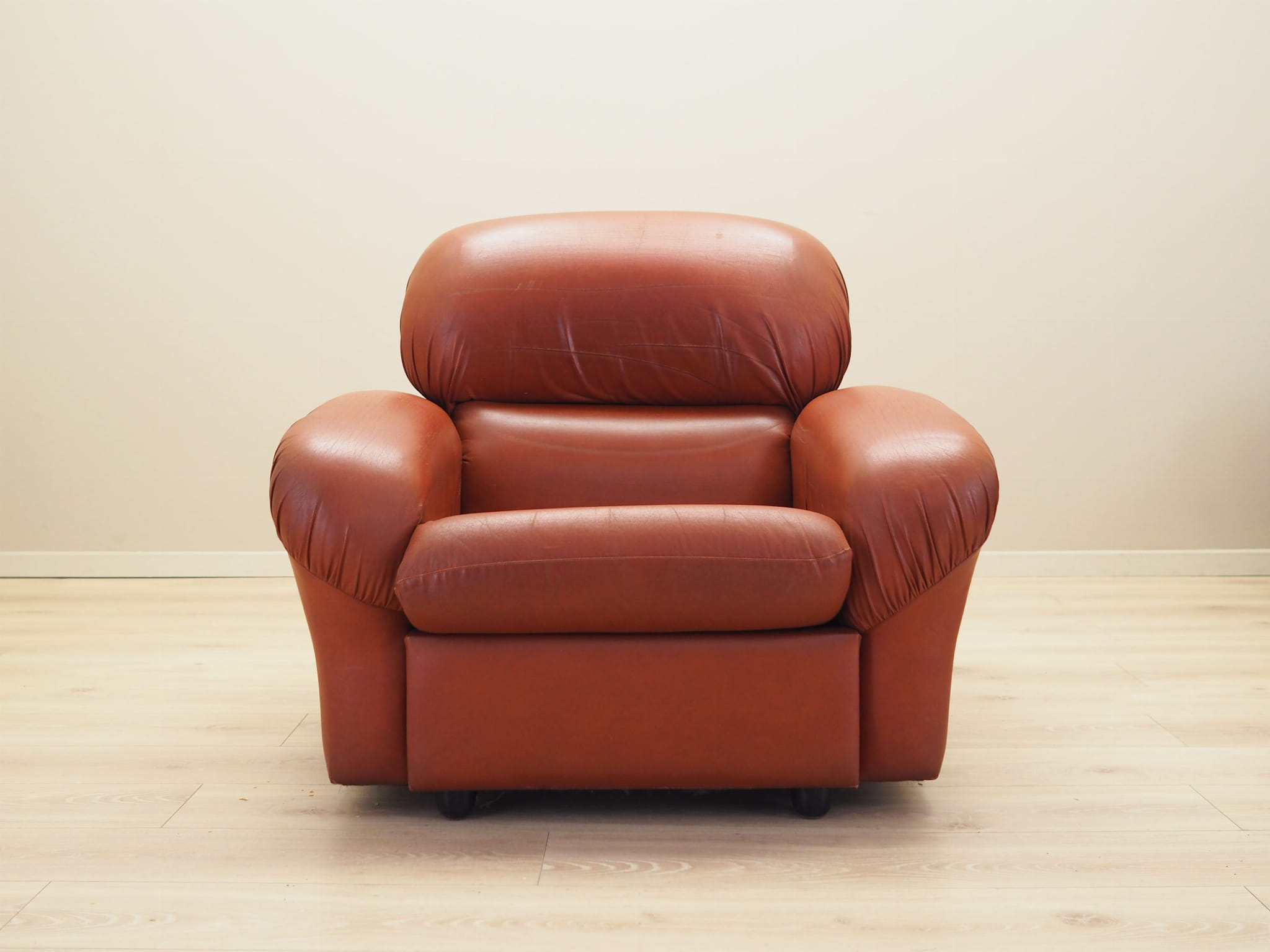 Both the sofa and armchair have been kept in their original upholstery. The upholstery is brick-coloured and high-quality eco leather has been used.