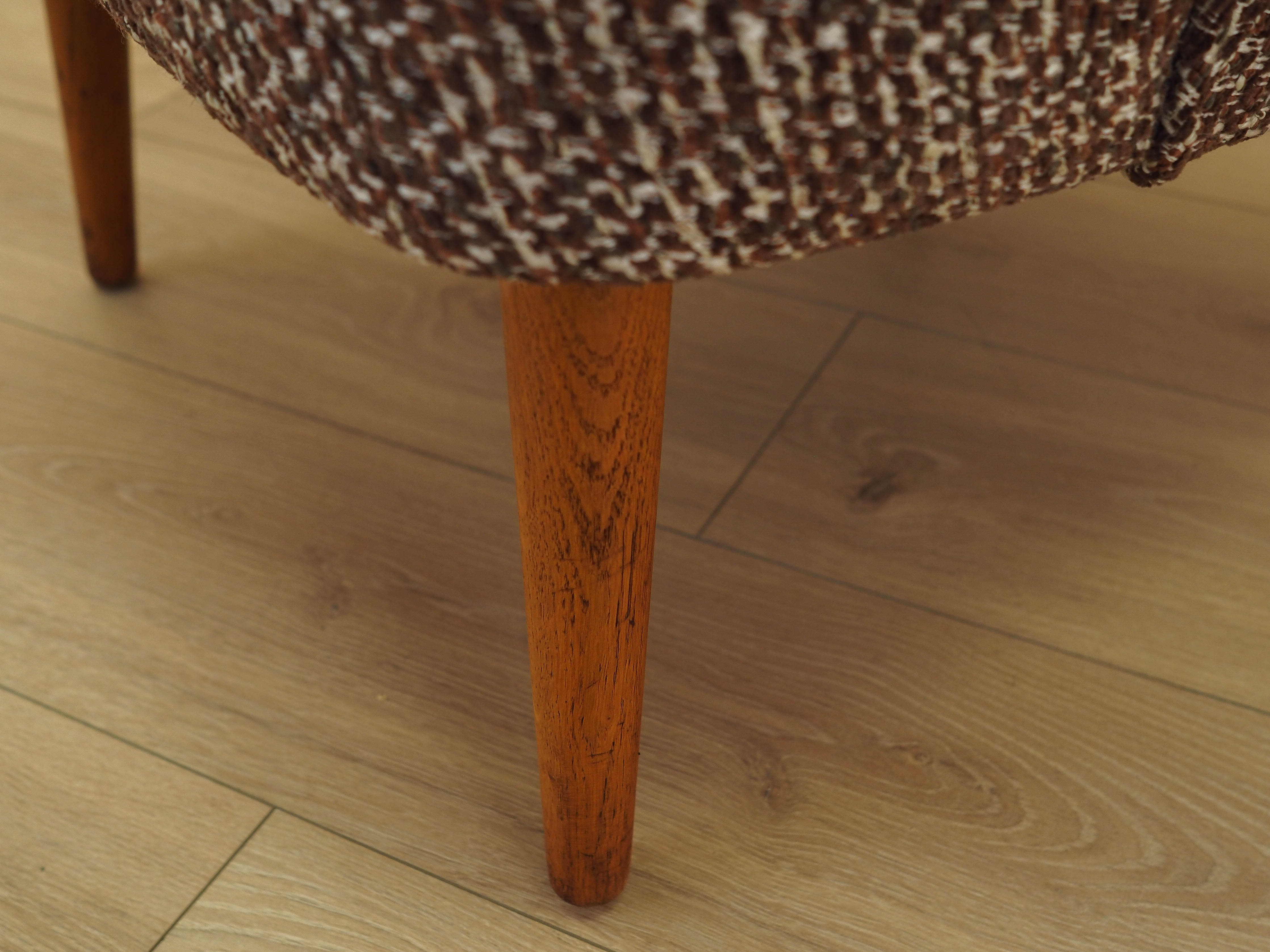 The legs are made of solid beech wood, and the armrests of teak. The armchair has been reupholstered, with the fabric replaced with a new one. A high-quality melange fabric in brown and white has been used.