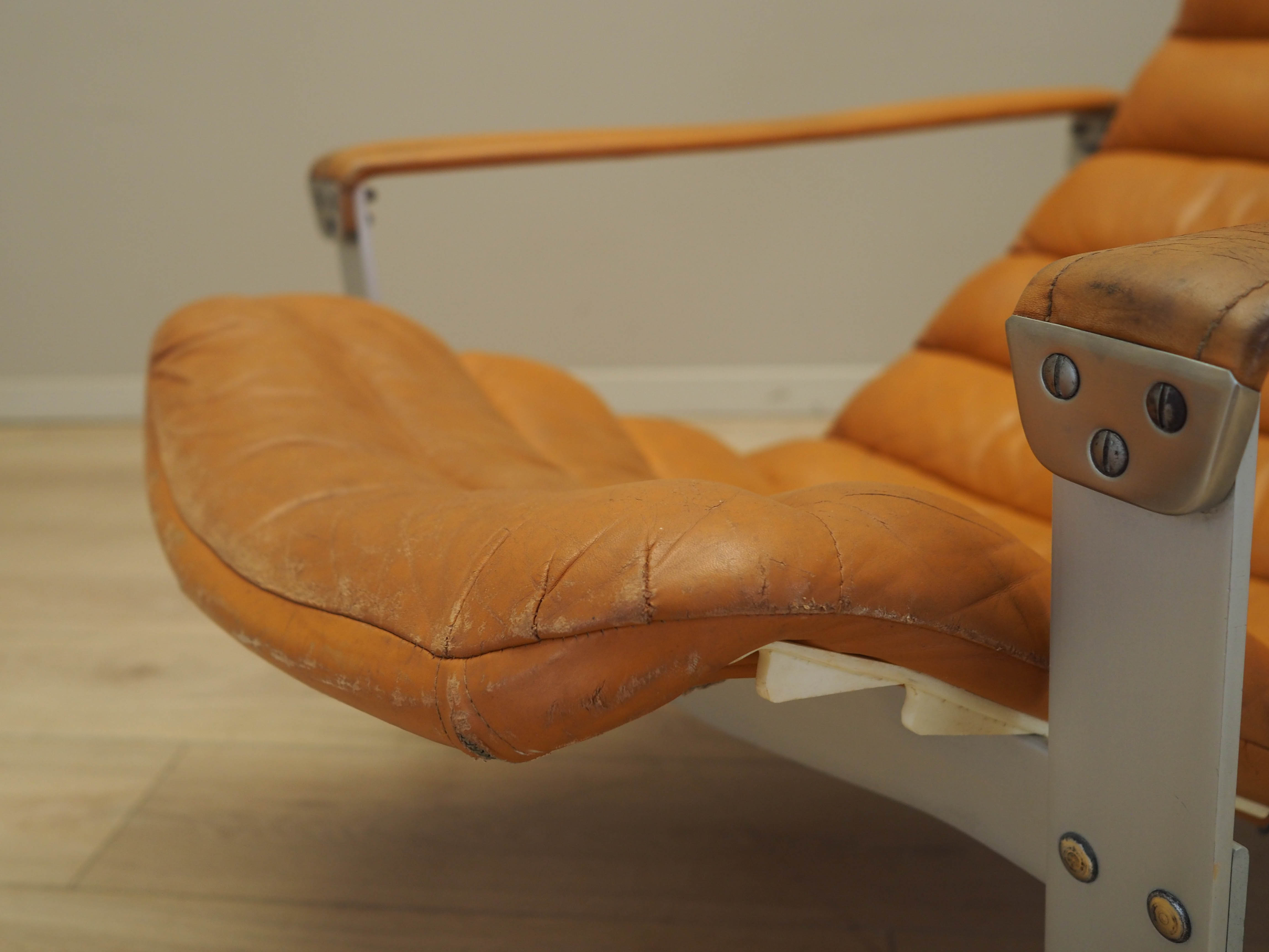 The frame is made of metal. The armchair has been preserved in its original leather. The upholstery is orange and made of high-quality natural leather. The armchair has an adjustable tilt.