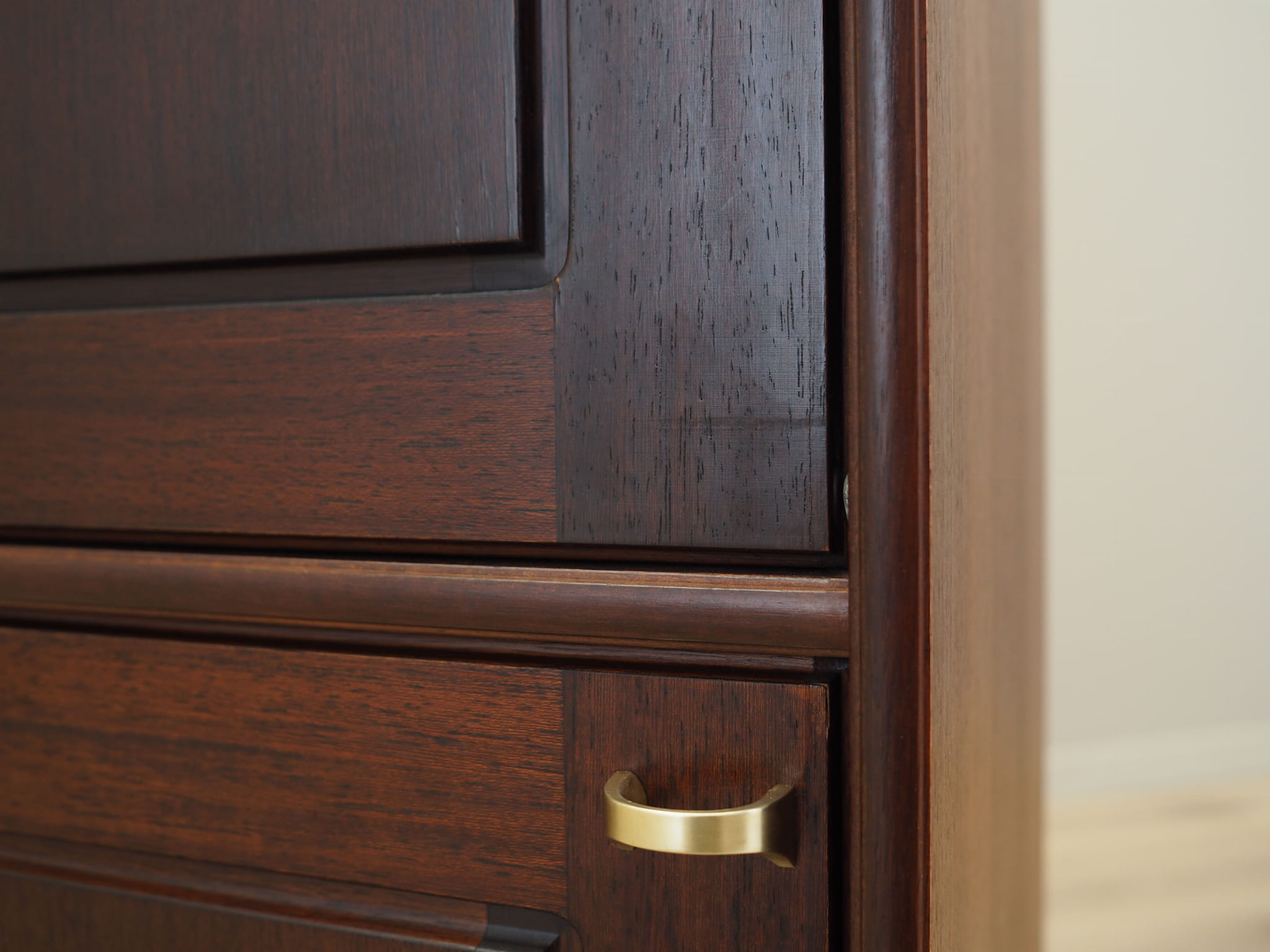 The structure is covered with mahogany veneer. The furniture was placed on a wooden plinth. The surface has been refreshed. The interior space has been filled with two glass shelves. The shelf placed in the upper cabinet is adjustable in height. A showcase with a classic opening door solution, thanks to which we have free access to the interior. An additional advantage is the illumination and the universal bar, inside of which there is a mirror. Key included.