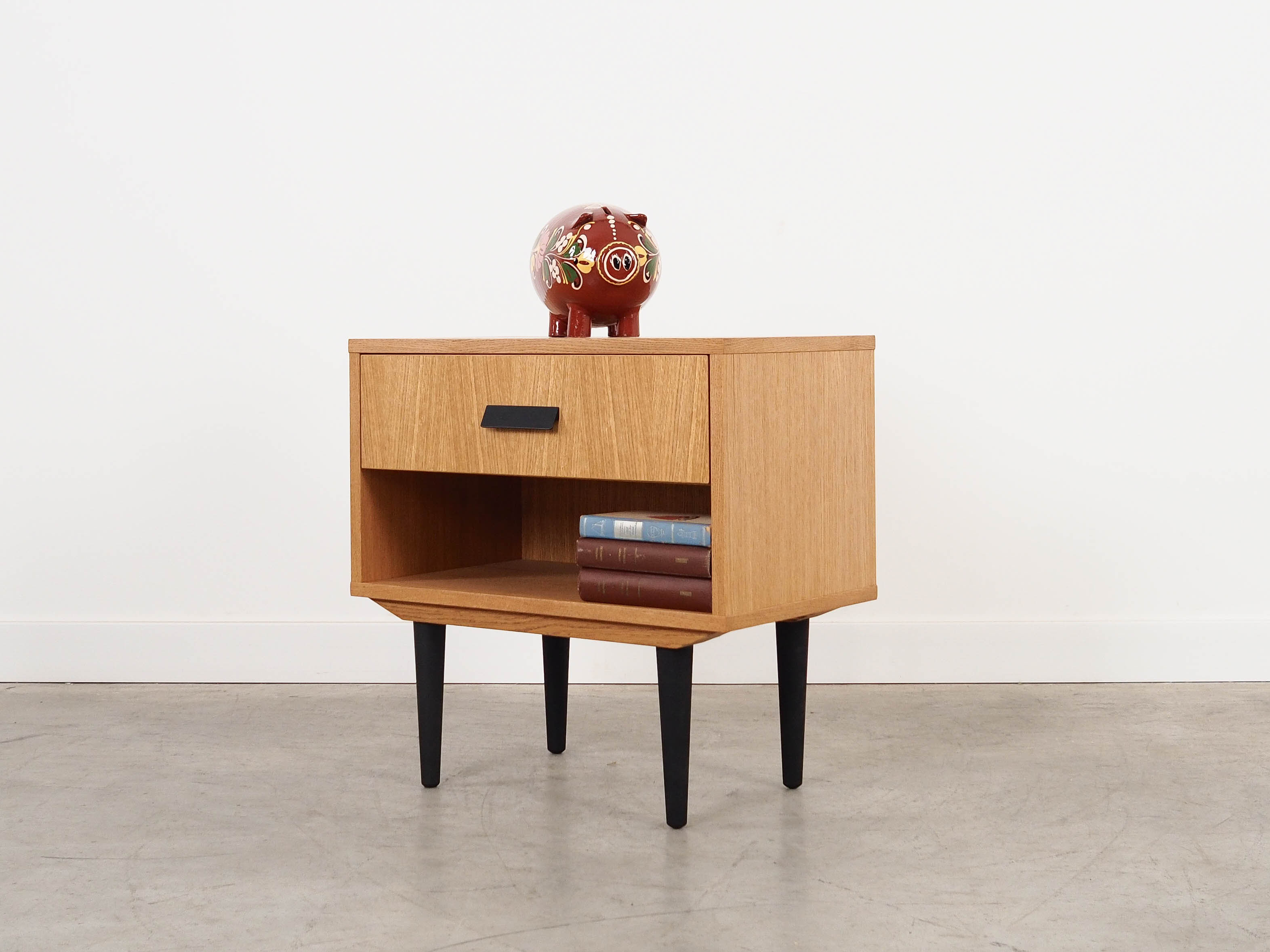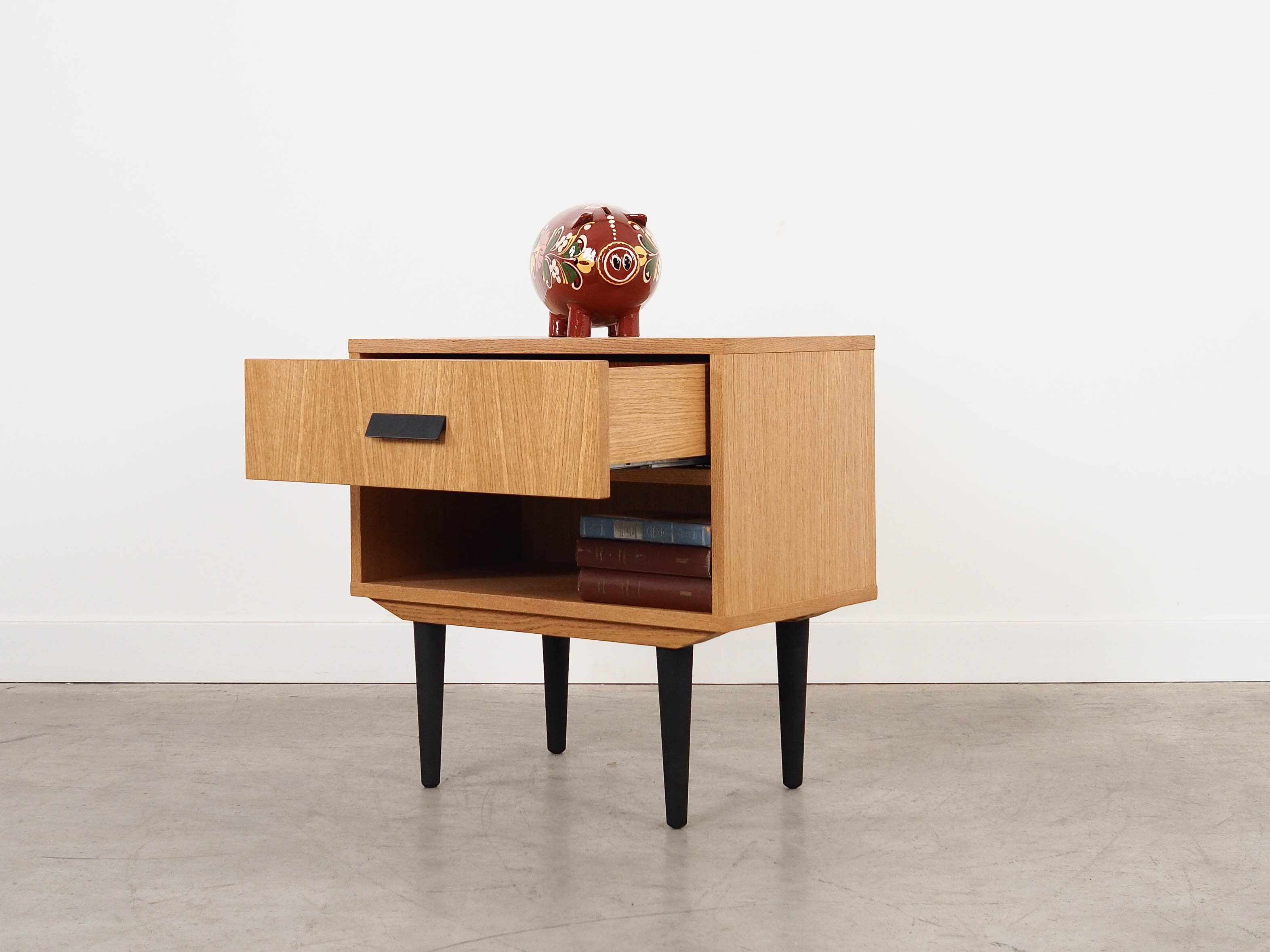 The frame is covered with oak veneer. The legs are made of solid wood stained black. The surface has been refinished. The interior features a practical drawer and a spacious compartment.