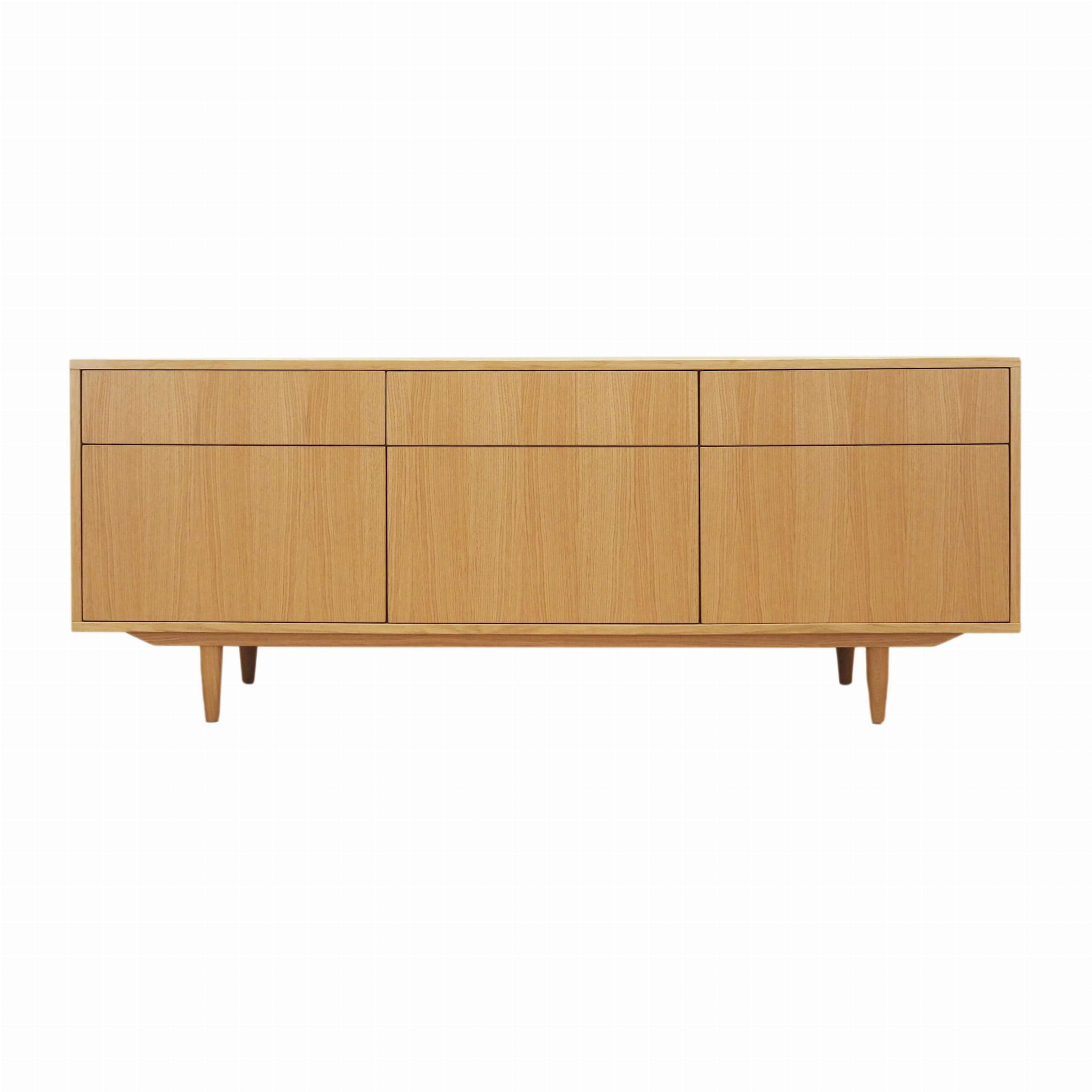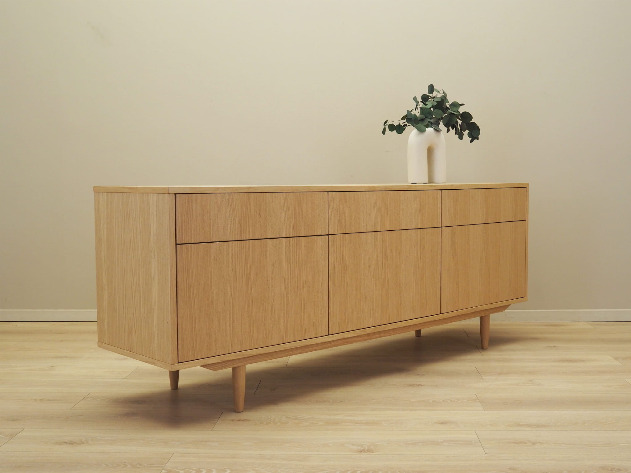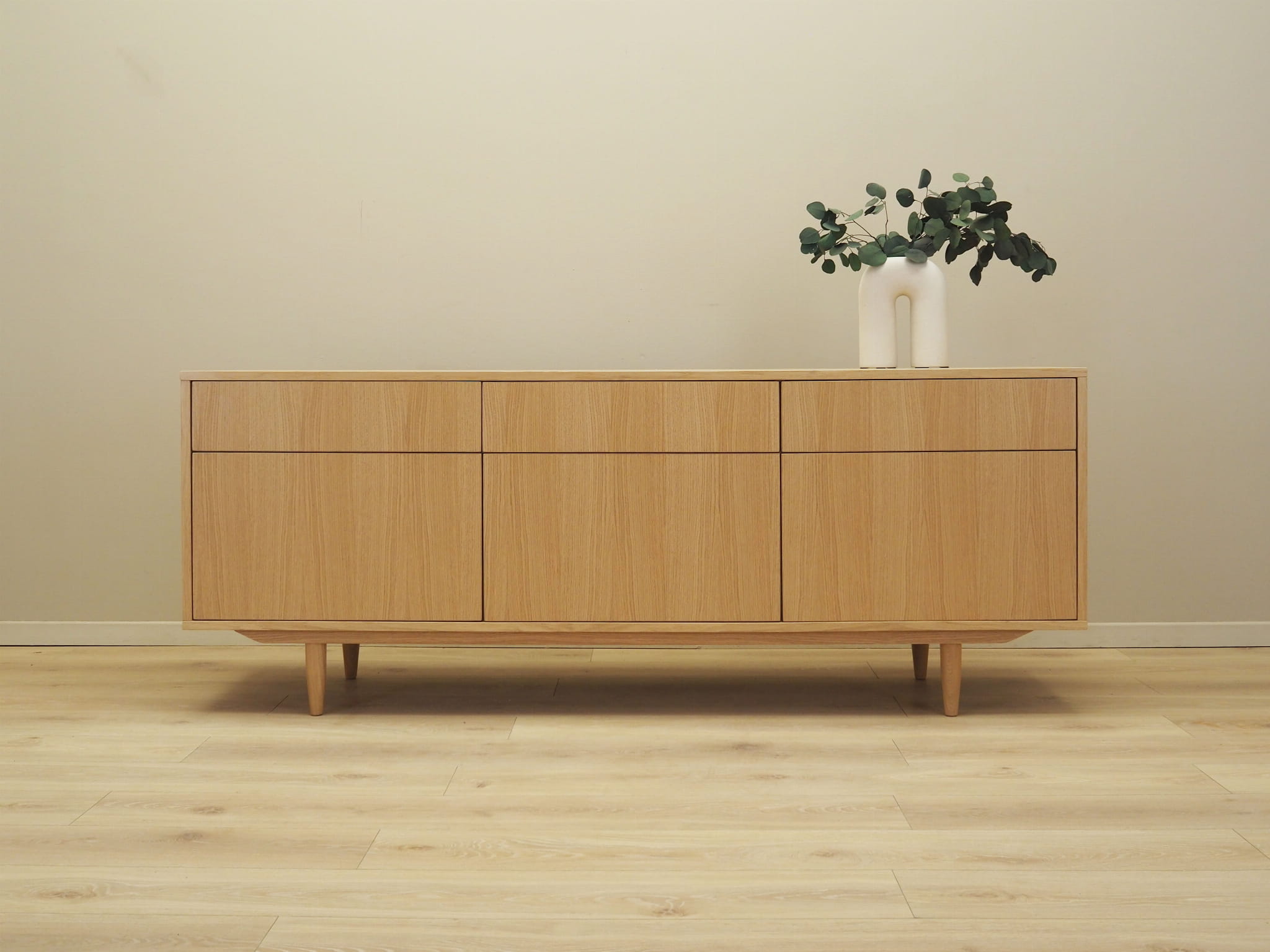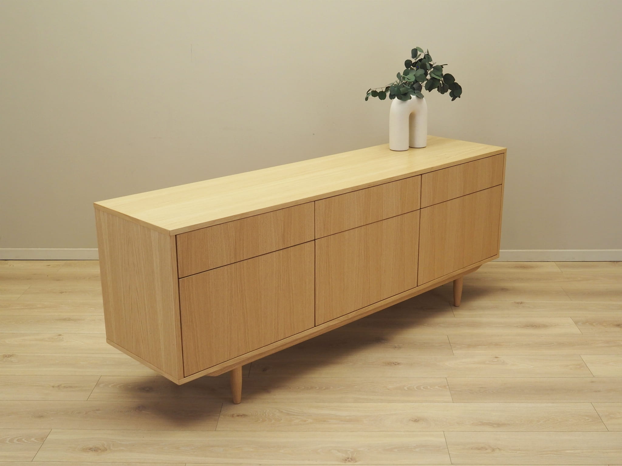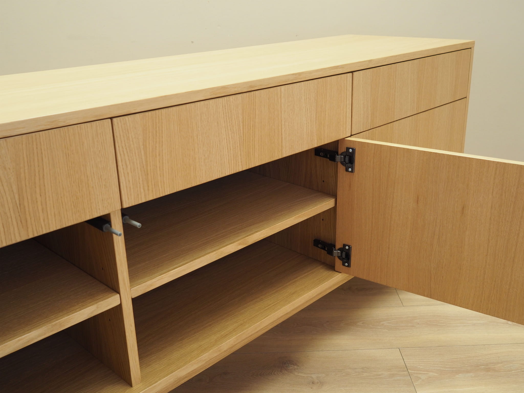 The structure is covered with oak veneer. Legs made of solid wood. Surface after refreshing. Inside, the space has been filled with three capacious drawers and three adjustable shelves. The furniture has a convenient solution of opening doors, thanks to which we have unlimited access to its interior.