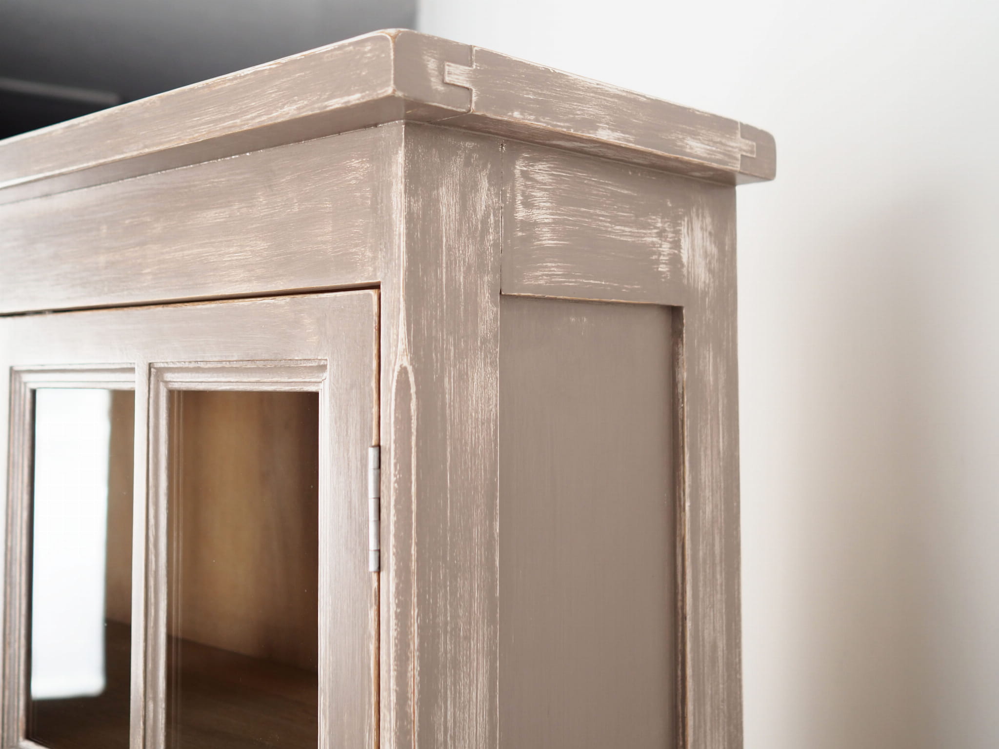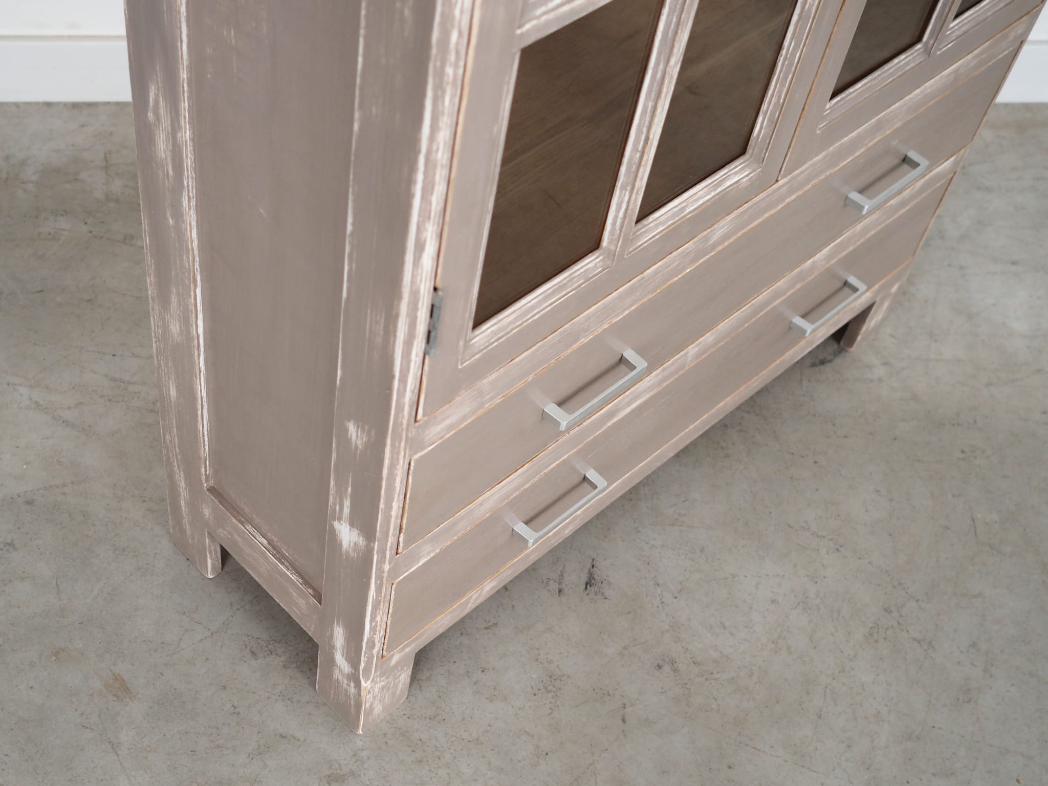 The structure is made of oak wood. The legs are made of solid wood, the handles are made of metal. The furniture was stained beige using the shabby chic method. The surface has been refreshed. Inside, the space was filled with three practical non-adjustable shelves and two capacious drawers. The showcase with a classic solution of opening doors, thanks to which we have access to the entire interior of the furniture.
