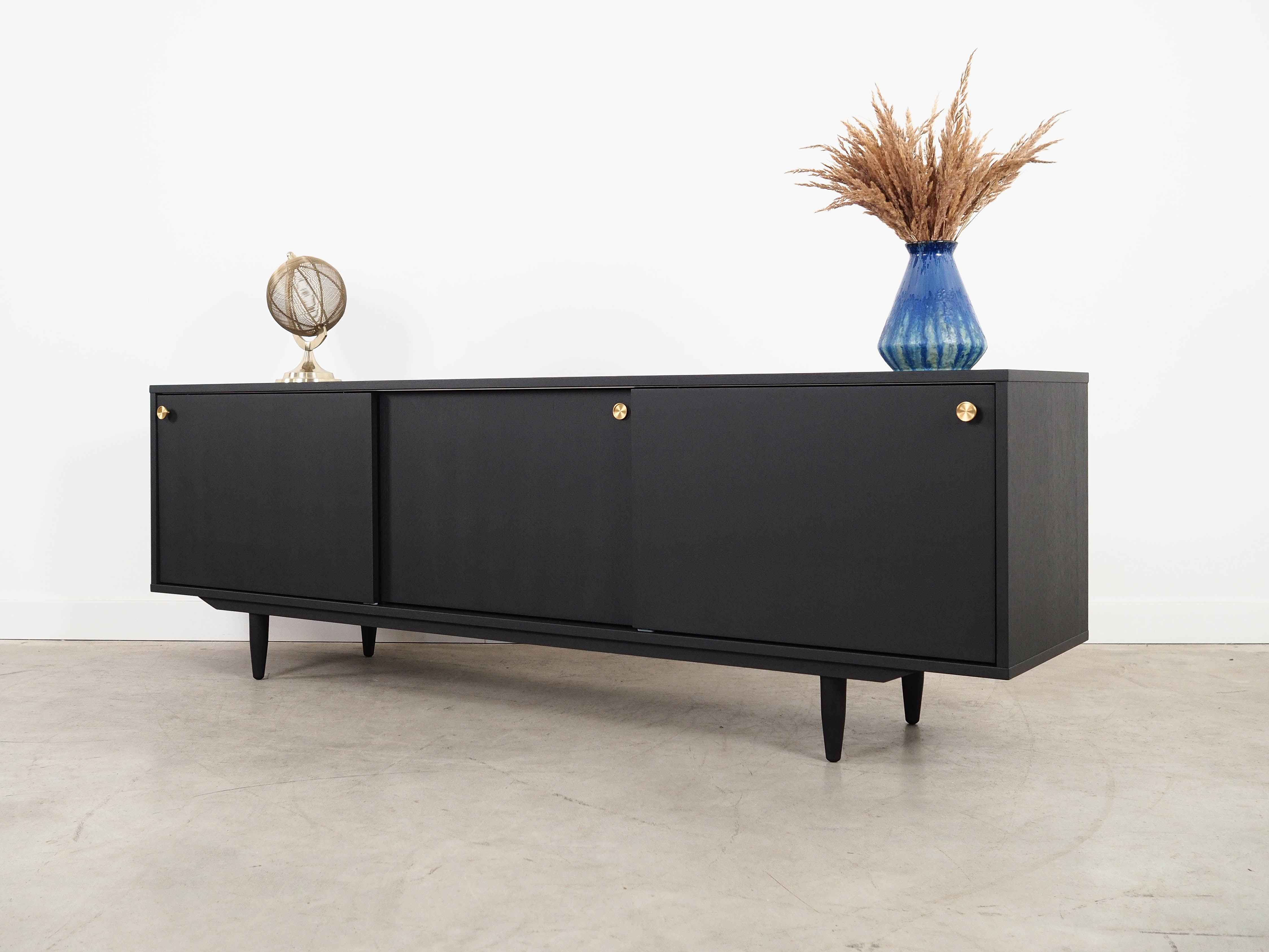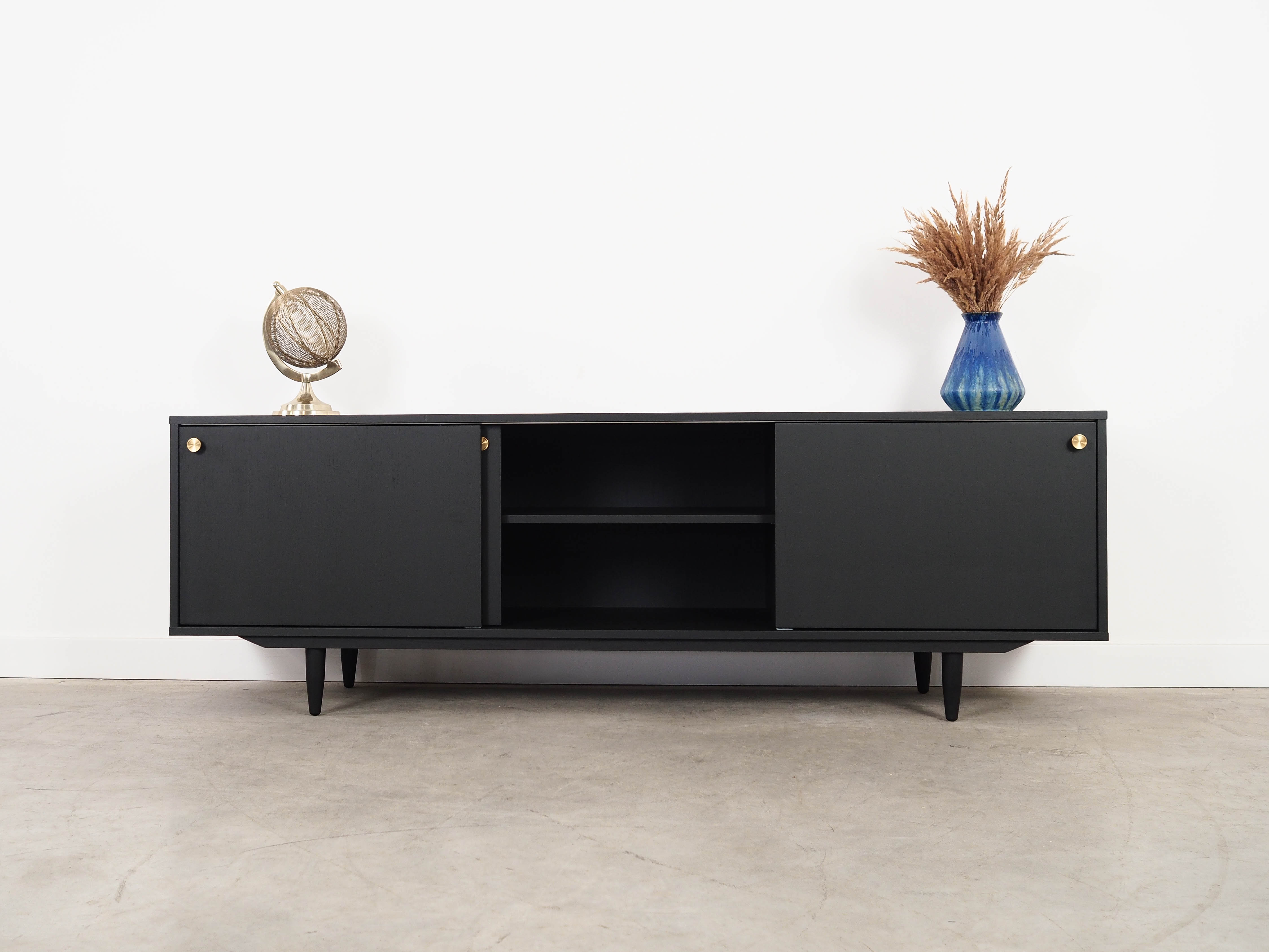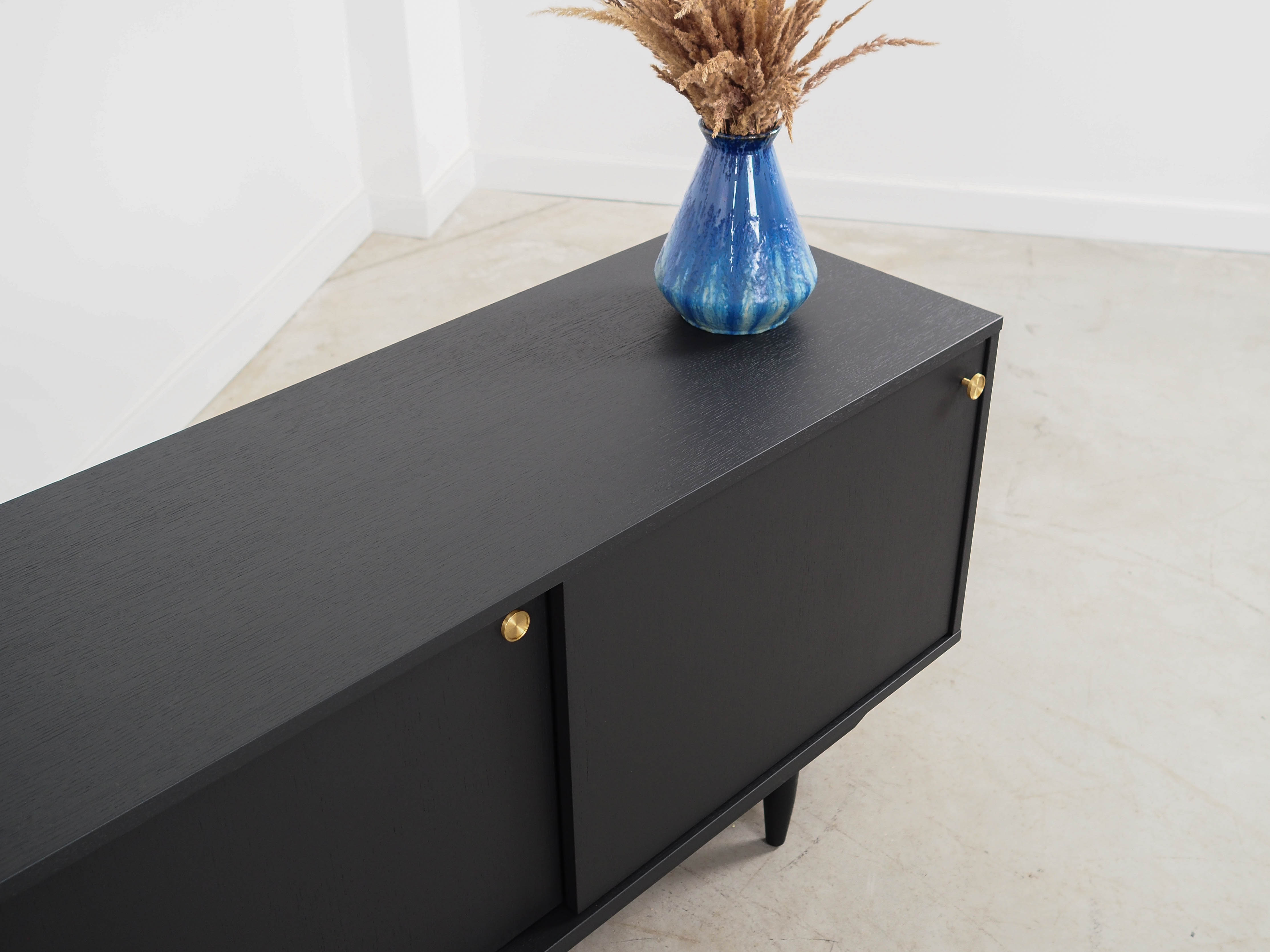 The frame is covered in oak veneer. The surface has been refinished. The legs are made of solid wood. Both the body and the legs have been stained black. Inside, the space is fitted with three height-adjustable shelves. The unit features a practical sliding door design, which minimises the need for a large clear space in front of the unit whilst not restricting access to the interior. Furthermore, the sliding doors are an ideal solution for using the unit to house a stereo system.