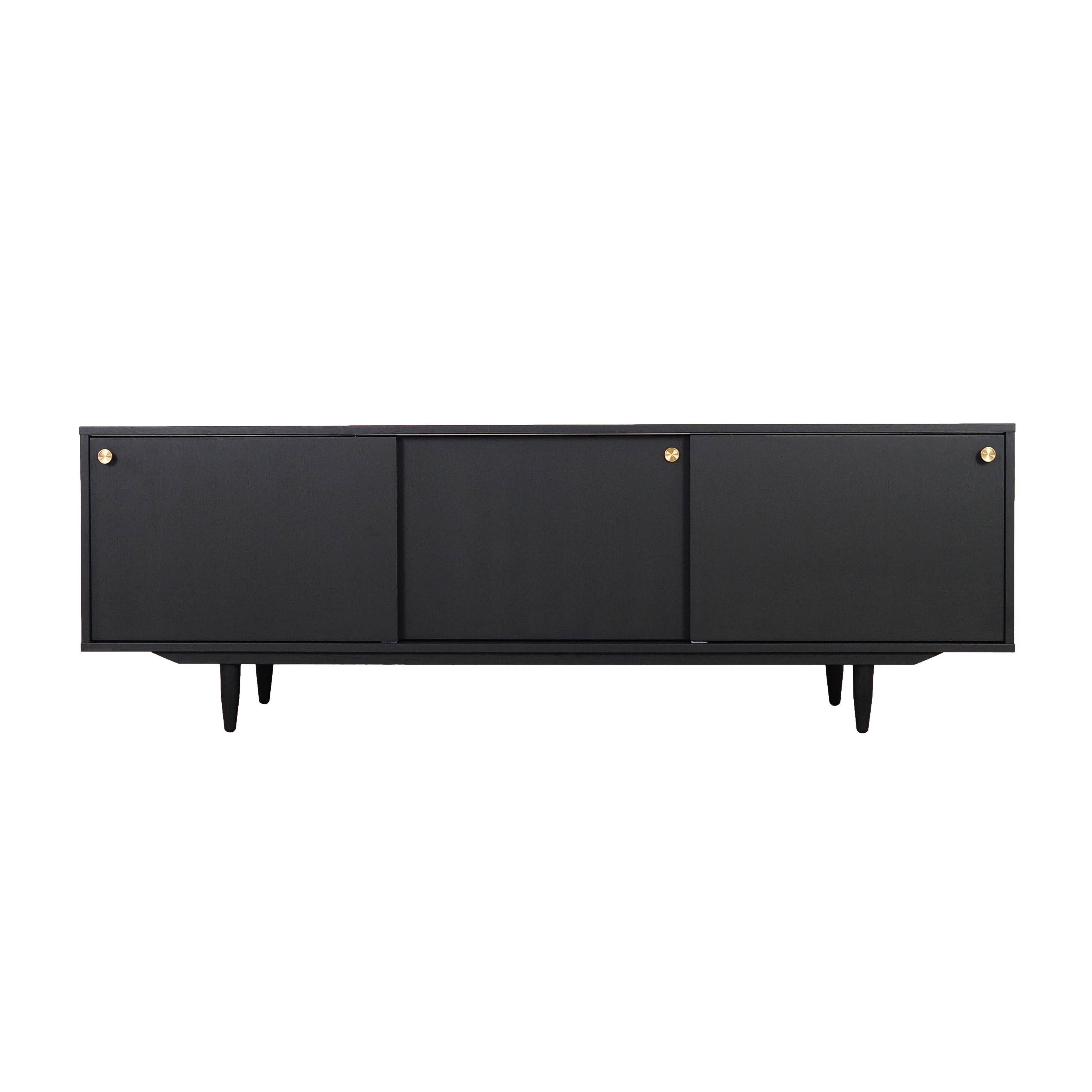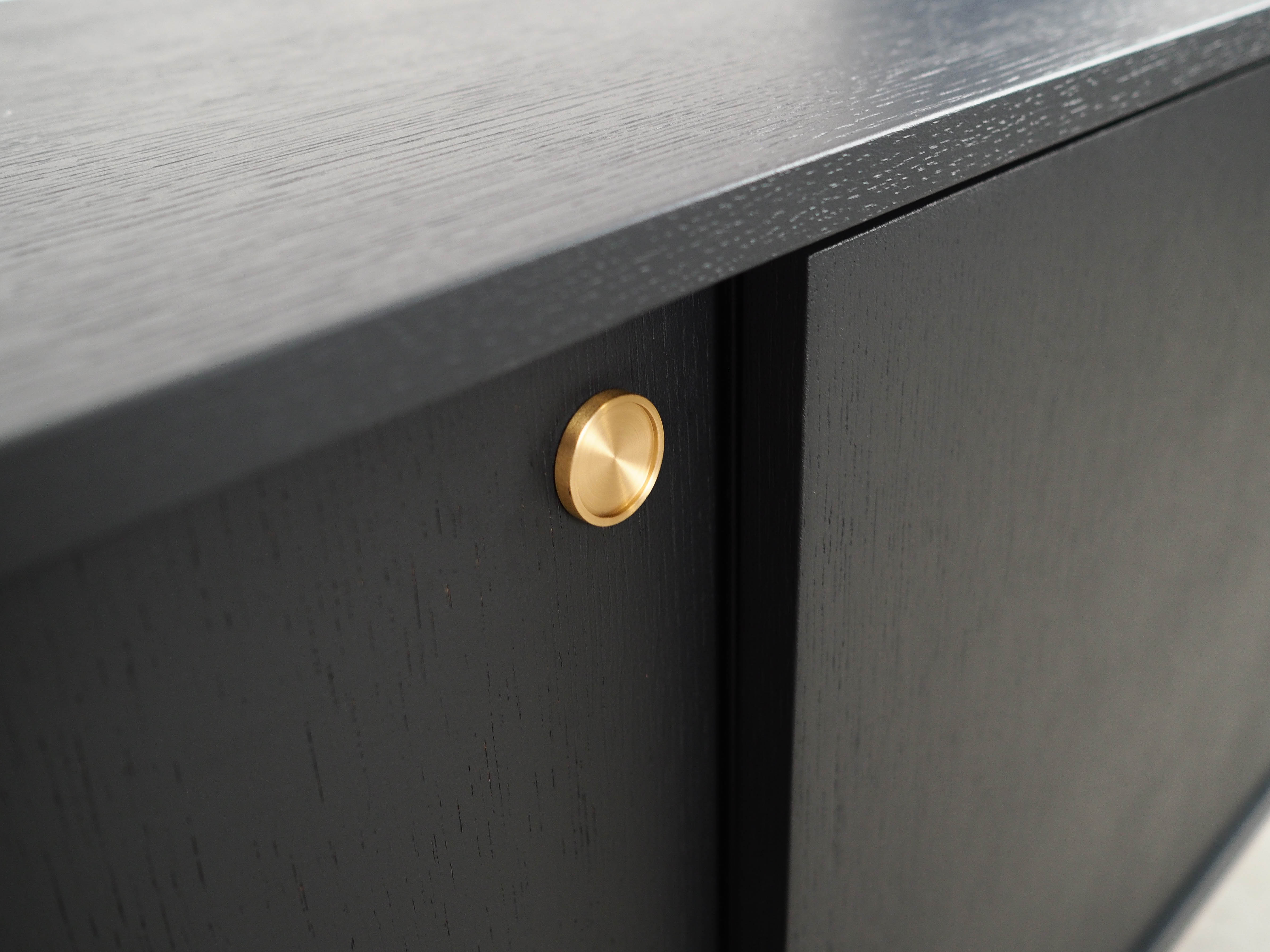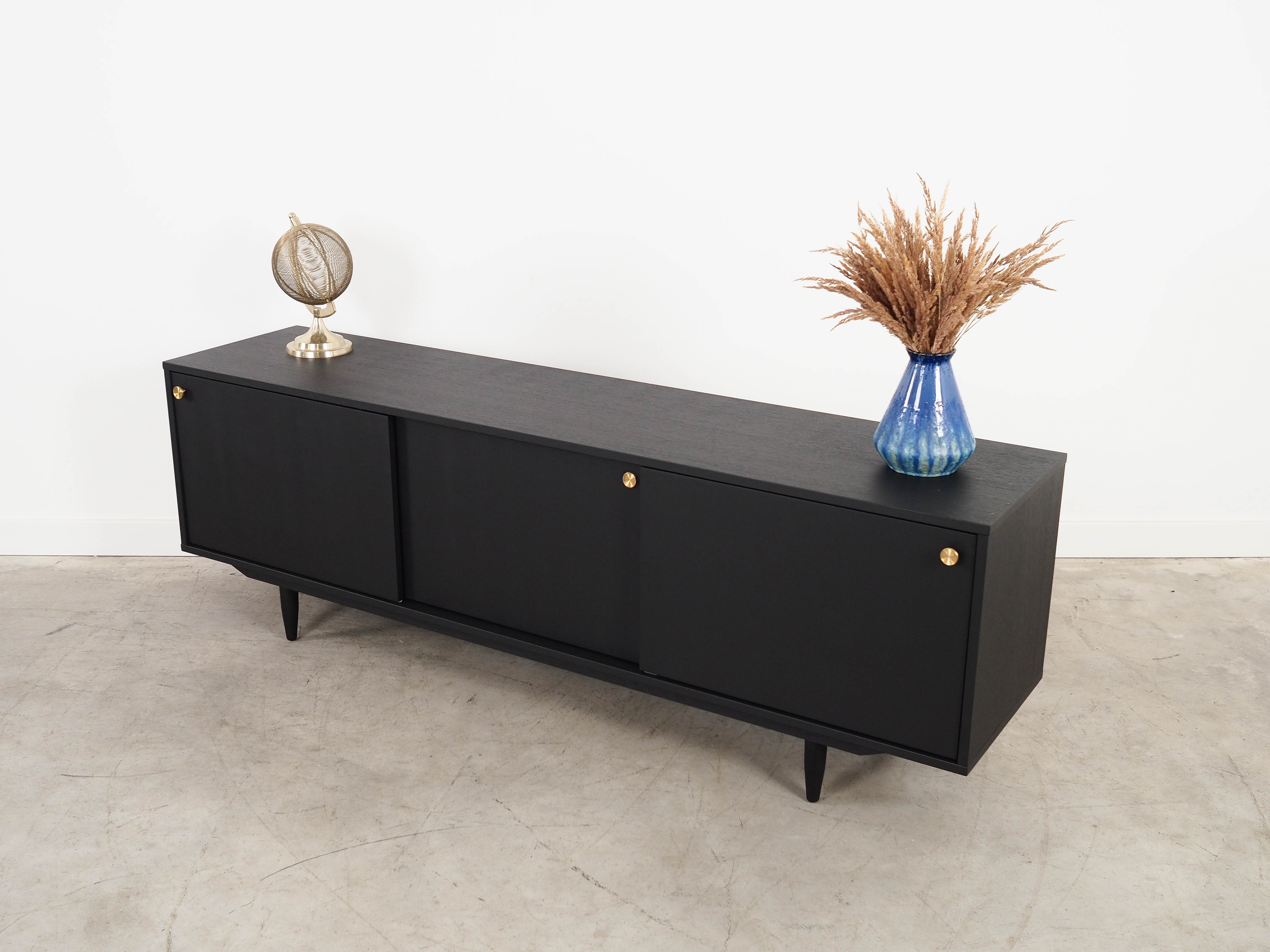 The frame is covered in oak veneer. The surface has been refinished. The legs are made of solid wood. Both the body and the legs have been stained black. Inside, the space is fitted with three height-adjustable shelves. The unit features a practical sliding door design, which minimises the need for a large clear space in front of the unit whilst not restricting access to the interior. Furthermore, the sliding doors are an ideal solution for using the unit to house a stereo system.