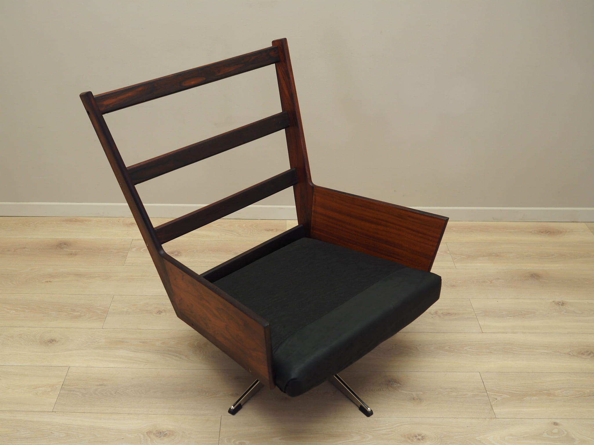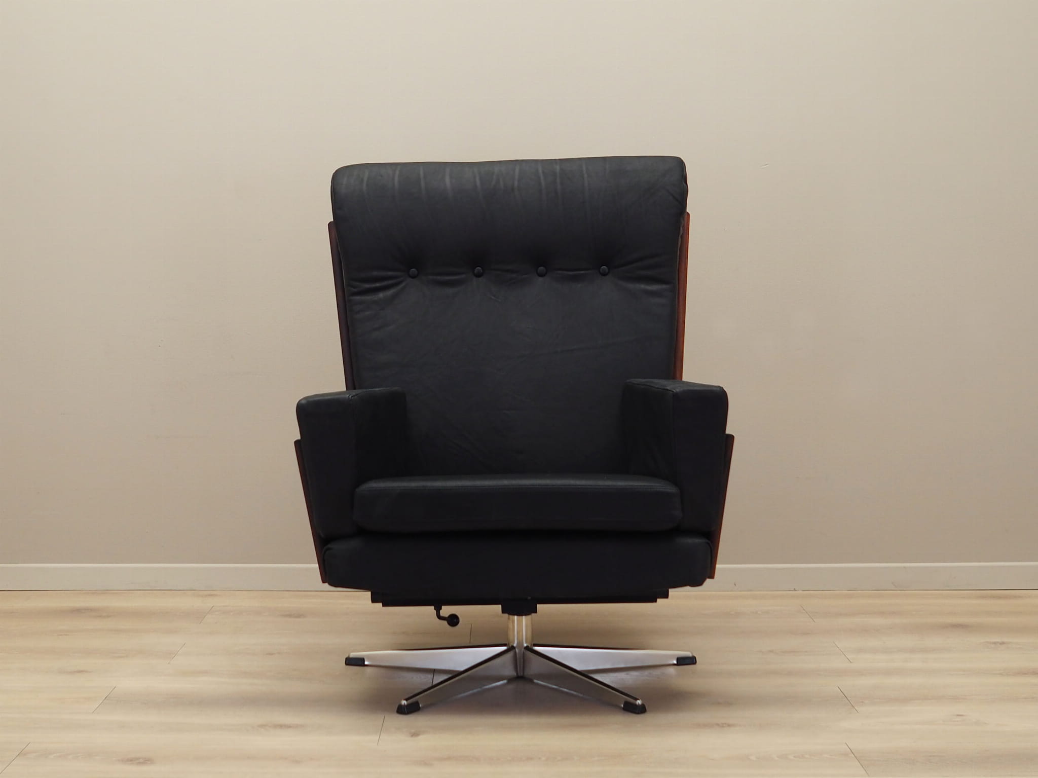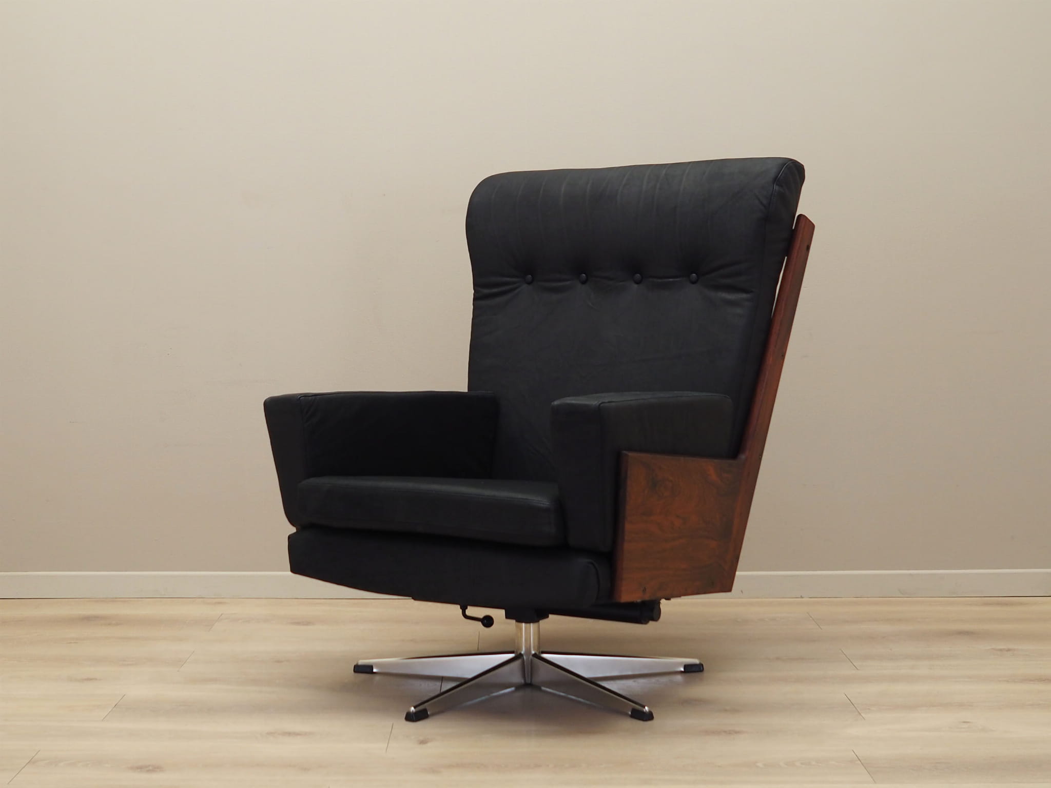 The structure was made of rosewood. The base is made of metal. Wood after refreshing. The armchair is covered with original high-quality natural leather. The leather has been made in black. Sponges replaced with new ones. The armchair has a tilt function.