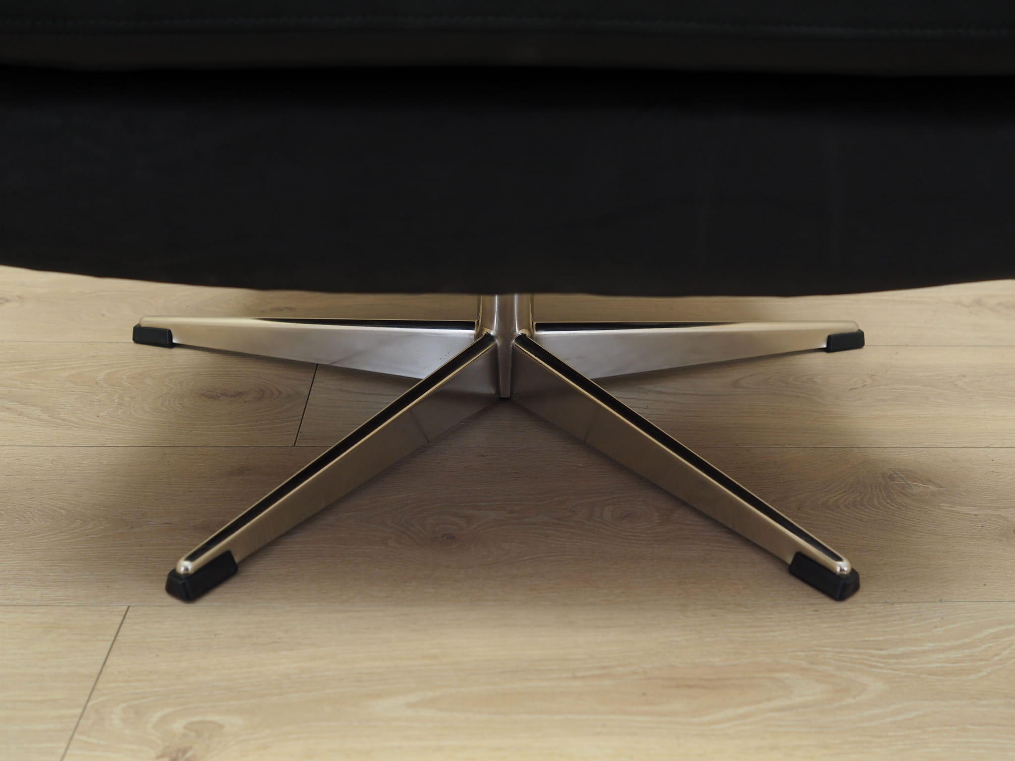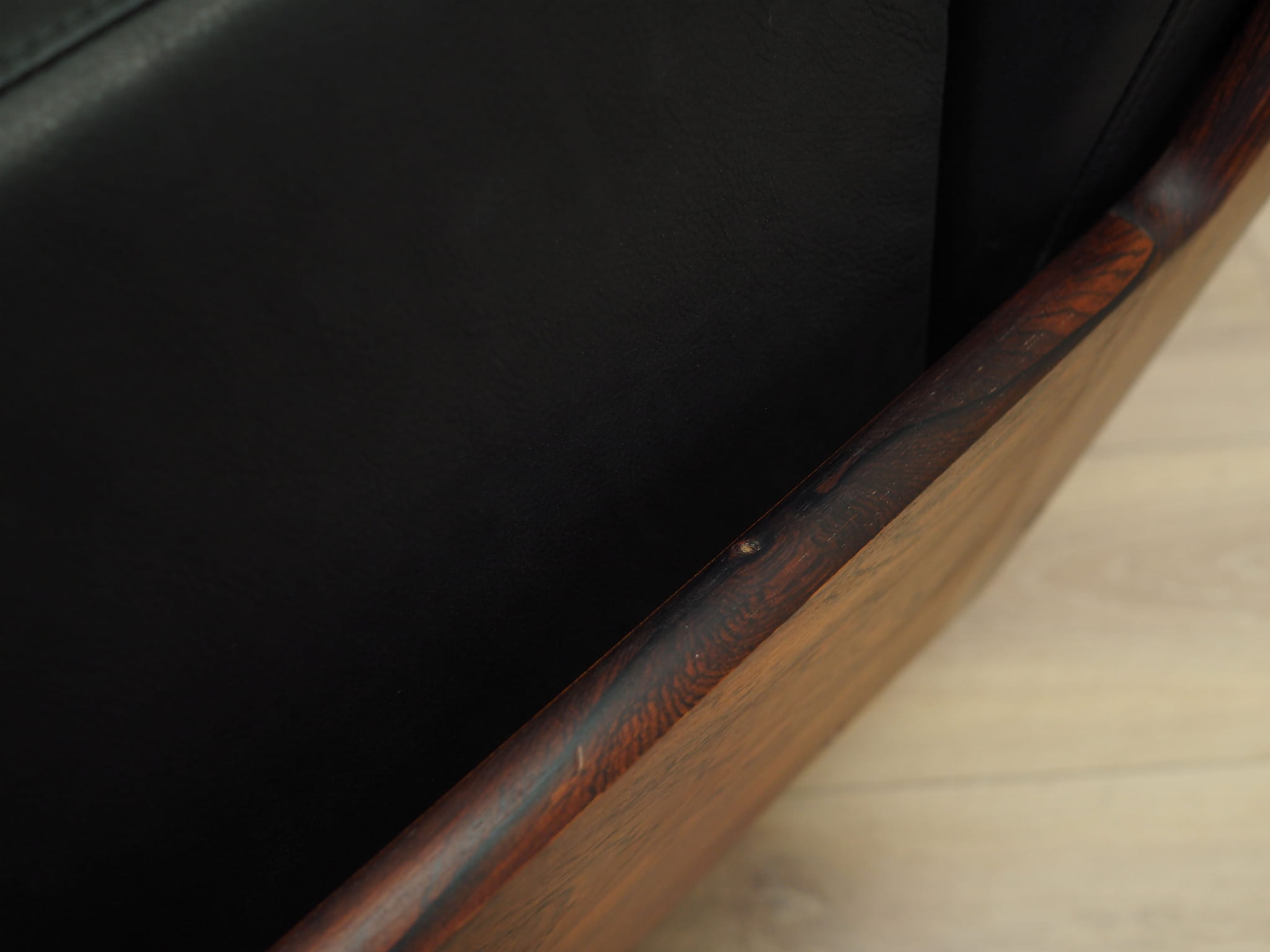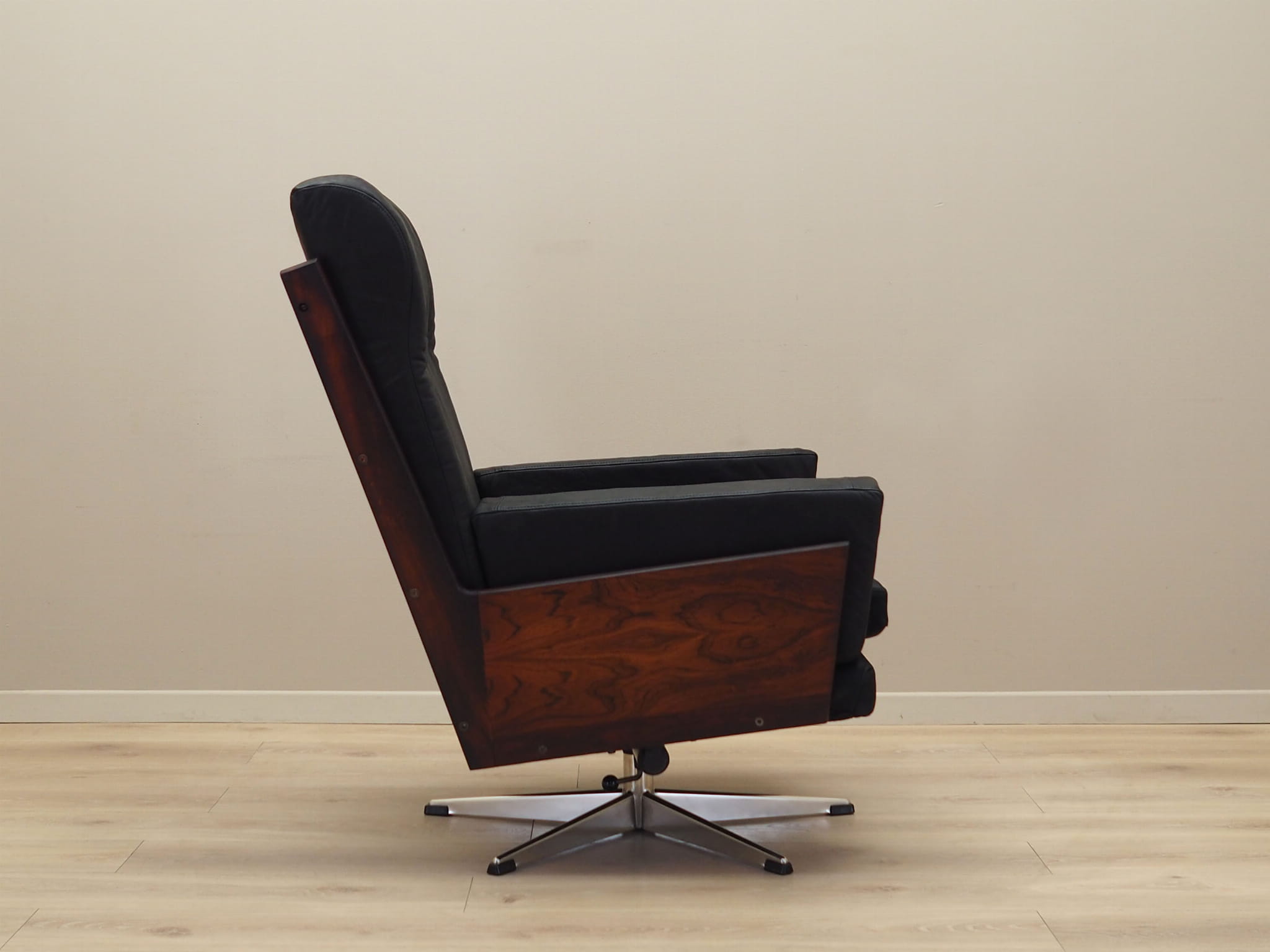 The structure was made of rosewood. The base is made of metal. Wood after refreshing. The armchair is covered with original high-quality natural leather. The leather has been made in black. Sponges replaced with new ones. The armchair has a tilt function.