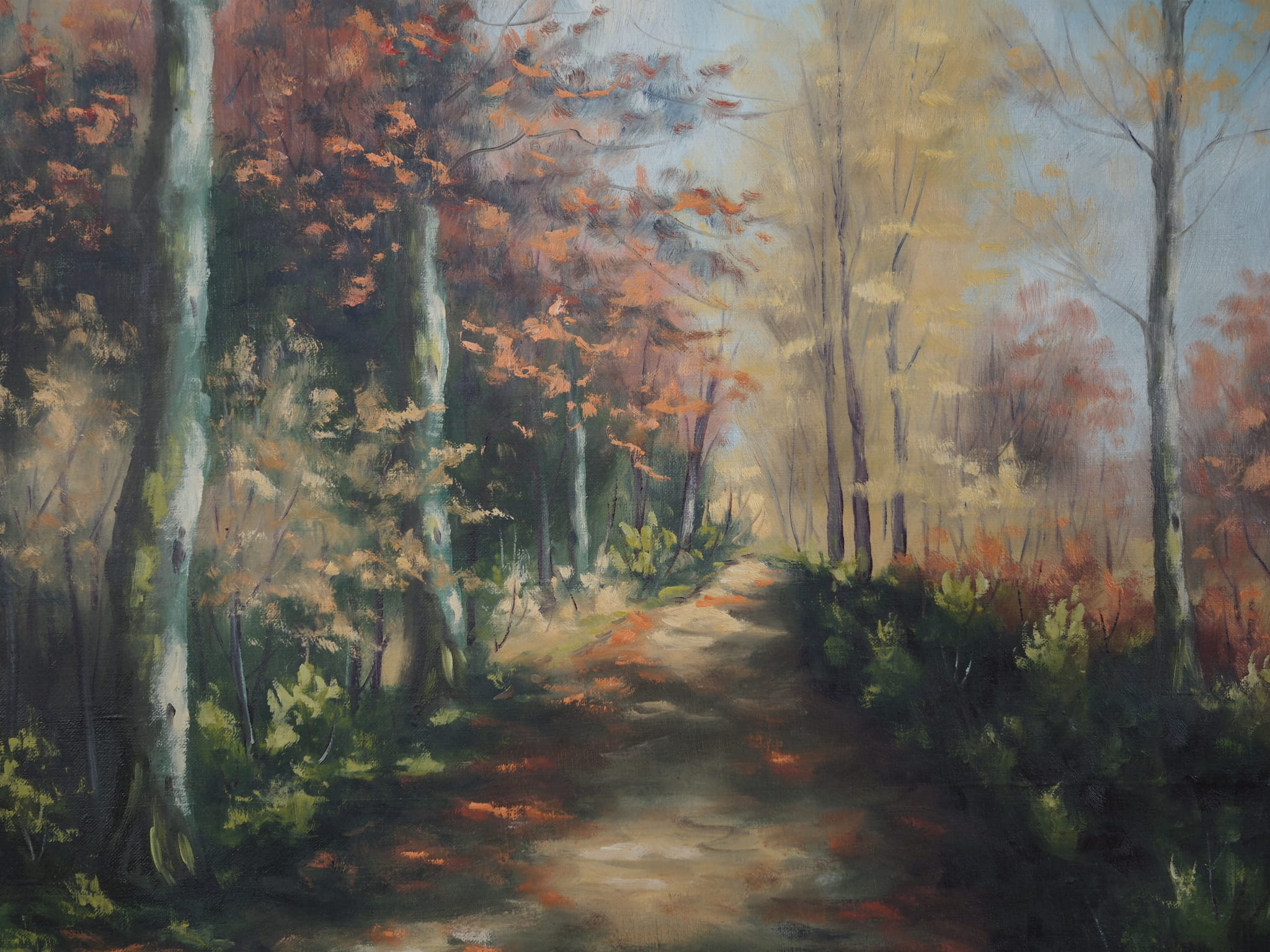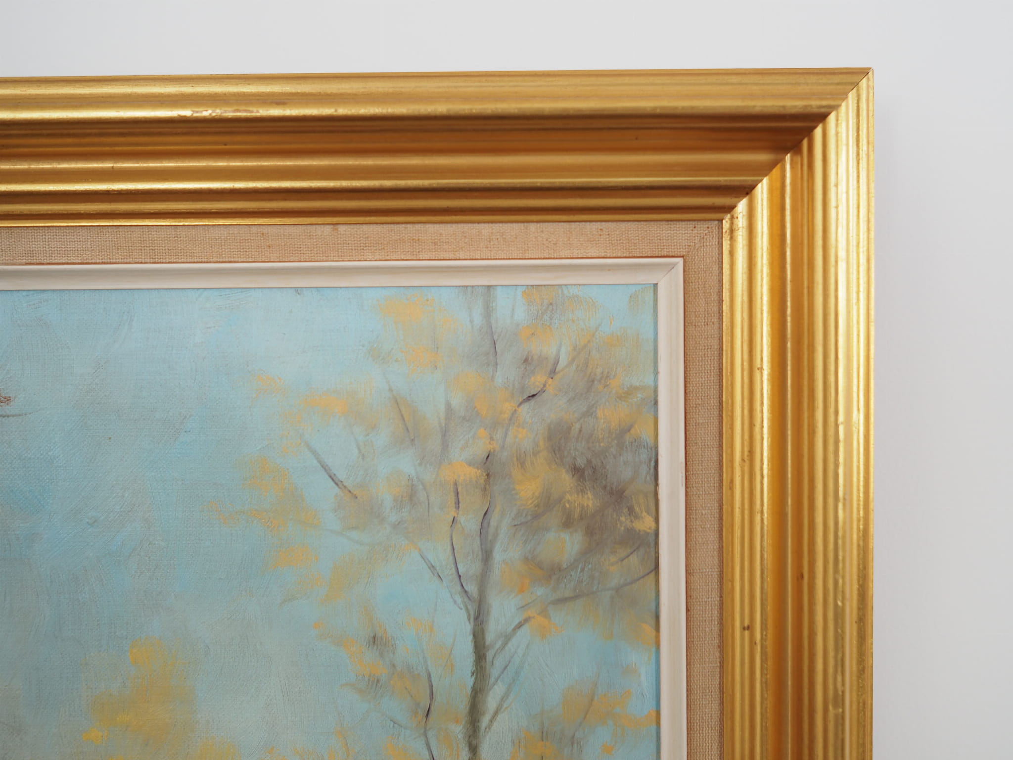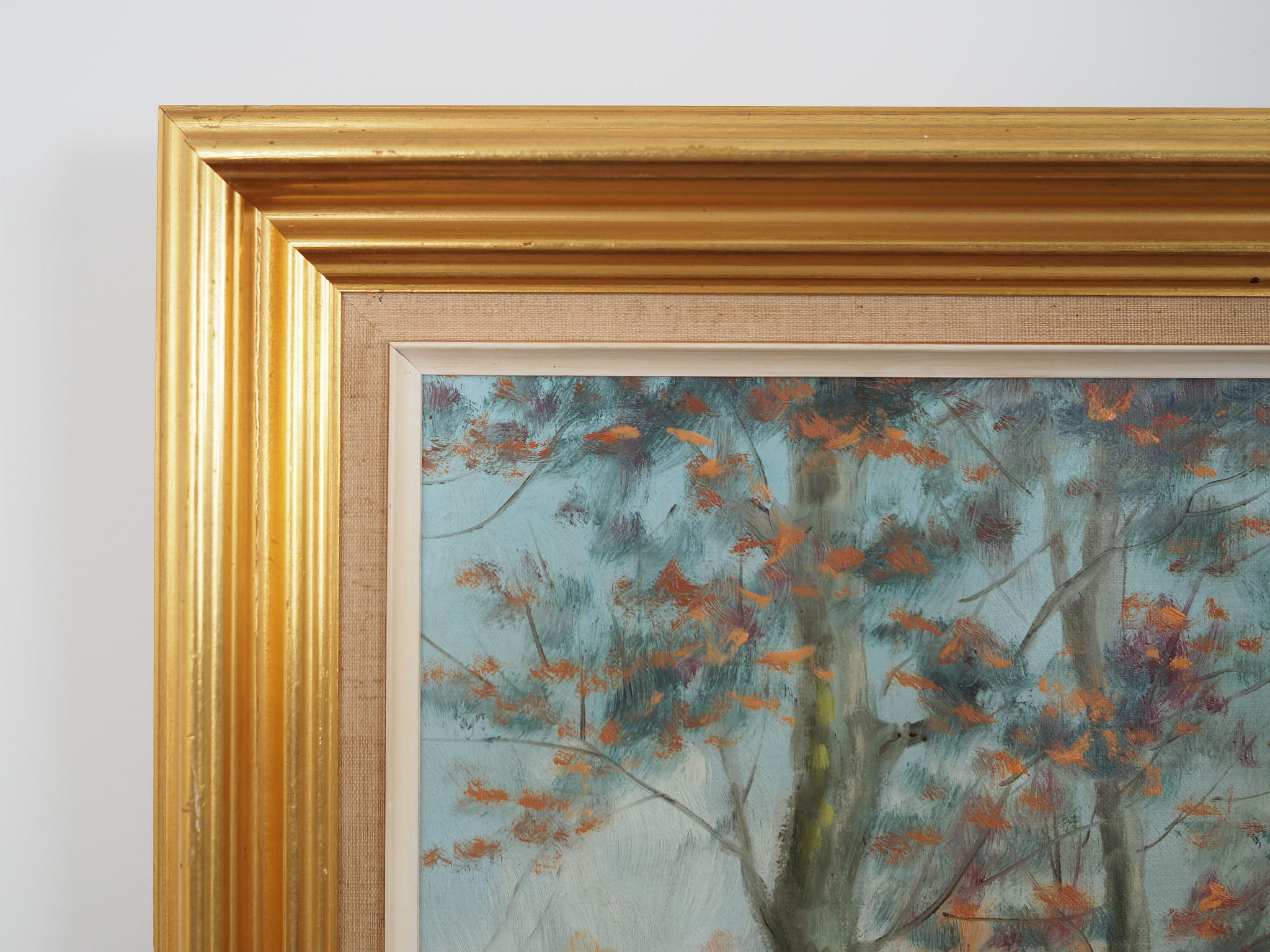 The frame was made of wood. The painting is maintained in autumn colours. The canvas is signed with the author's signature in the lower left corner. It is an ideal complement to the decoration of the living room, hallway or children's room.