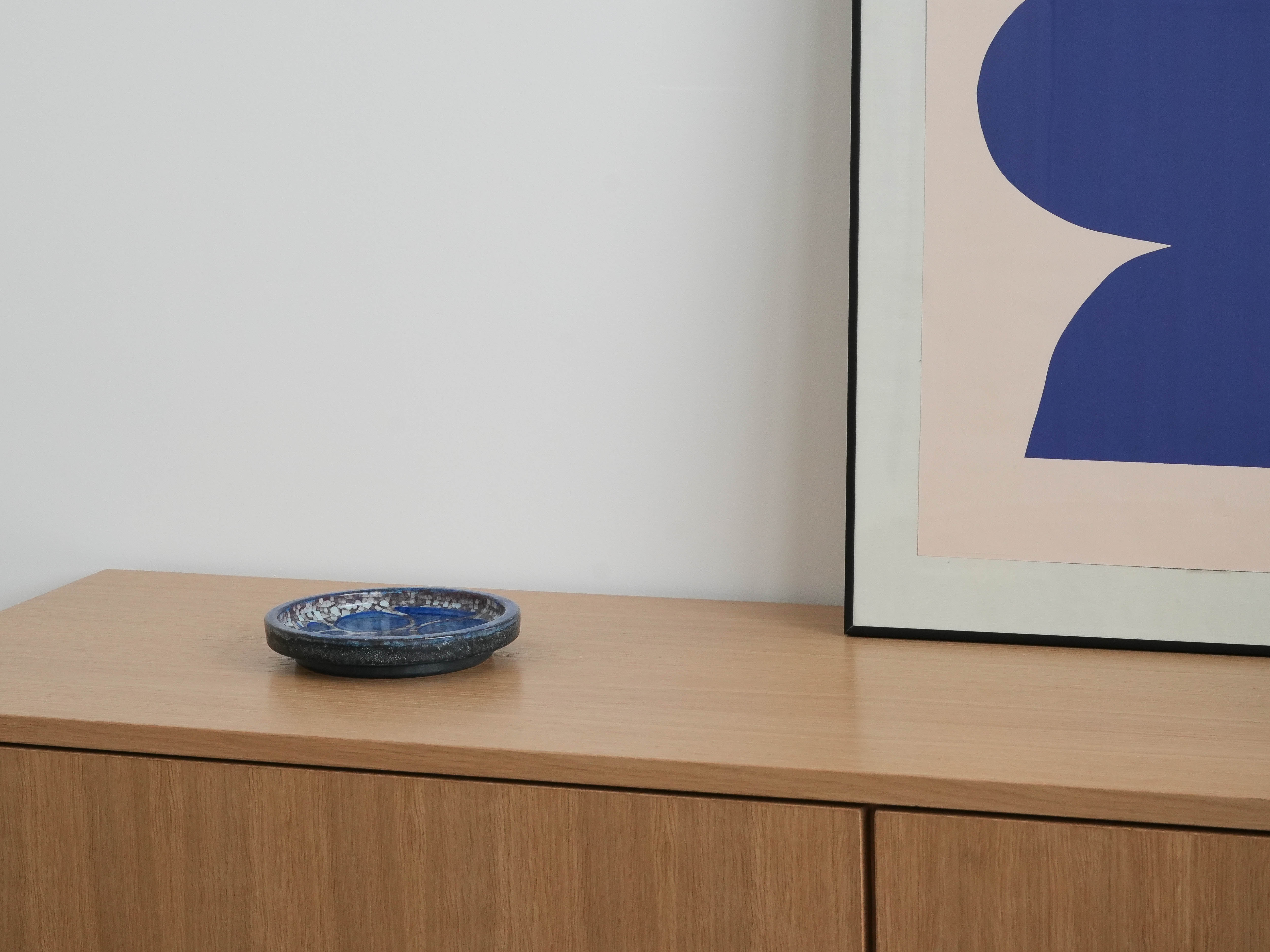 Glazed stoneware plate. Decorated with a geometric pattern in shades of cobalt, purple, and brown, with the artist's characteristic sense of color and texture. A collectible example of Danish artistic ceramics from the mid-20th century.