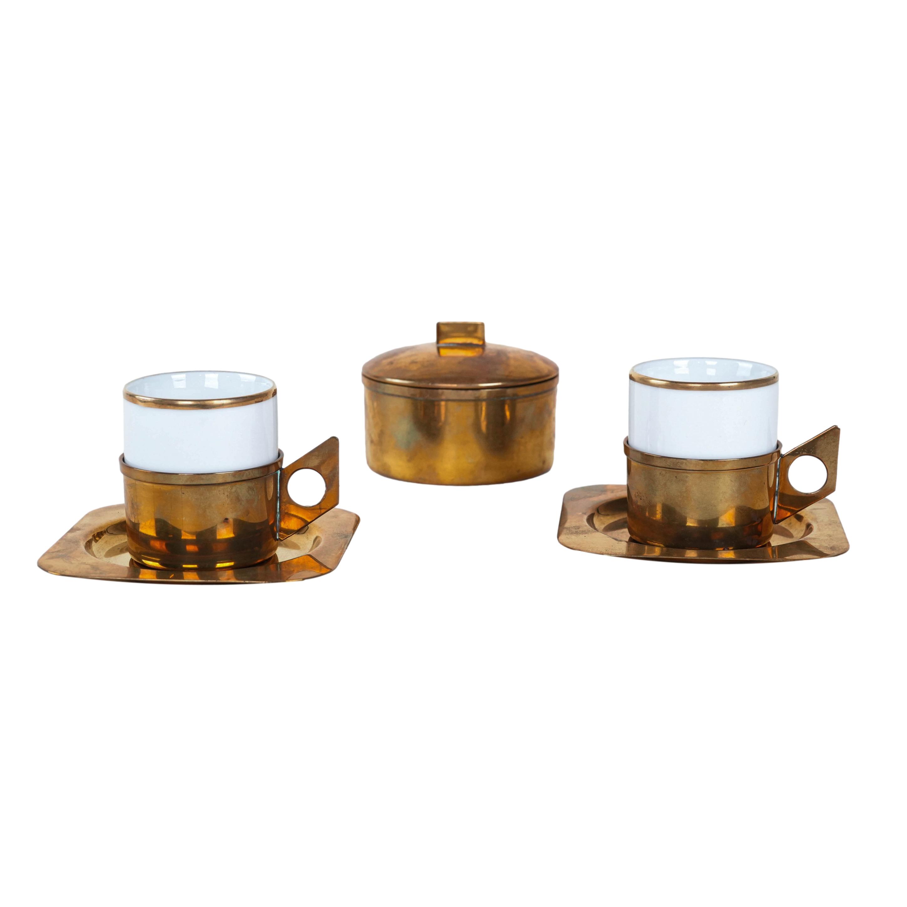 The set consists of two white porcelain cups set in geometric, gold-plated brass frames and a sugar bowl with a lid. The Claude Delvé per Delfi signature confirms the authentic modernist design of the 1970s, appreciated by collectors of mid-century design. An original vintage piece with high aesthetic and collector's value.