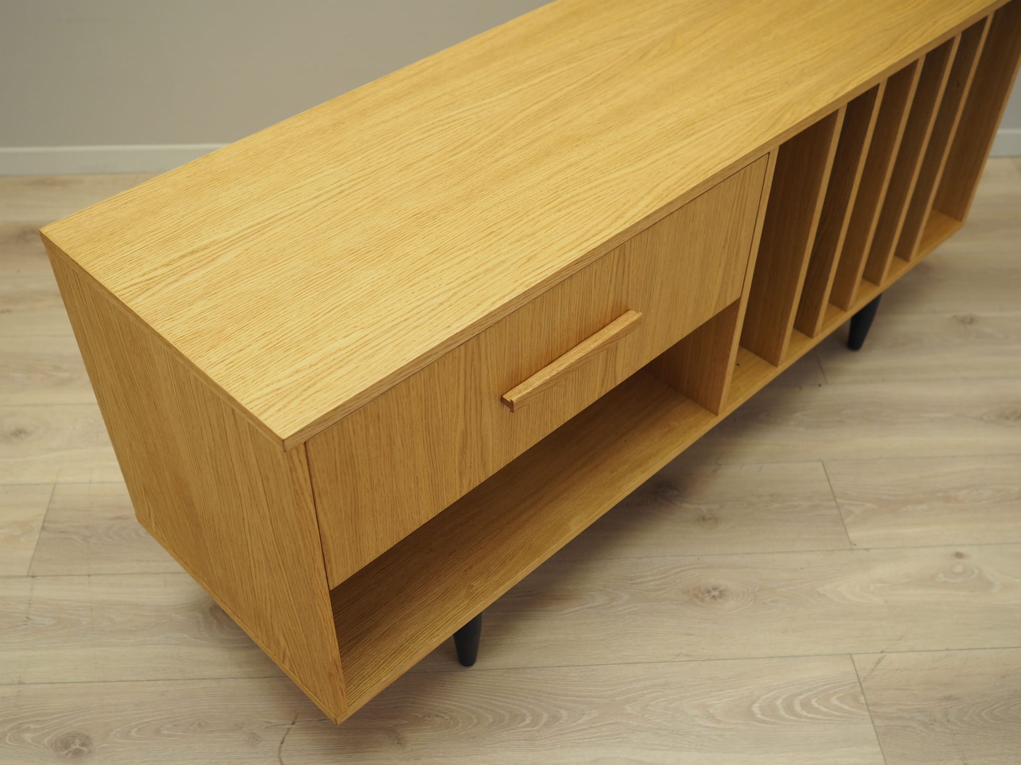 The structure is covered with oak veneer. The legs are made of solid wood stained black. Surface after refreshing. Inside, the space has been filled with adjustable record compartments and a capacious drawer.