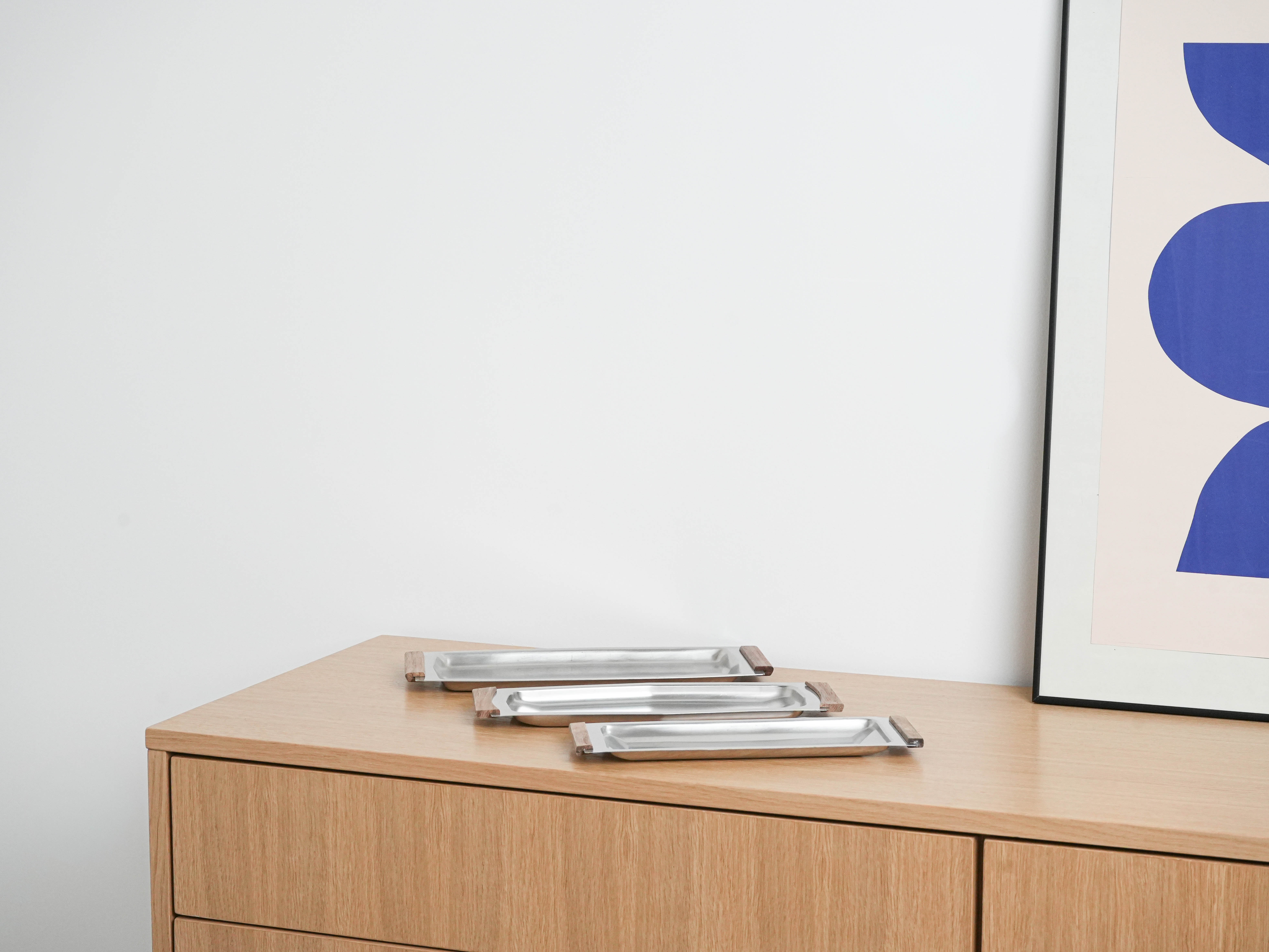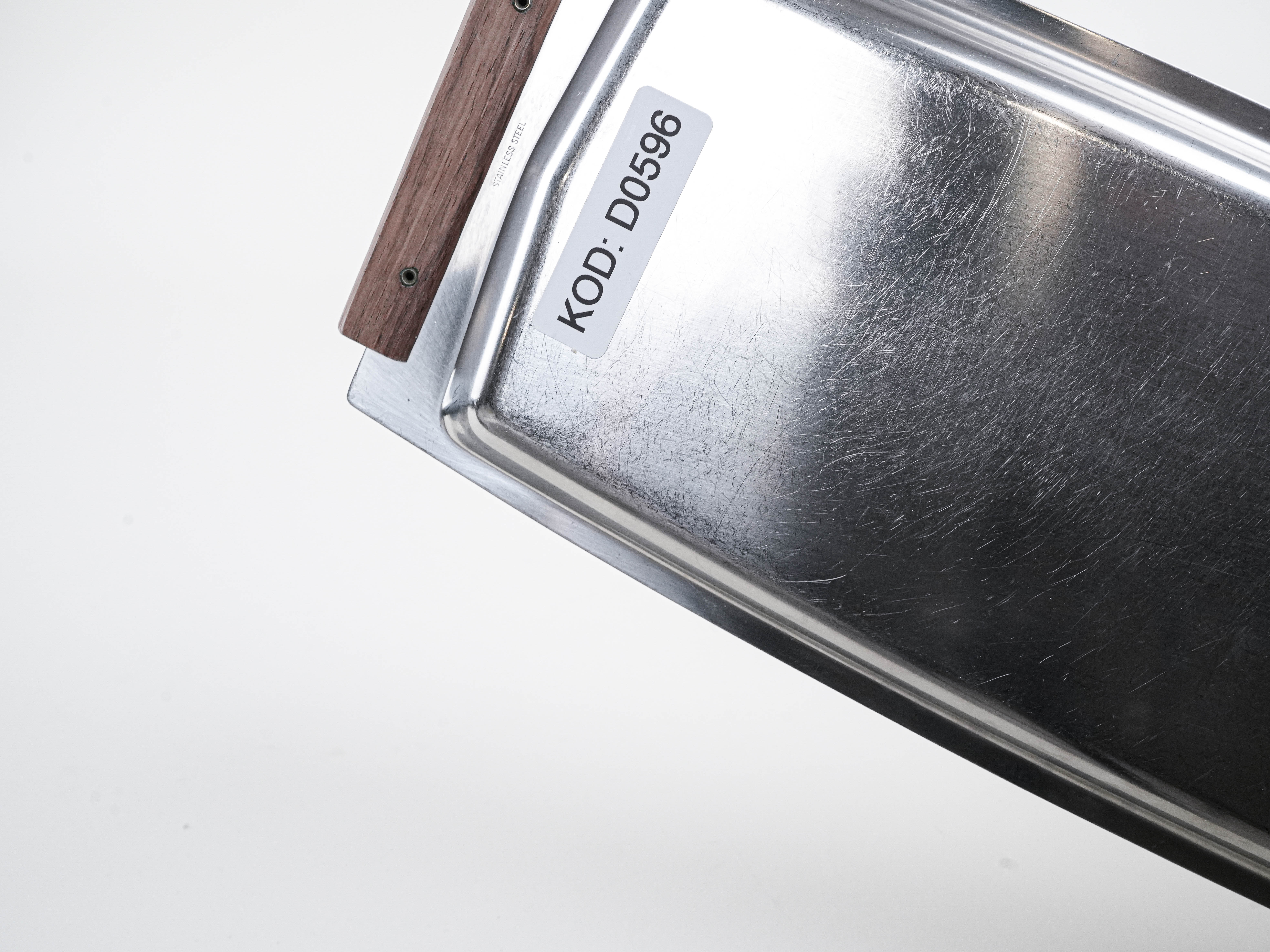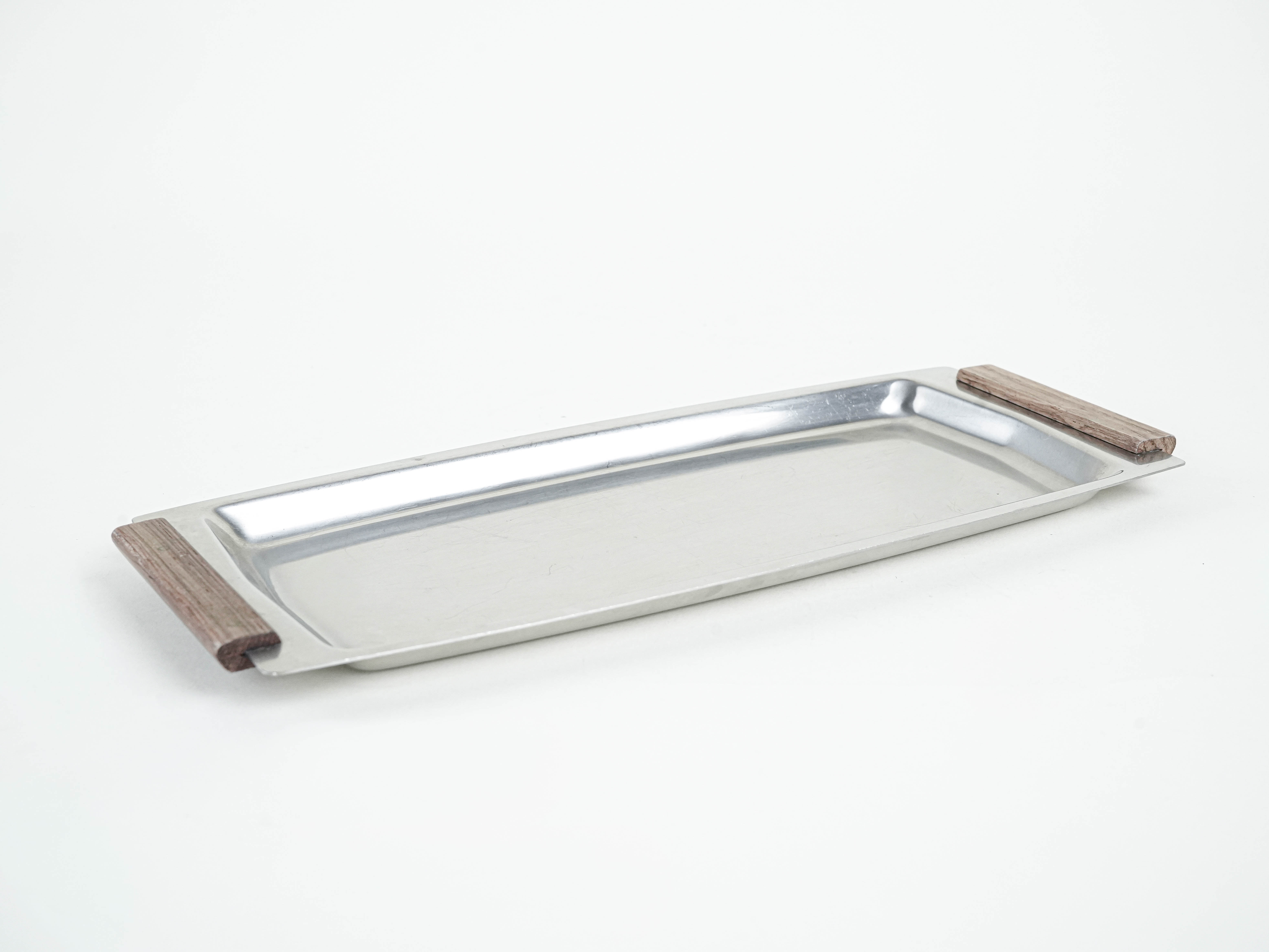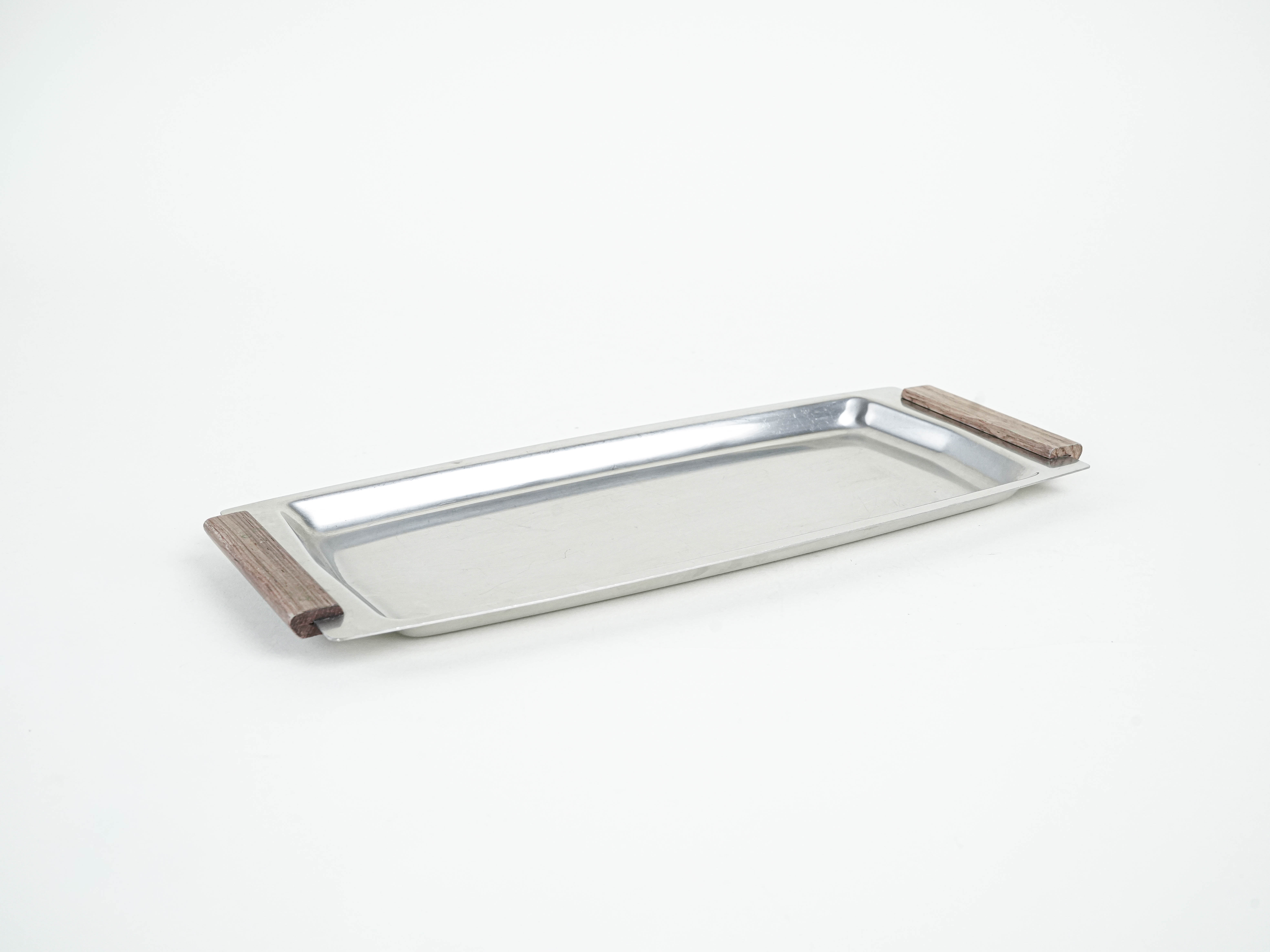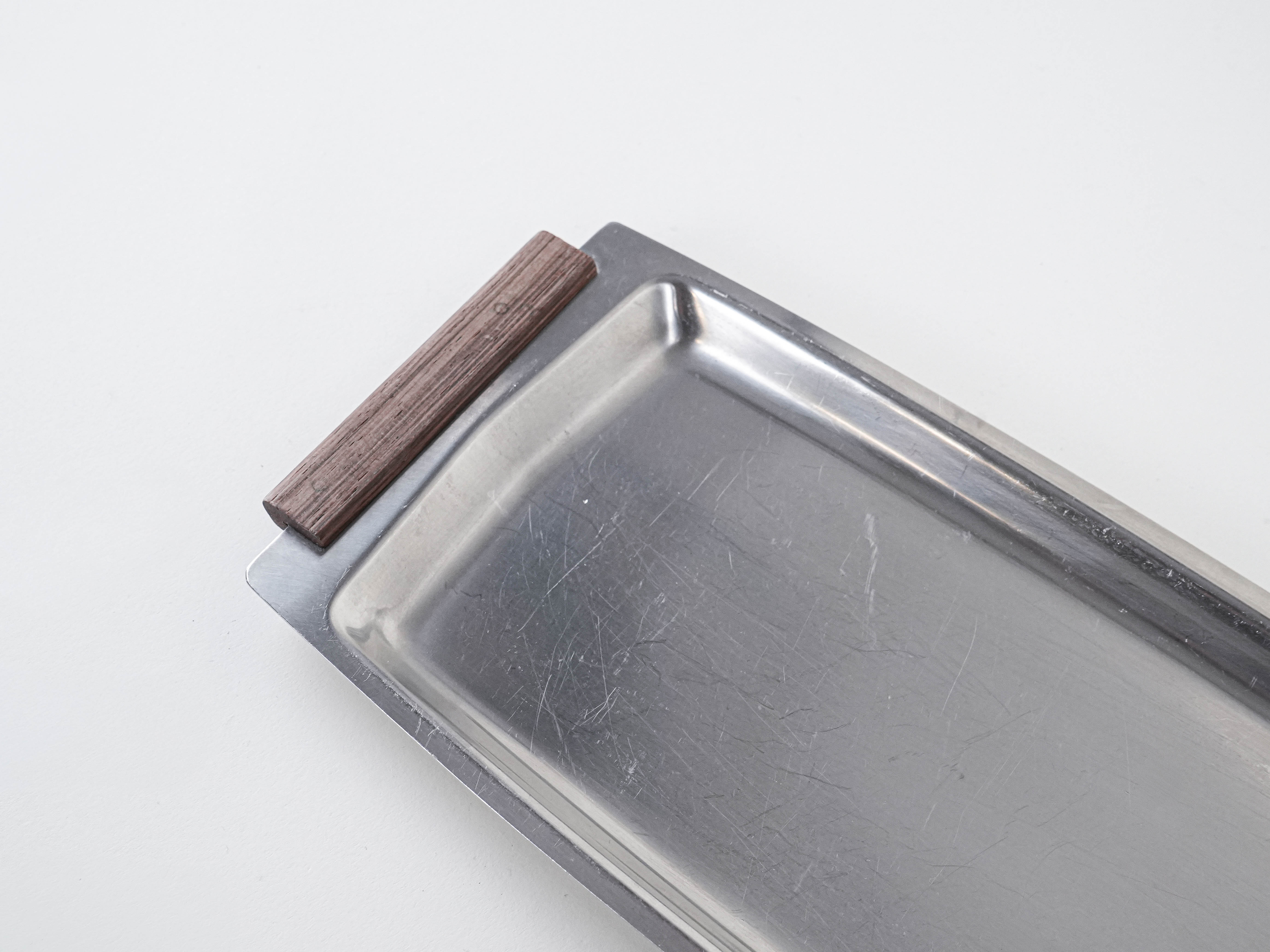 A sleek vintage stainless steel tray from the 1960s–70s, featuring minimalist wooden handles. Its simple, elegant form, in the spirit of mid-century Scandinavian design, makes it ideal both for serving and as a stylish decorative piece.