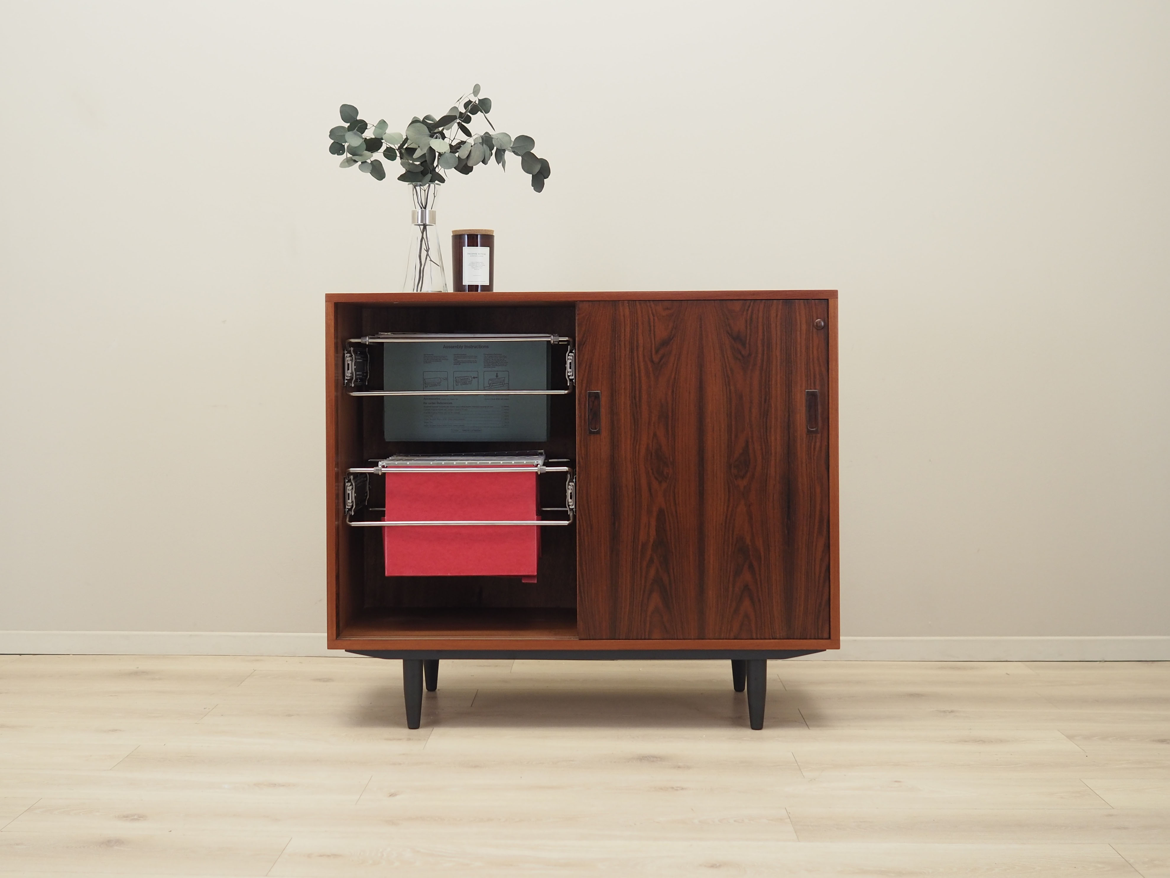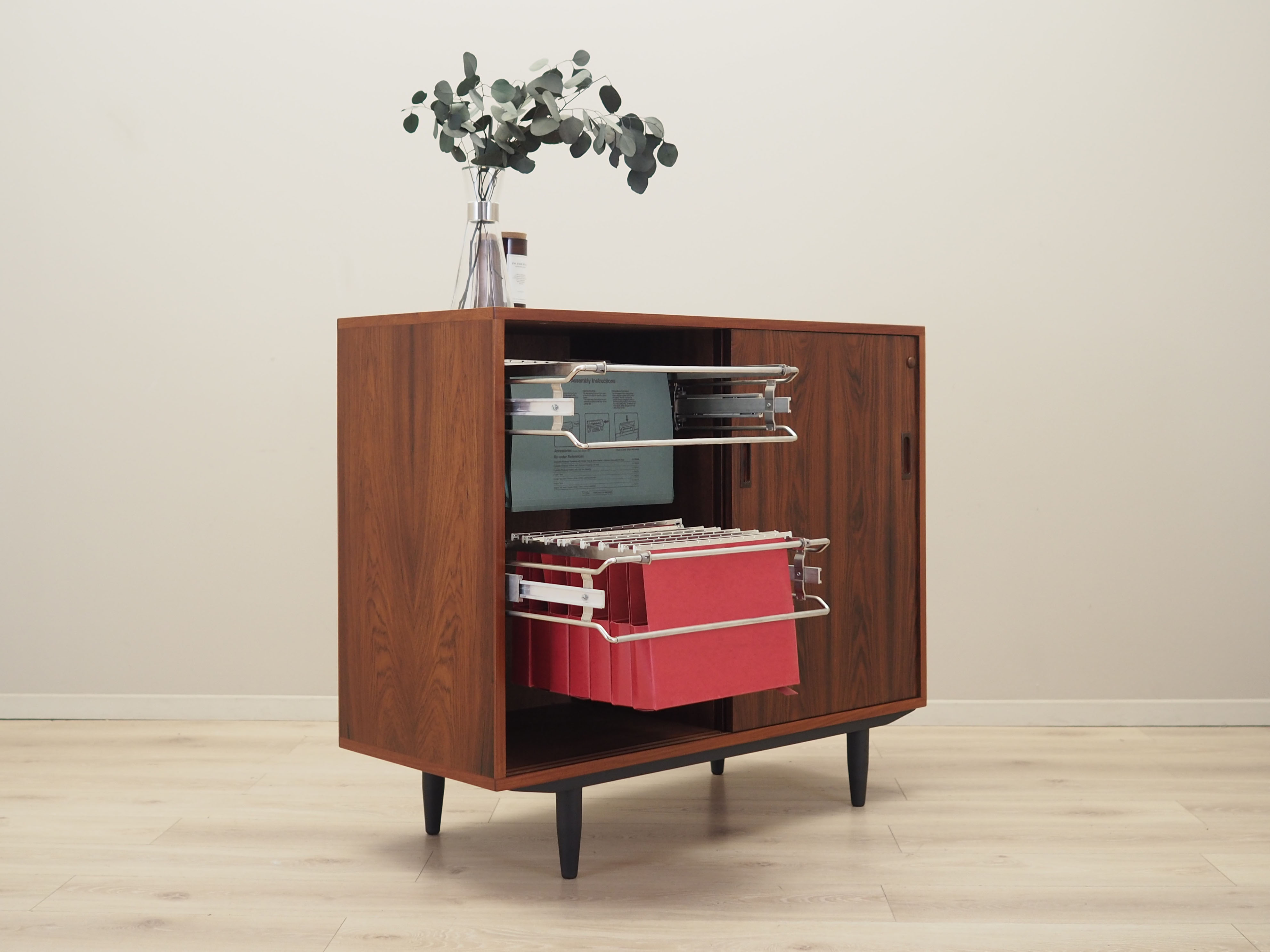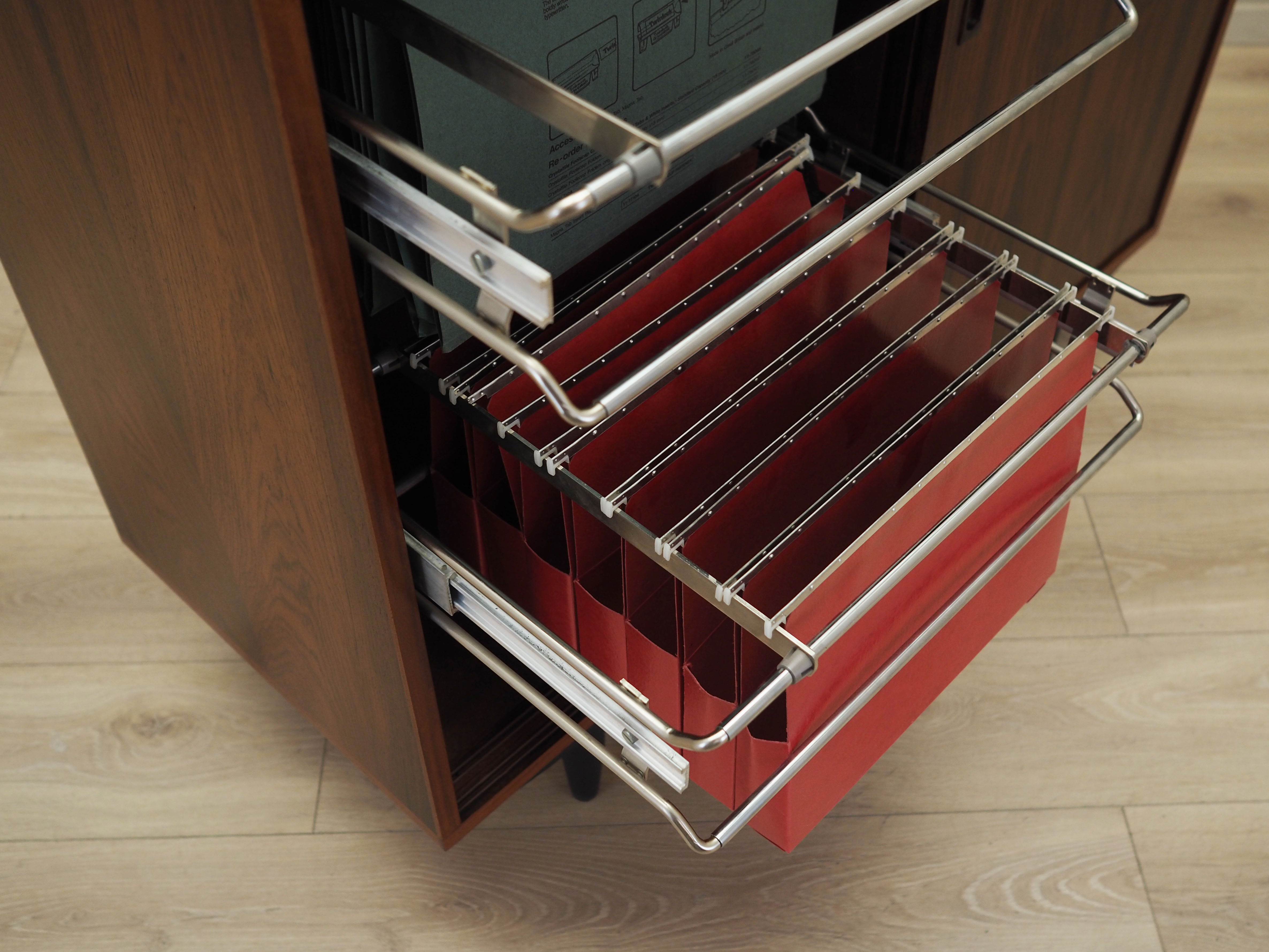 The structure is covered with rosewood veneer. The legs are made of solid wood stained black. The surface has been refreshed. Inside, the space is filled with five spacious drawers and hanging compartments for documents. The cabinet has a practical sliding door solution, which reduces the need for large free space in front of the furniture, while not limiting access to its interior. In addition, sliding doors are an ideal solution for using the furniture for audio equipment.
