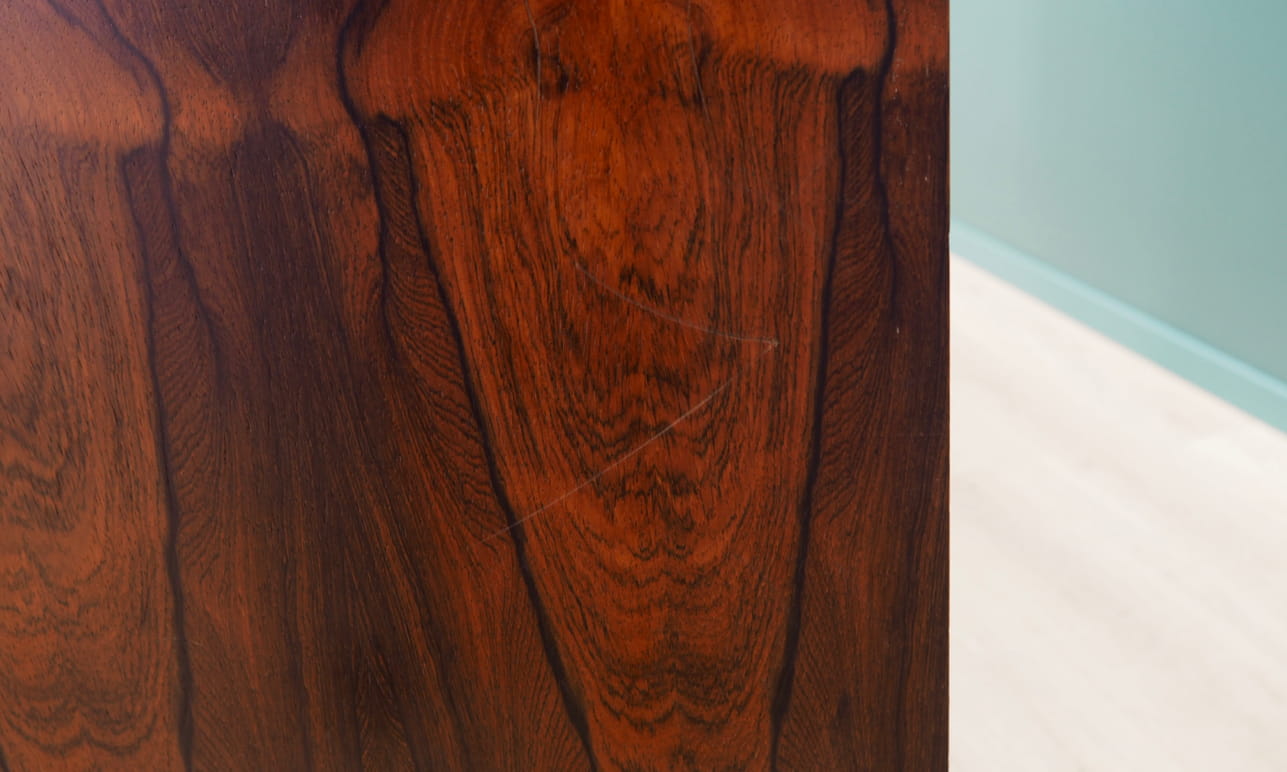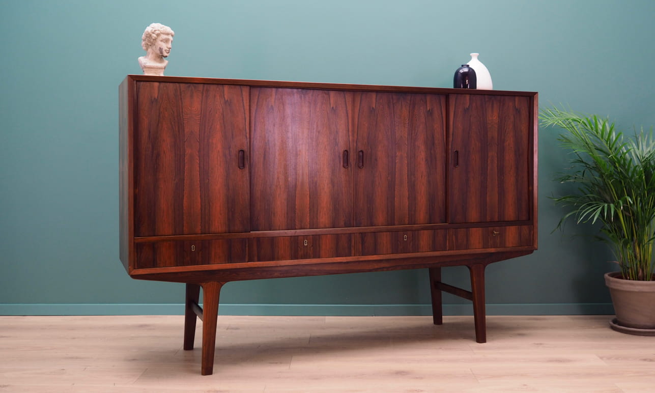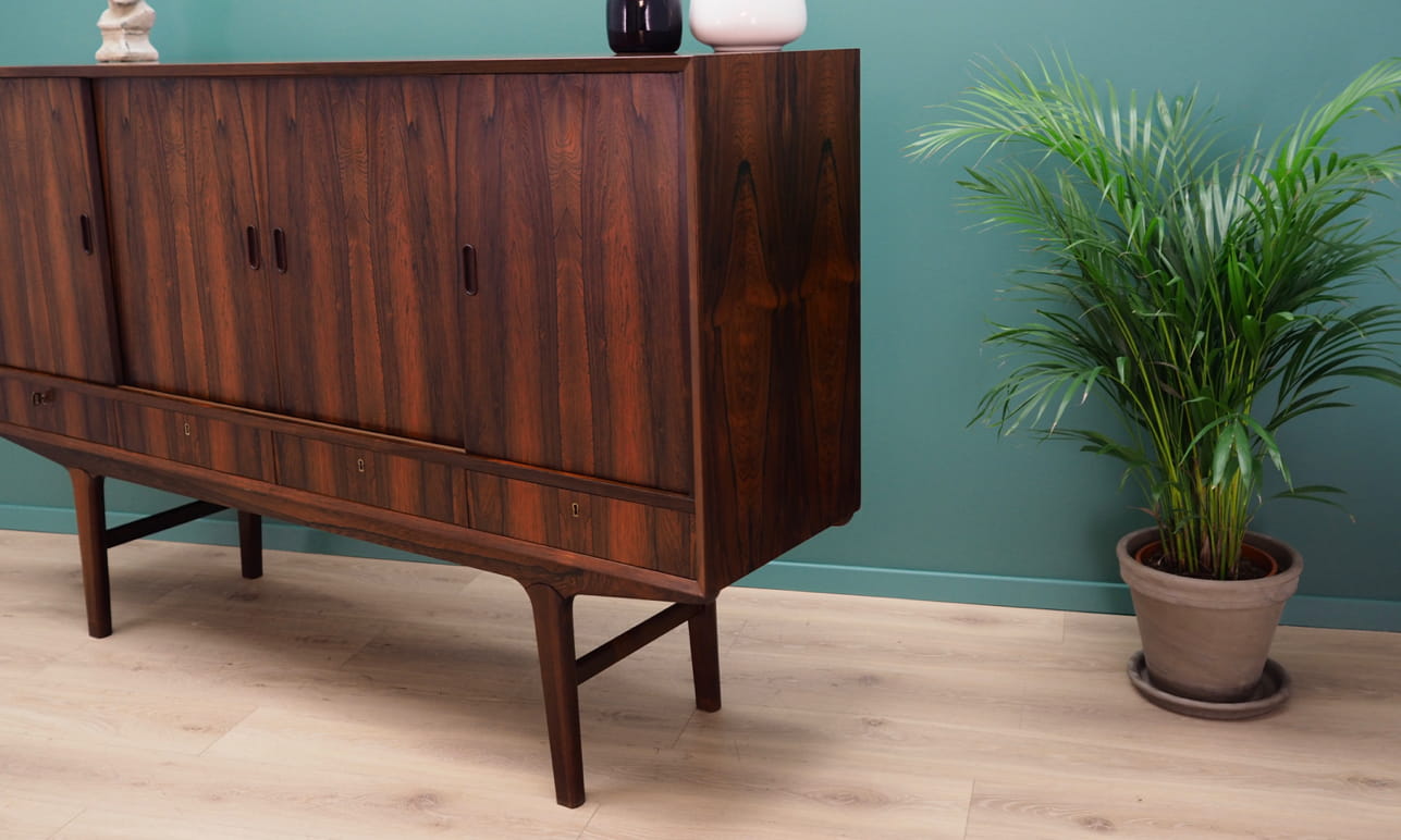 The structure is covered with rosewood veneer. The legs and handles are made of solid rosewood. The surface has been refreshed. Inside, the space has been filled with practical shelves and drawers. In the middle section there is a bar with a decorative mirror and practical drawers. The bar has been finished with rosewood veneer for prominence. In the lower part there are four useful drawers. The chest of drawers has a practical sliding door solution, which reduces the need to leave a large free space in front of the furniture while not restricting access to the interior. In addition, the sliding doors are the ideal solution for using the furniture for audio equipment.