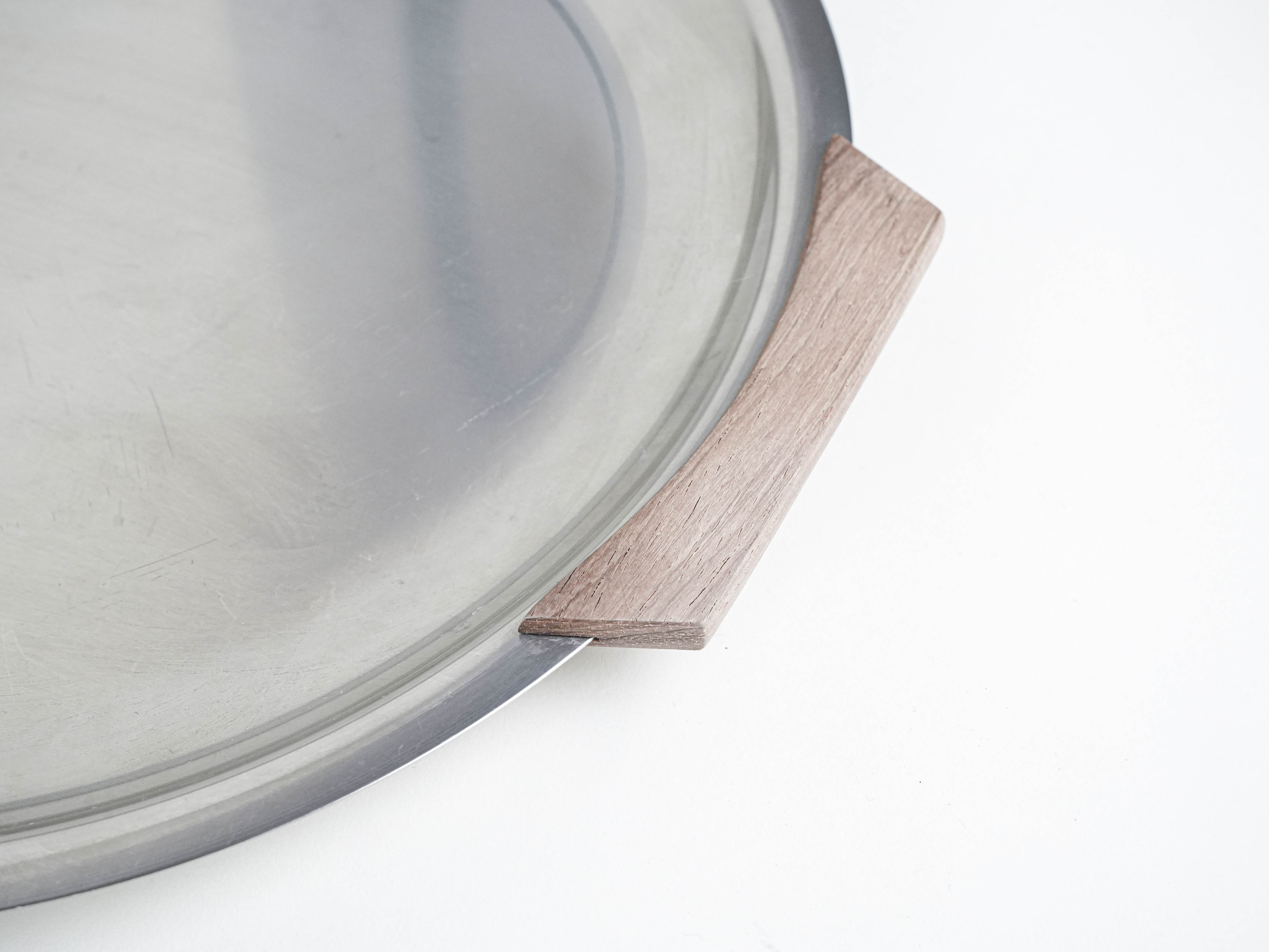 An elegant tray made of brushed stainless steel, finished with wooden handles. The combination of metal and wood is a classic of Scandinavian modernism – practical yet decorative. Perfect for serving or as a mid-century-style decorative piece.