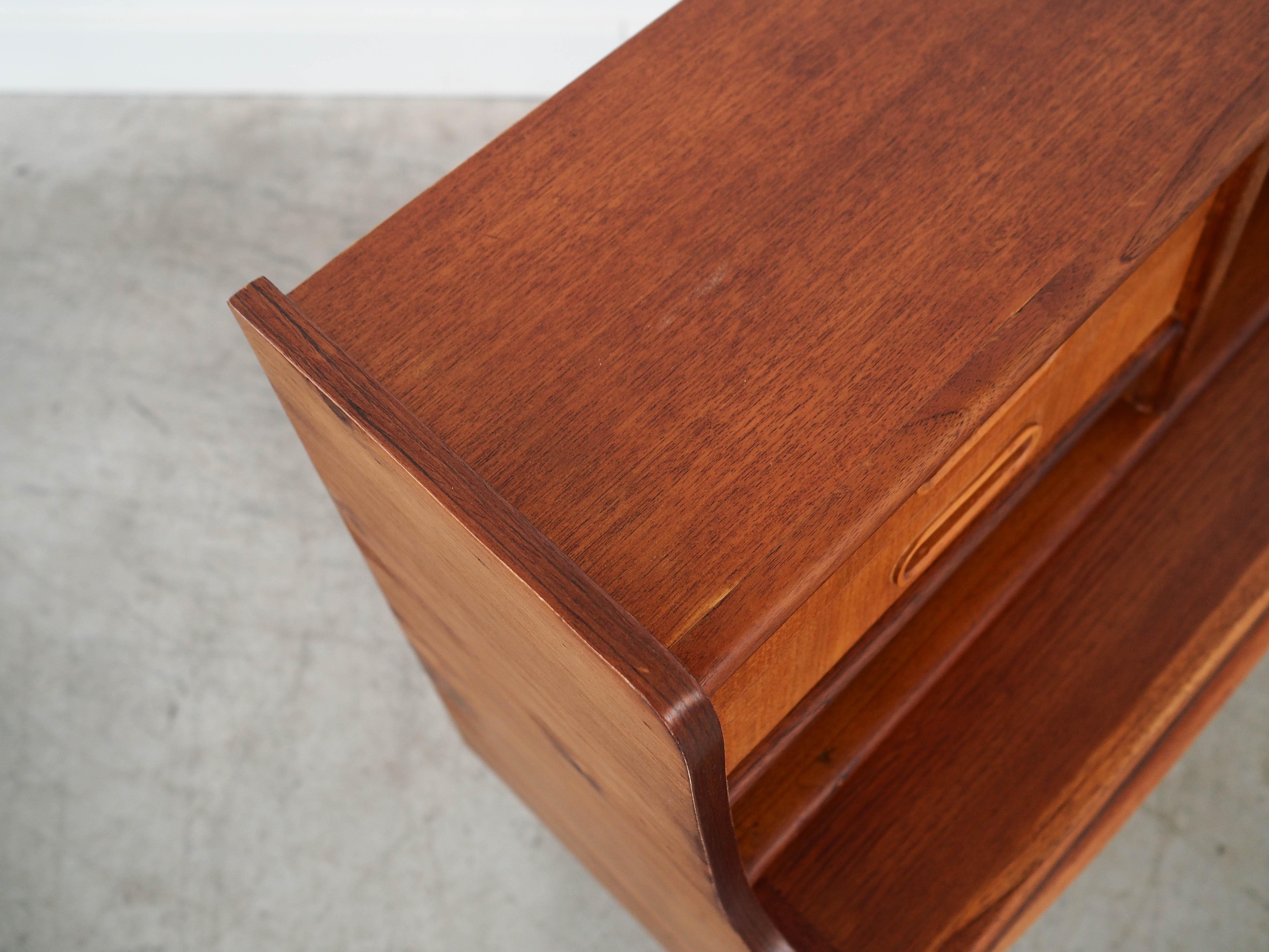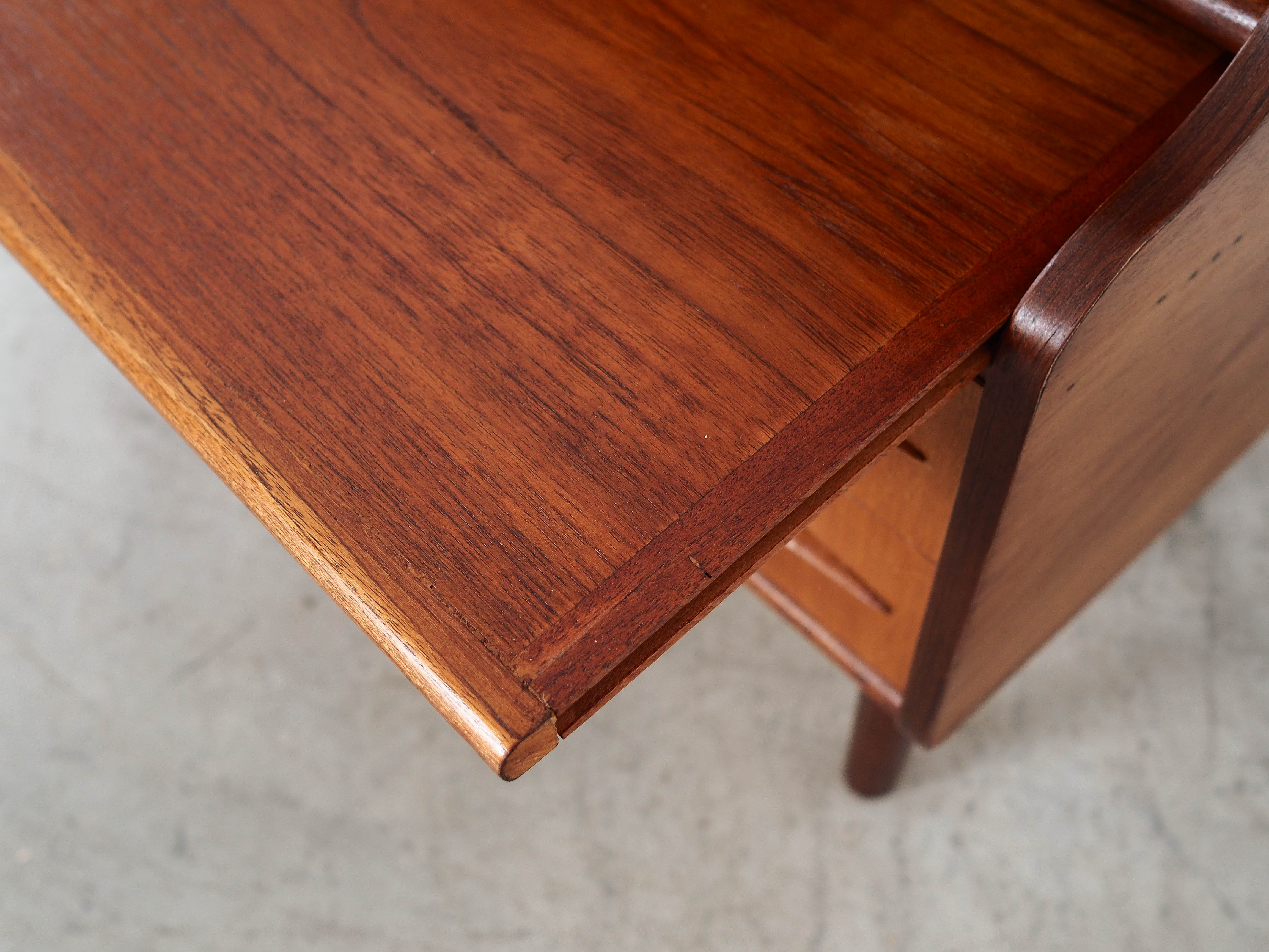 The frame is covered in teak veneer. The legs are made of solid wood. The surface has been refurbished. Inside, there are four spacious drawers. The secretary is one of the most versatile pieces of furniture ever designed in the history of Scandinavian design. It can serve as a chest of drawers, making it ideal as a cabinet for documents or toys in a child’s bedroom, or as a linen cupboard in the master bedroom. The pull-out top allows the secretary to be used as a desk. Furthermore, its timeless design will add character to any interior in which it is used. It is perfect as a functional piece of furniture for a child, encouraging learning and creative play.