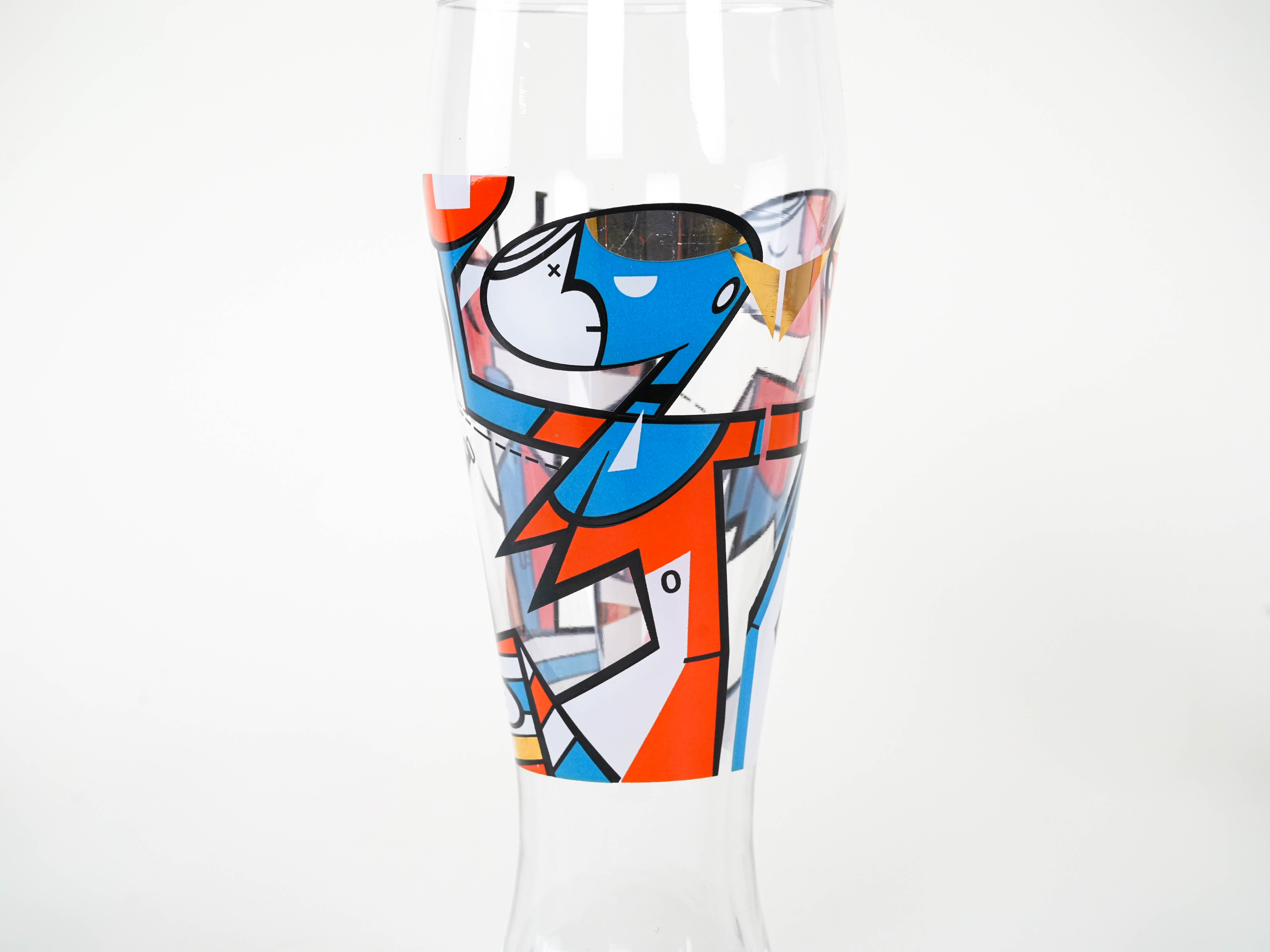 Two tall glasses from a collector’s edition—one signed by Ritzenhoff, the other by Maarten Vrolijk, a Dutch designer known for his bold, expressive designs. Colorful, abstract motifs give them an artistic character and make them perfect for both everyday use and as a designer piece in a glass collection.