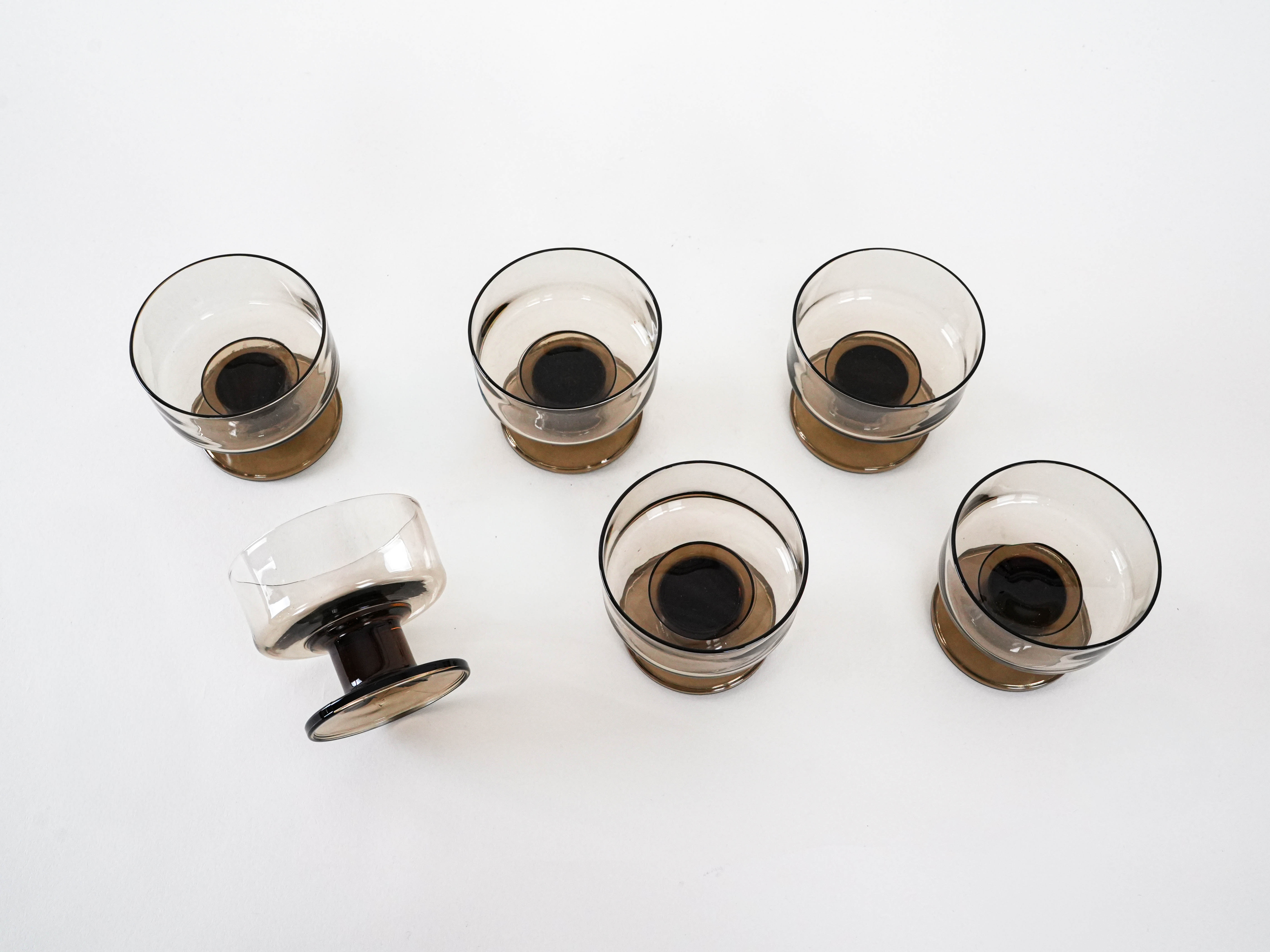 A set of 6 vintage glasses from the 1970s, made of glass. The slender, elegant shape of the glasses highlights the decorative nature of the glass, whilst the slightly translucent texture lends them a sense of lightness and a subtle sheen. The bowls are perfect for serving desserts, ice cream, mousses or cocktails, whilst also serving as an eye-catching decorative element on a table or in a display cabinet. Ideal for lovers of vintage glassware and 1970s retro design.