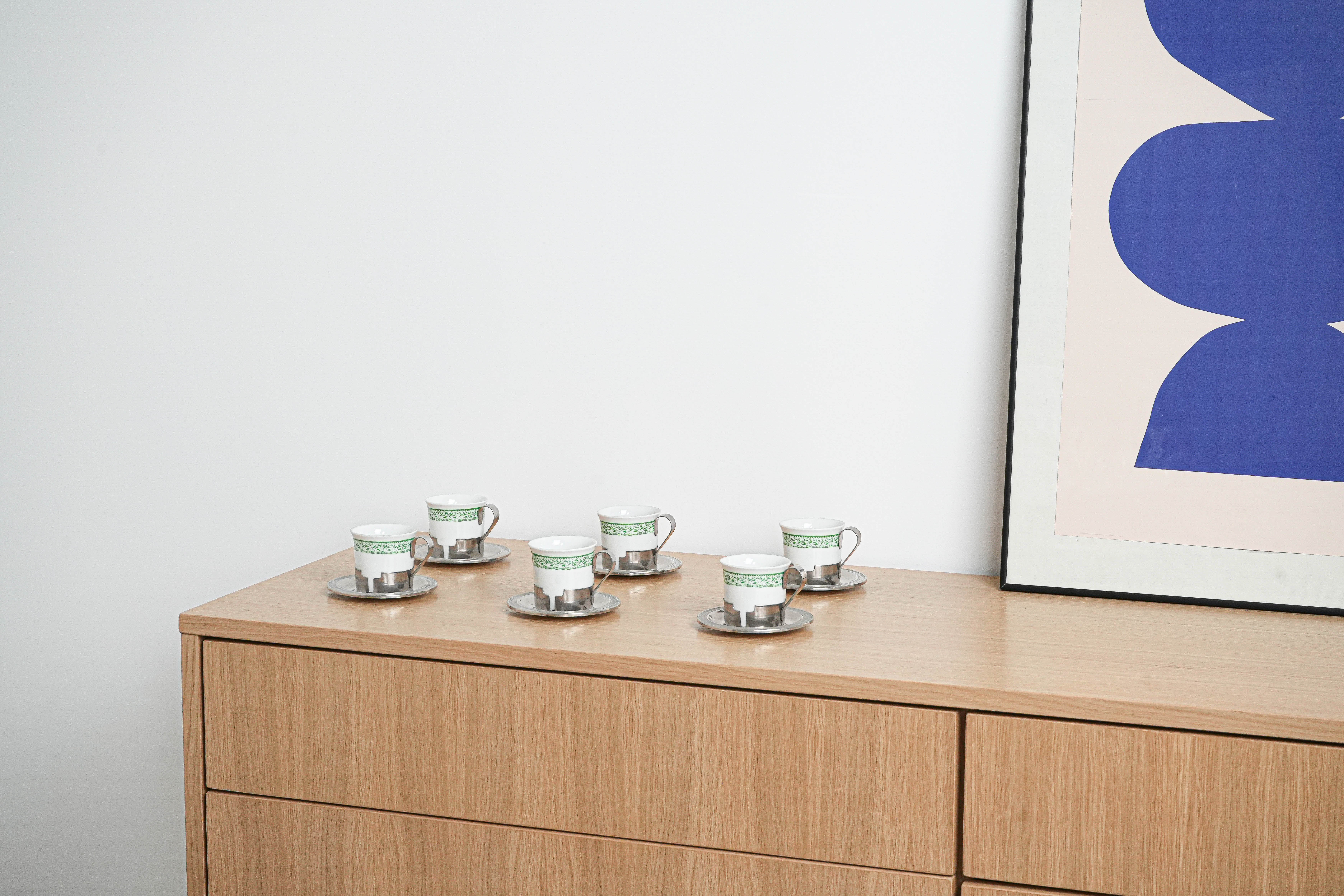 A set of 6 porcelain espresso cups. Cups with metal handles and stainless steel saucers. Porcelain decorated with a classic green floral ornament in the style of the 1970s–1980s. The combination of cool steel and an elegant pattern gives the set a timeless character – perfect for serving aromatic espresso in a retro atmosphere.