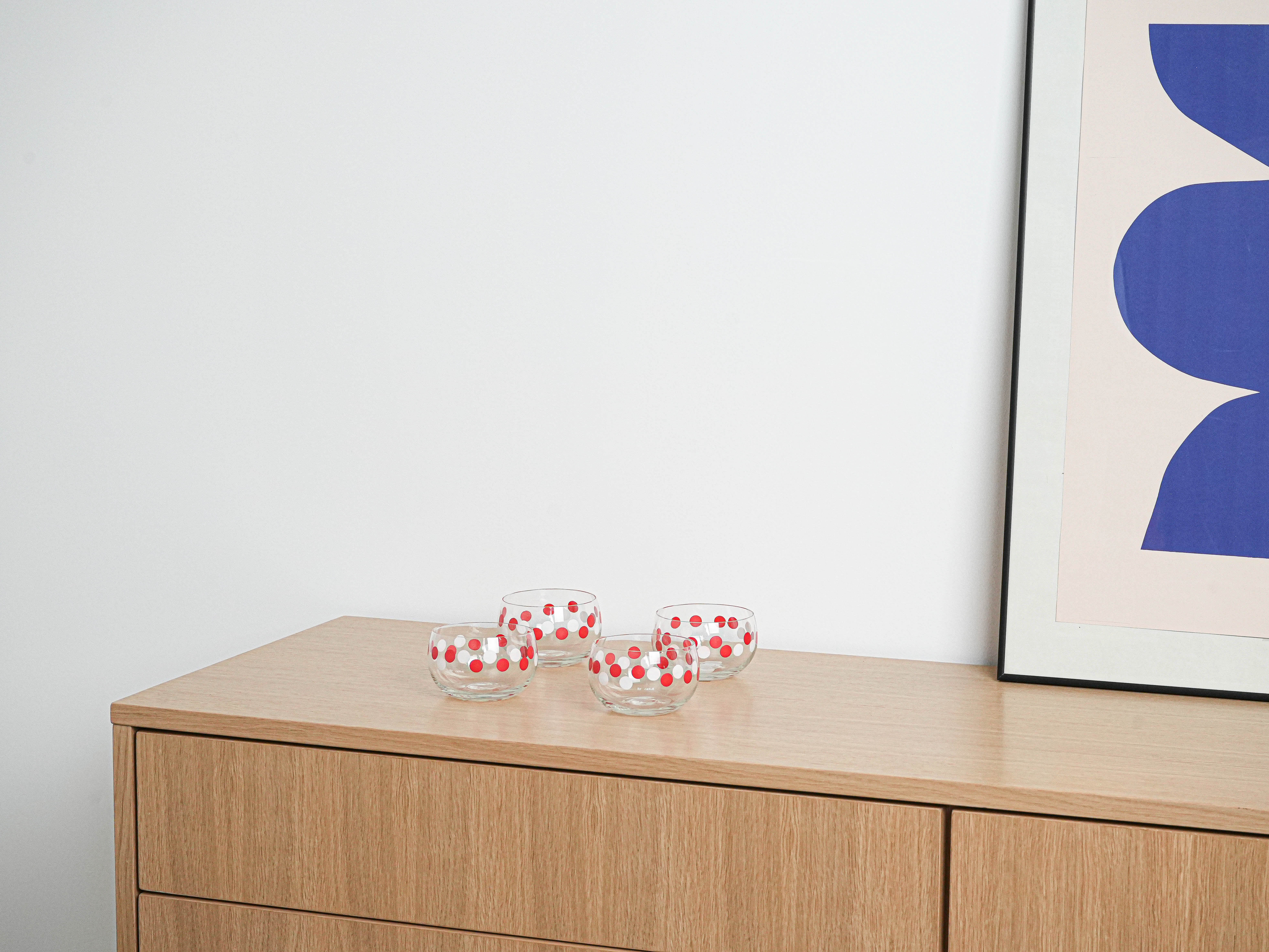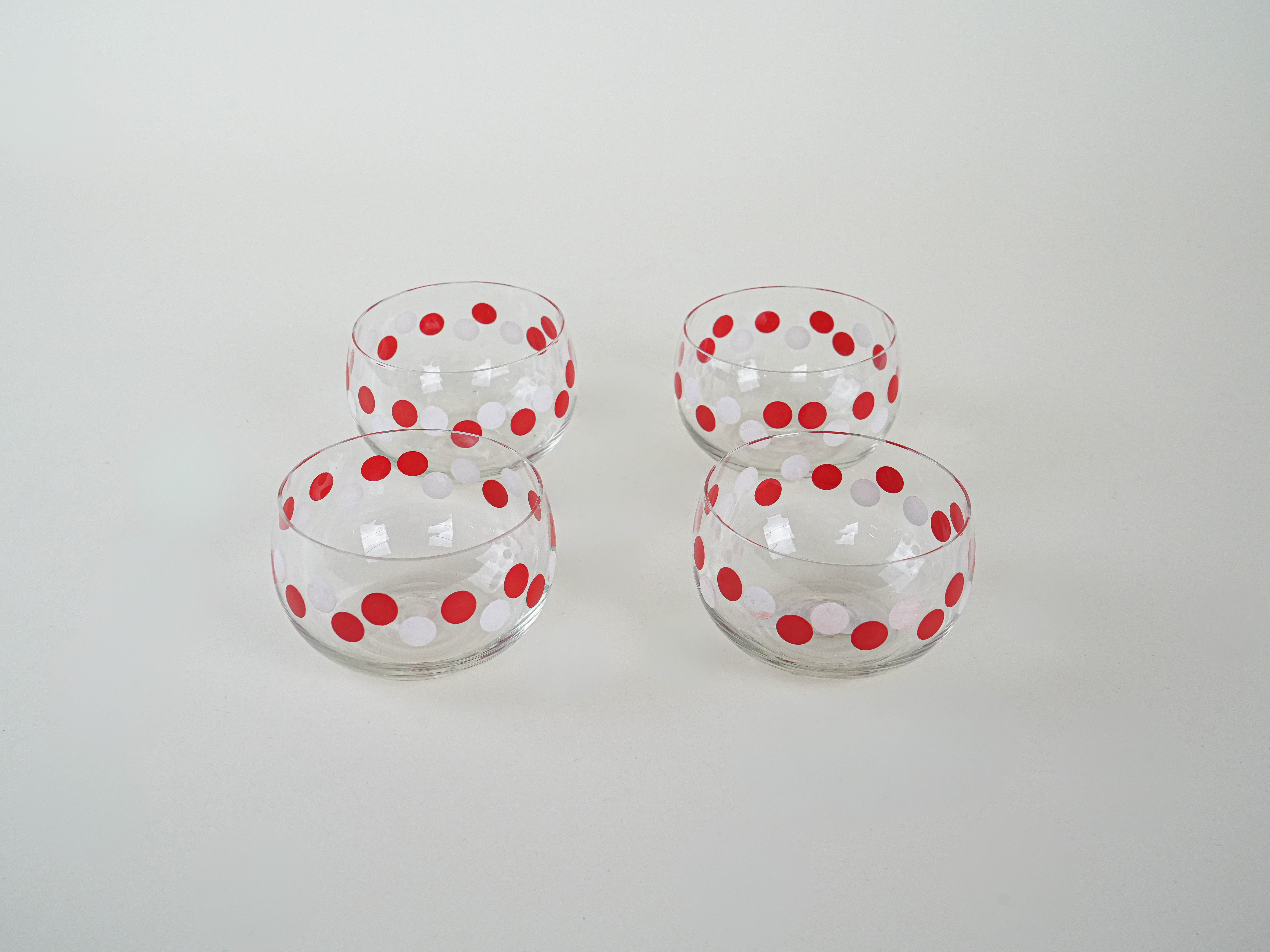 A set of four glass bowls from the 1970s–1980s, decorated with a geometric pattern of red and white polka dots. Perfect for desserts, snacks or serving fruit, they add a touch of retro style and colour to the table. Their simple shape and vibrant decoration make them perfect for both everyday use and vintage-style gatherings.