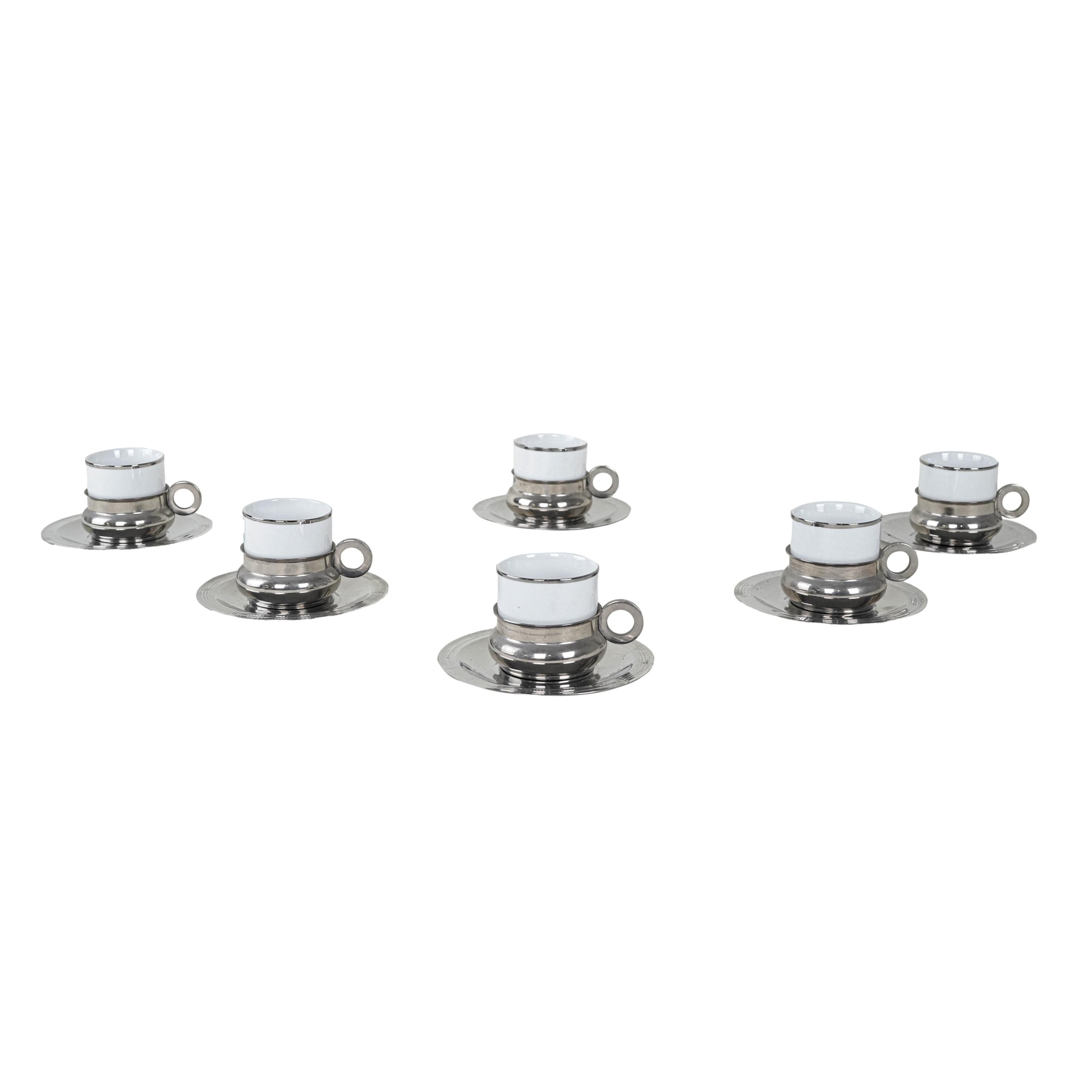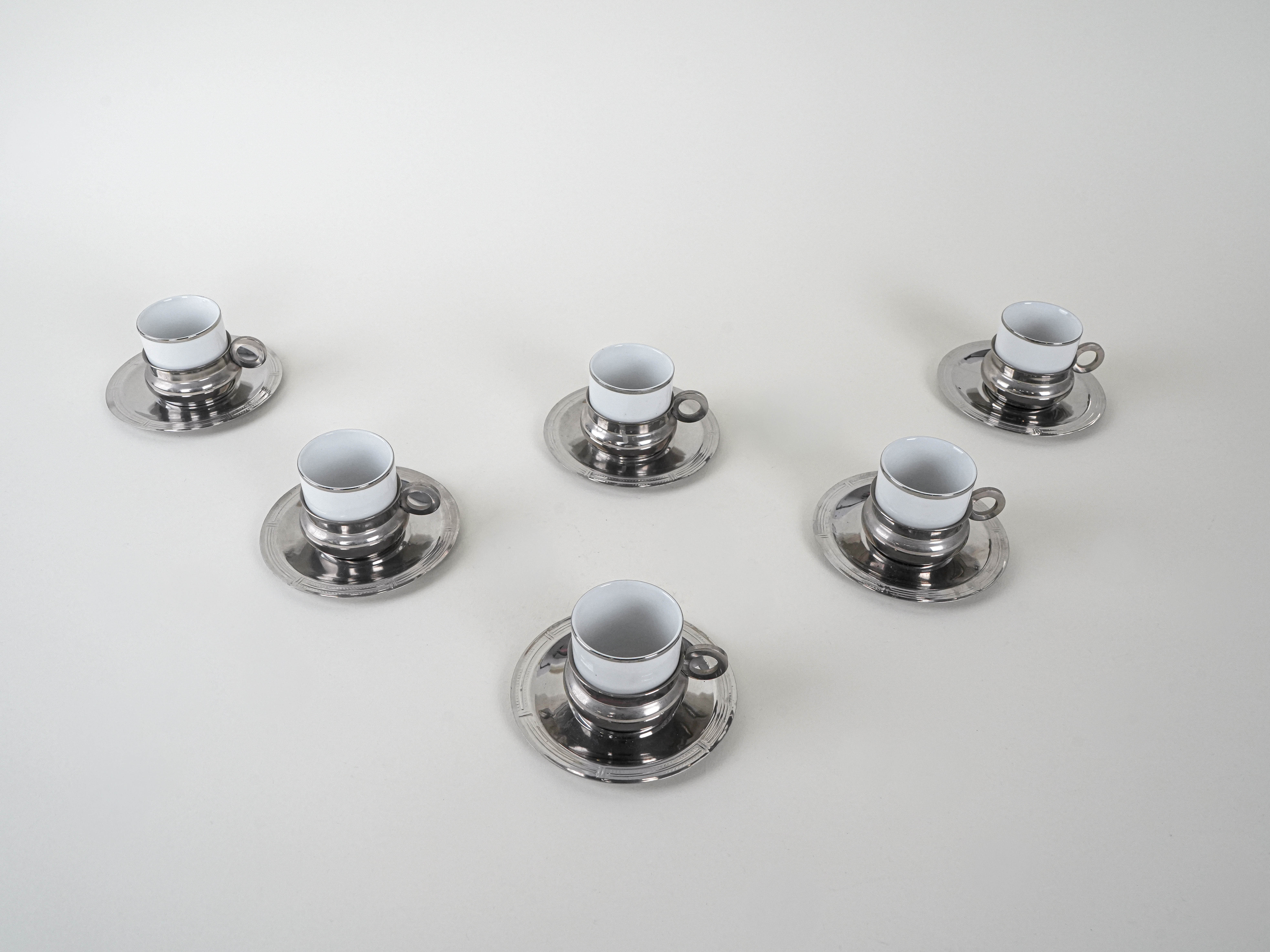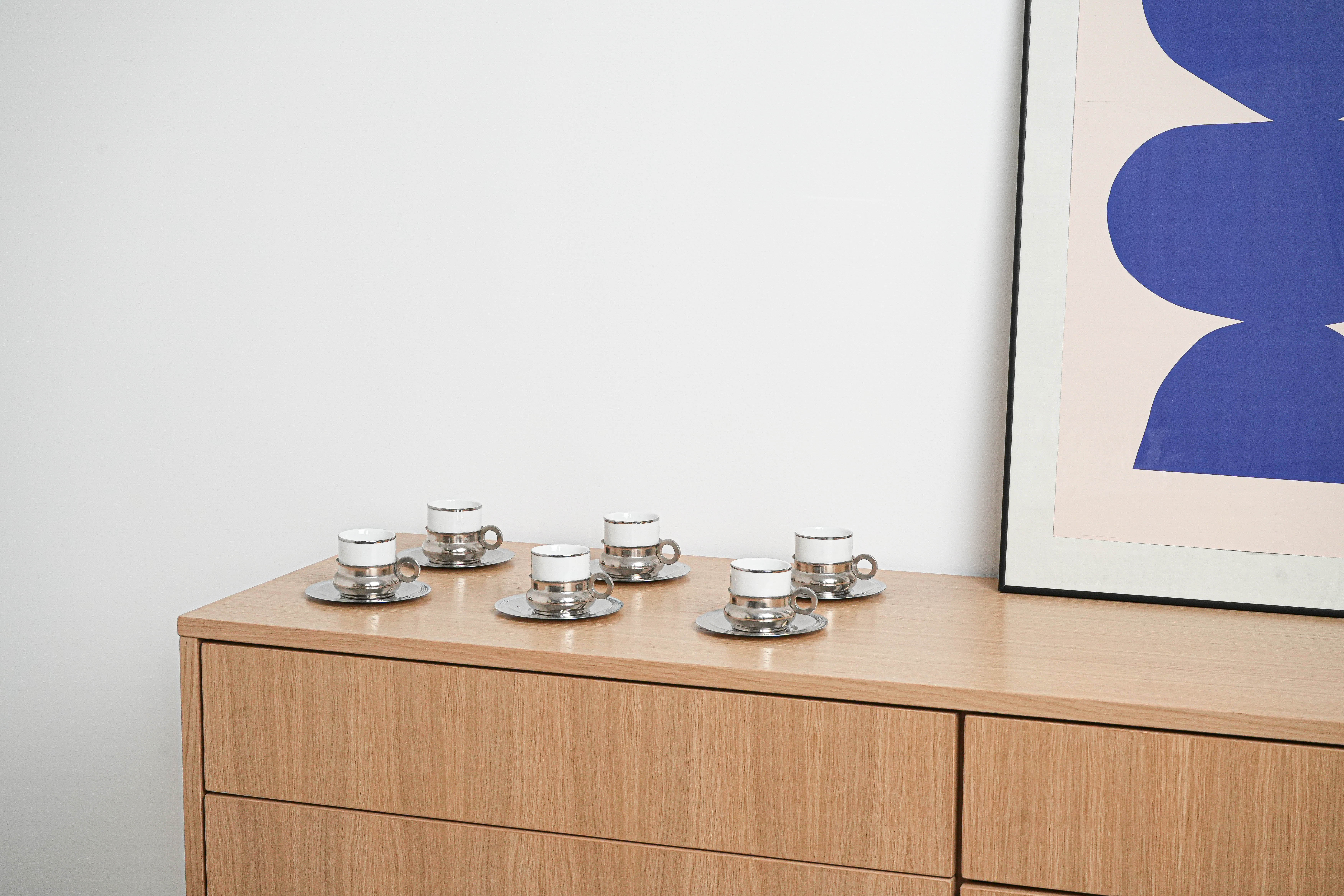 A set of 6 espresso cups made of white porcelain set in elegant stainless steel frames, with matching saucers. The minimalist form with a delicate silver rim refers to the modernist design of the 1970s and 1980s. A stylish set that combines functionality with refined simplicity – perfect for serving coffee in a retro atmosphere.