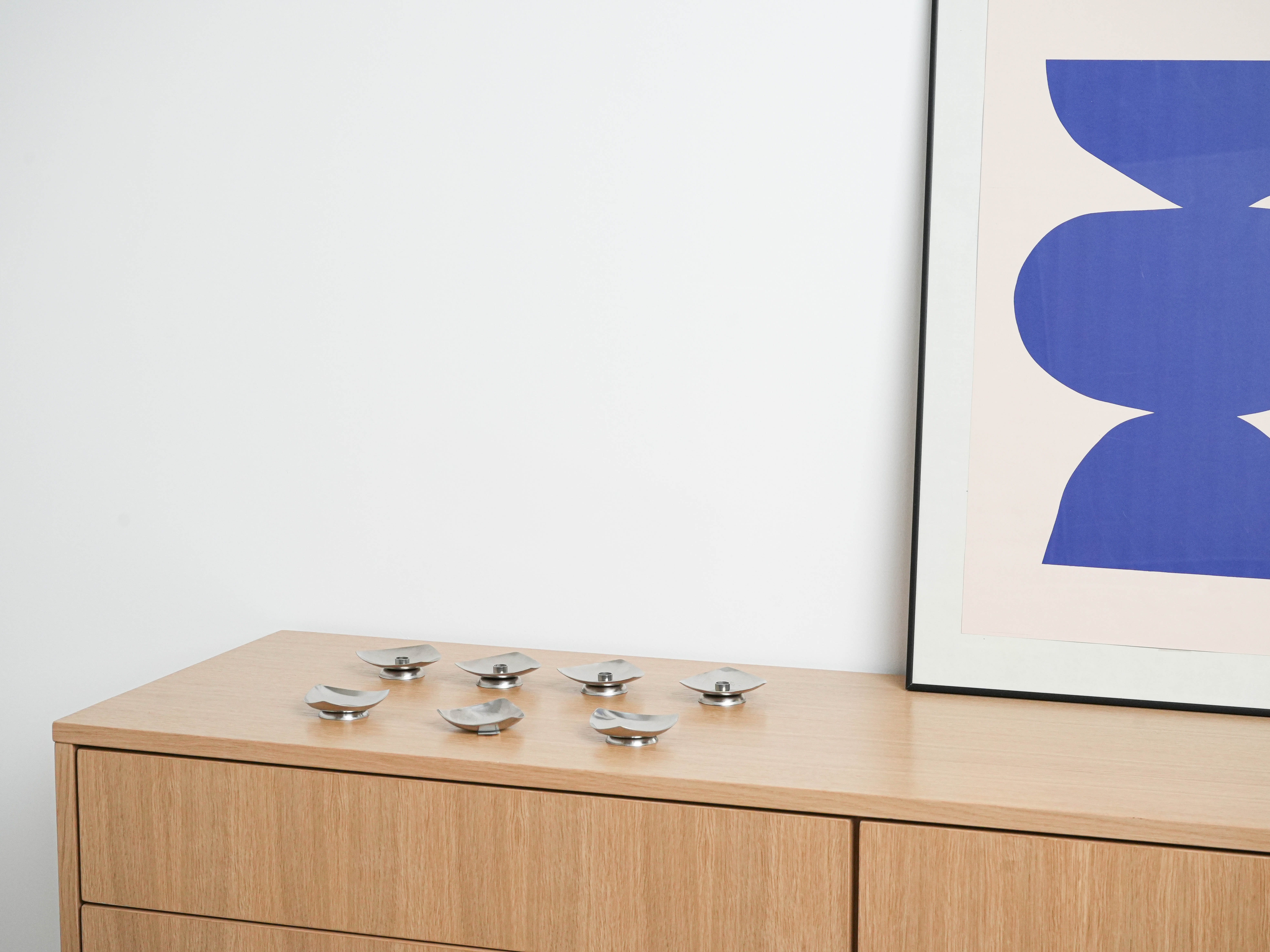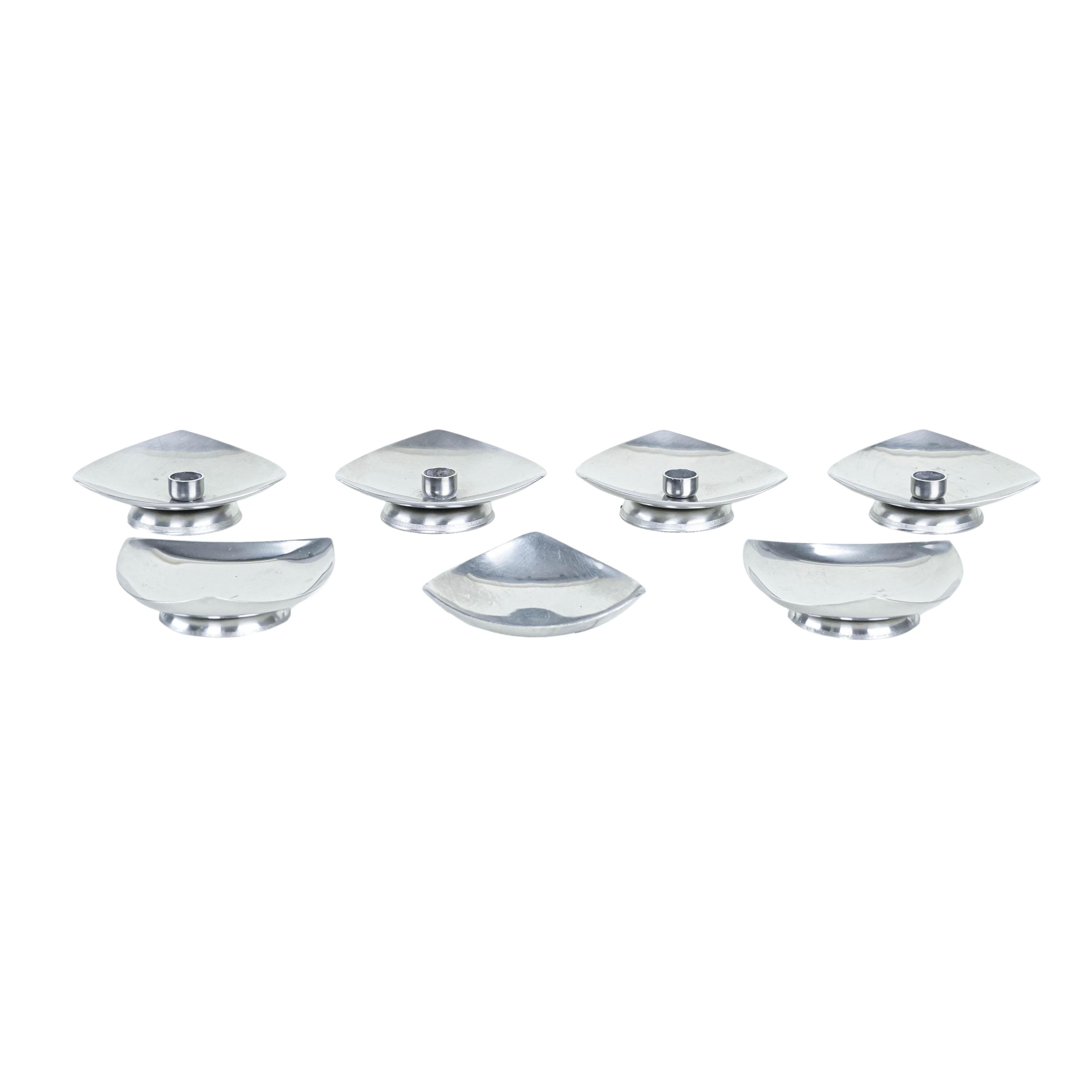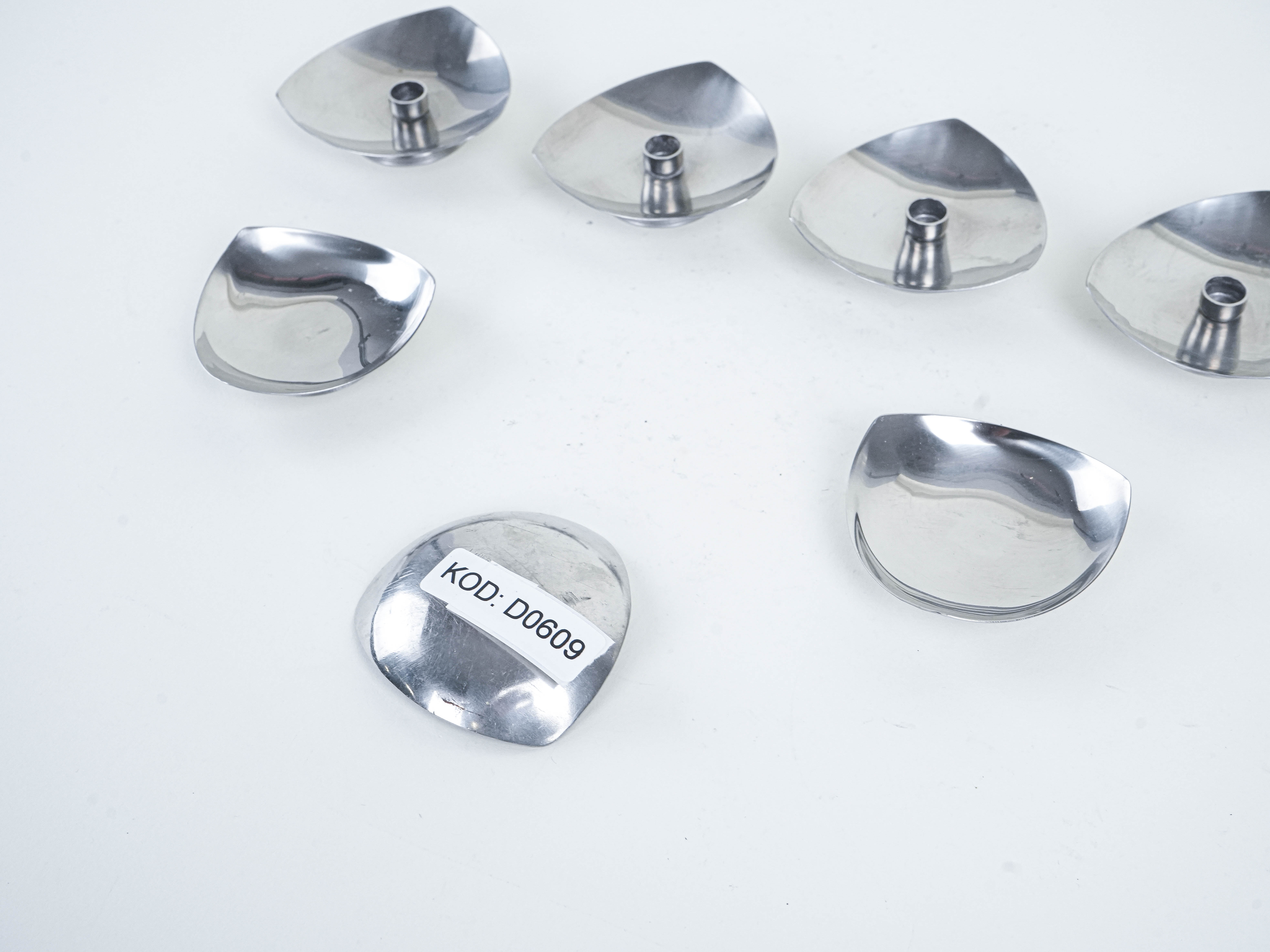 A set of seven modular candleholders in the Stelton / Arne Jacobsen style, made from polished stainless steel. The organic, triangular forms, inspired by nature, can be freely combined to create striking arrangements – from minimalist compositions to elaborate table settings. An icon of mid-century Danish design, combining simplicity of form with functionality and timeless elegance. Ideal both for collectors of Scandinavian design and as a unique accent in modern interiors.