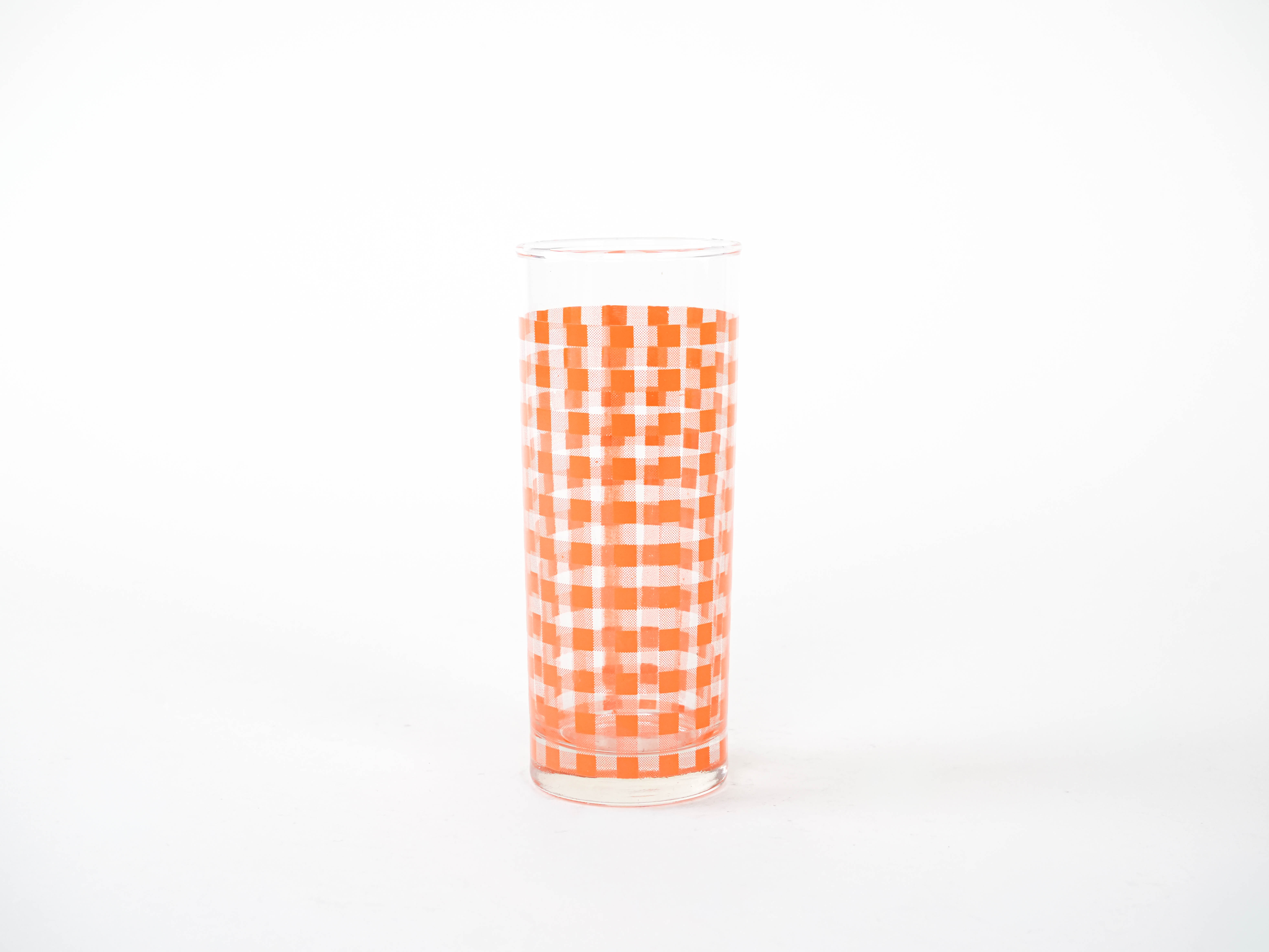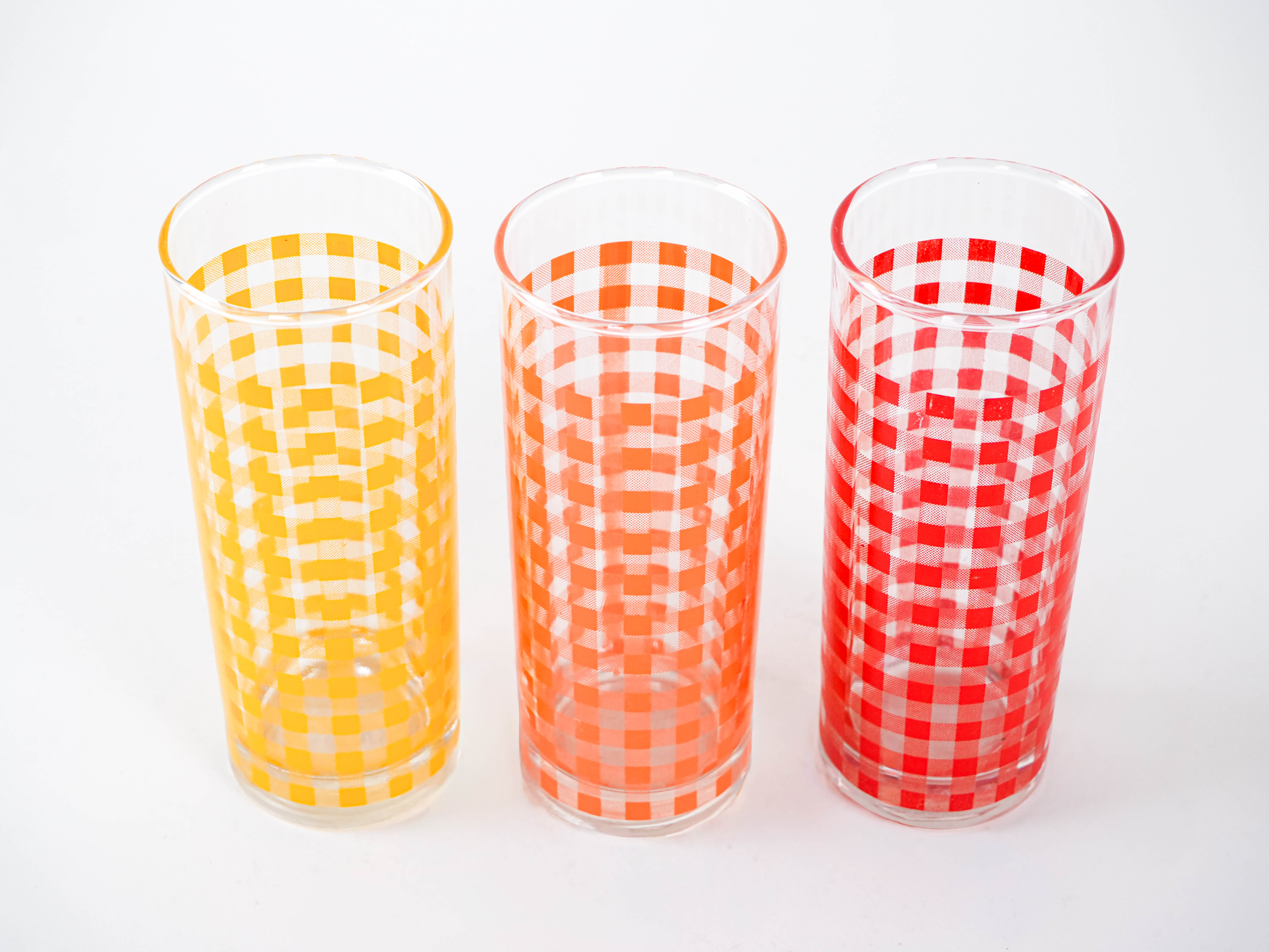 A set of three tall glasses from the 1960s/1970s, decorated with a colorful checkered pattern in shades of red, orange, and yellow. The vibrant colors and geometric motif give them a pop-art feel and evoke a retro diner and space age vibe. Perfect for summer cocktails, lemon water, or colorful drinks—they’ll bring energy and style to any table.