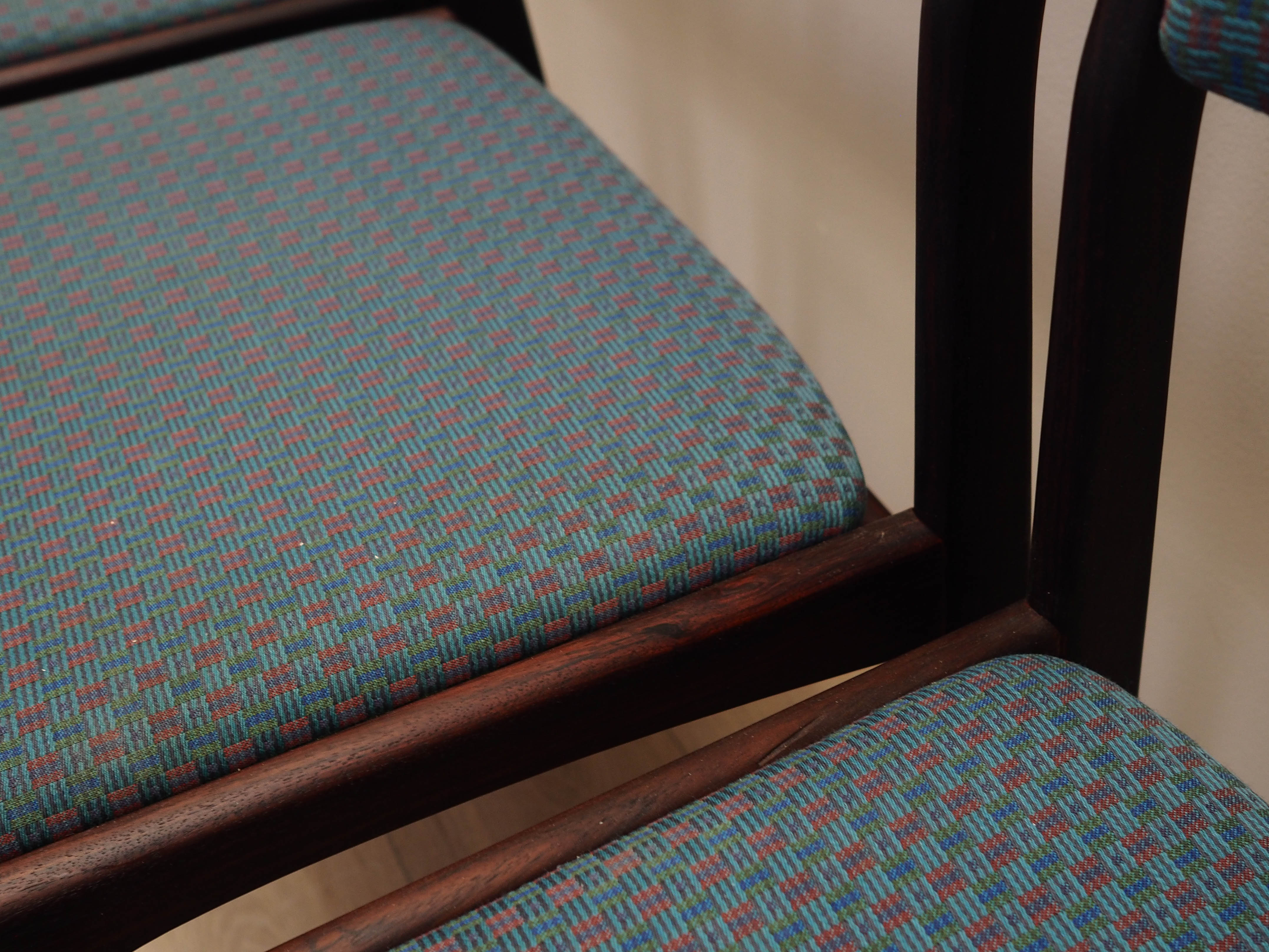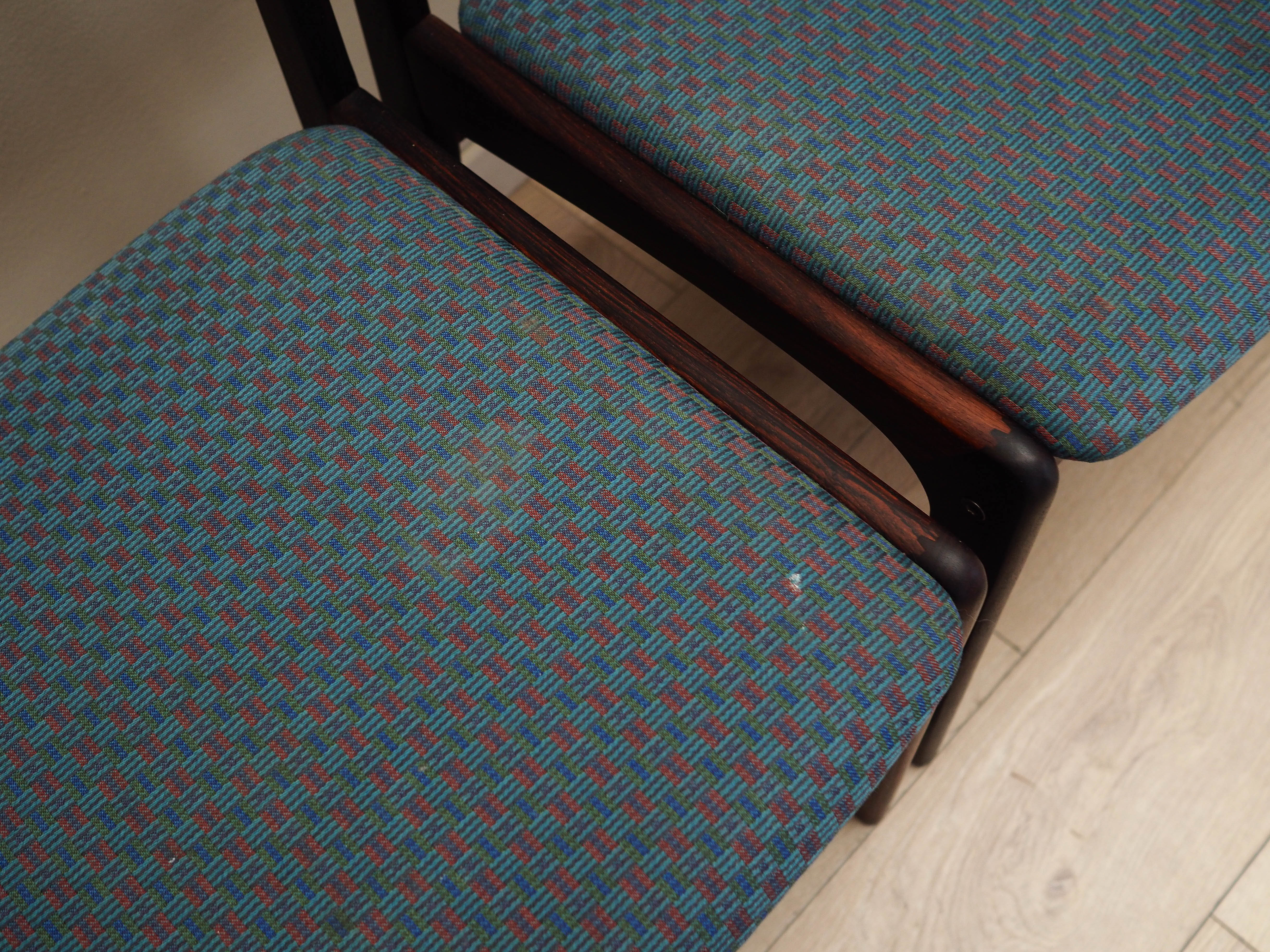 The frame is made of rosewood. The wood has been refreshed. The chairs have their original upholstery. The upholstery is multicoloured, made of high-quality fabric.