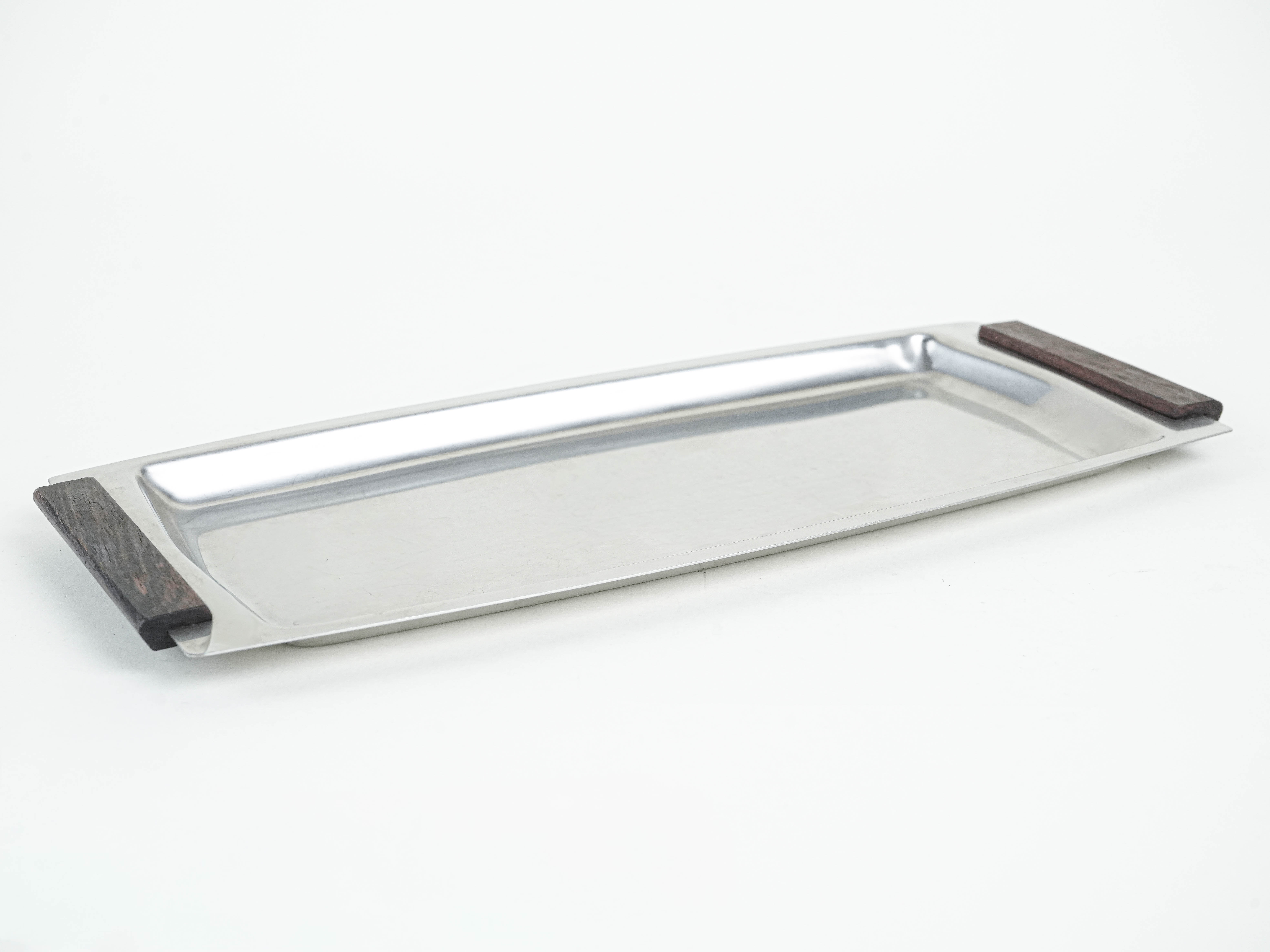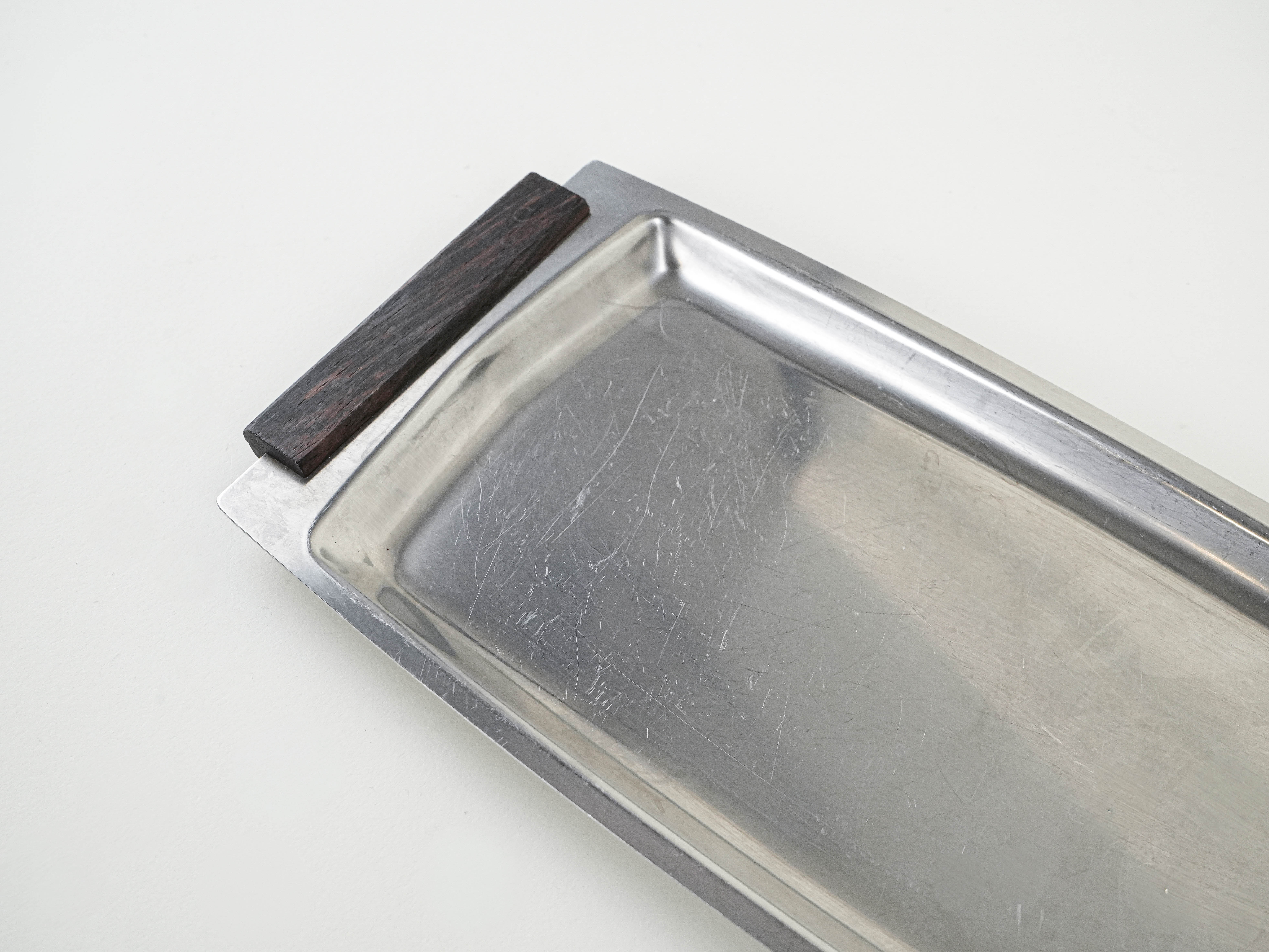 An elegant vintage stainless steel tray from the 1960s–70s, finished with simple dark wood handles. Its minimalist form and contrasting materials are in keeping with the Scandinavian modernist design characteristic of the mid-century era. Ideal both for serving and as a decorative interior feature.