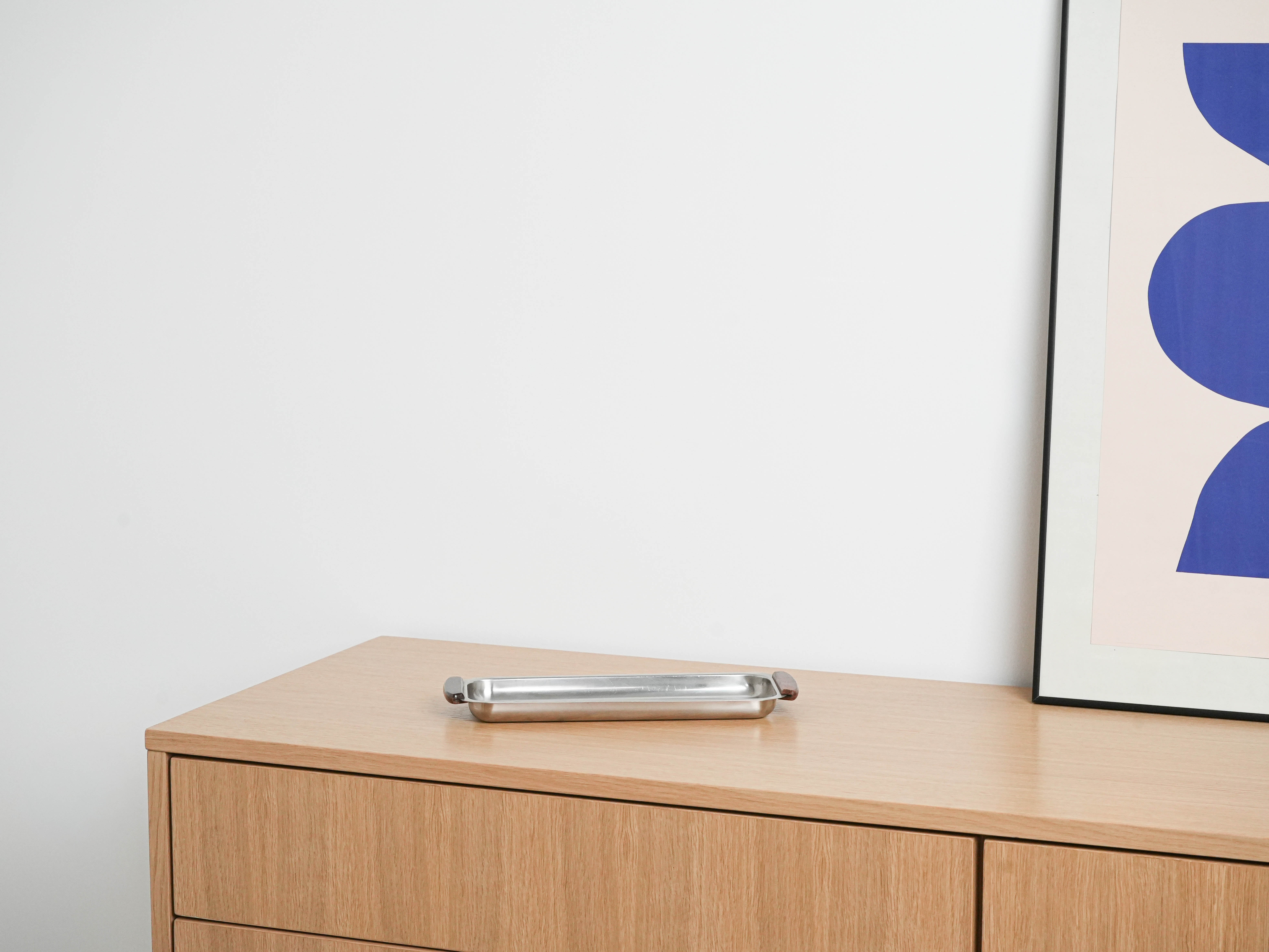 A slender rectangular stainless steel tray with wooden side handles, designed in the mid-century modern style of the 1960s–70s. Its elegant form is ideal both for serving snacks or drinks and as a decorative feature in a modern interior.