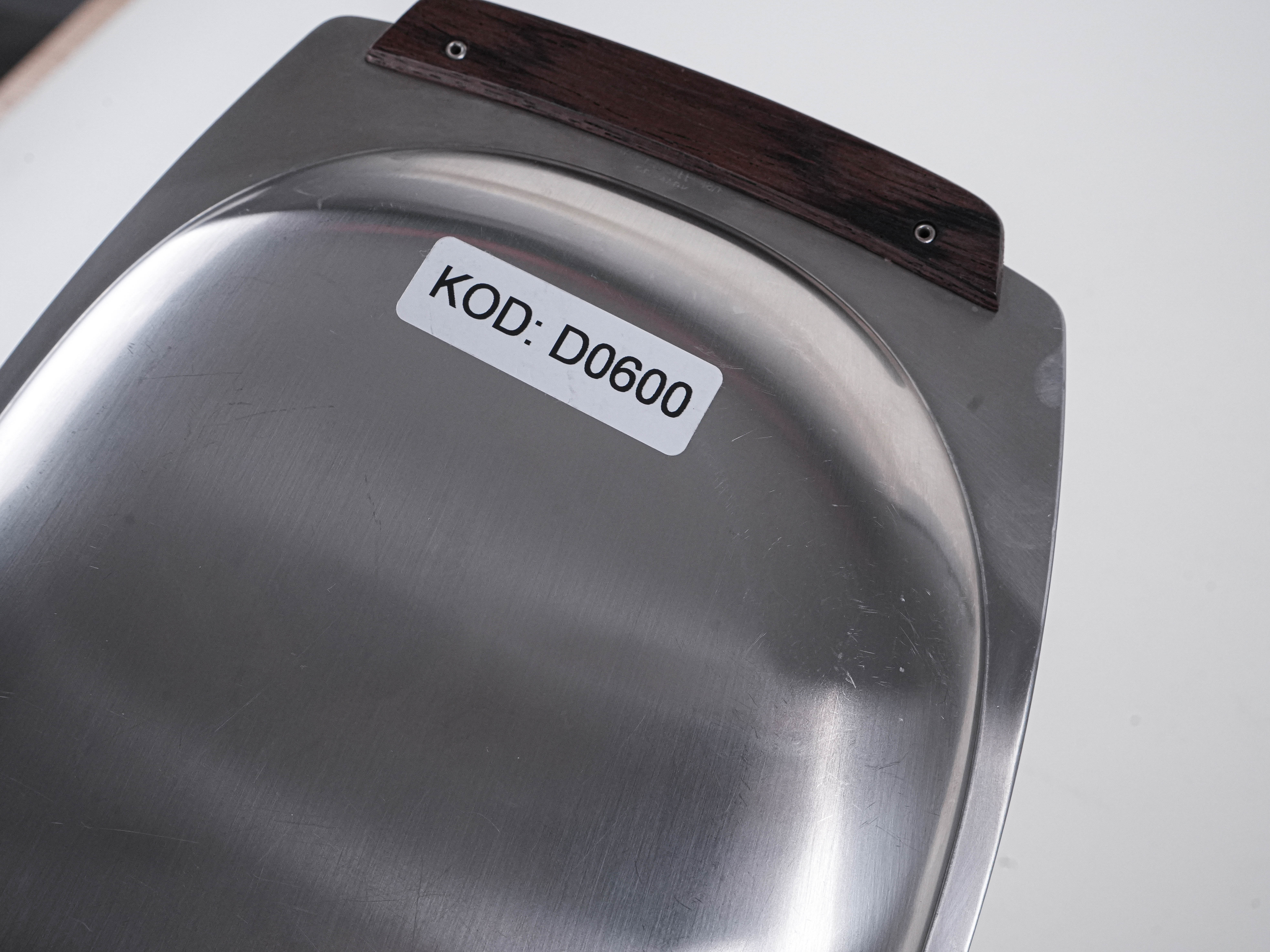 An elegant oval stainless steel tray with wooden side handles. A minimalist design in the Scandinavian mid-century modern style of the 1960s–70s. Perfect for serving, but also as a decorative feature on a table or in a retro kitchen.