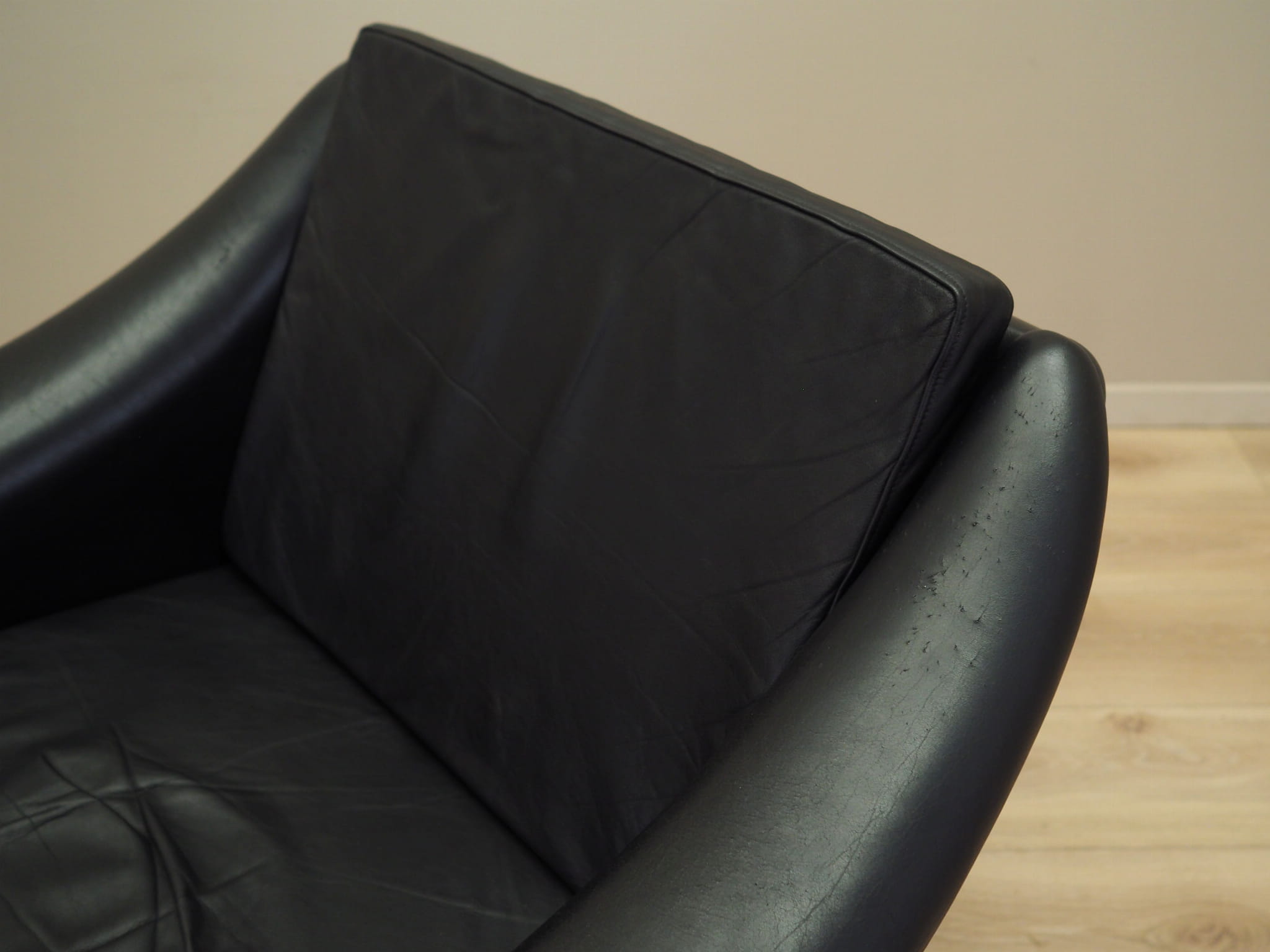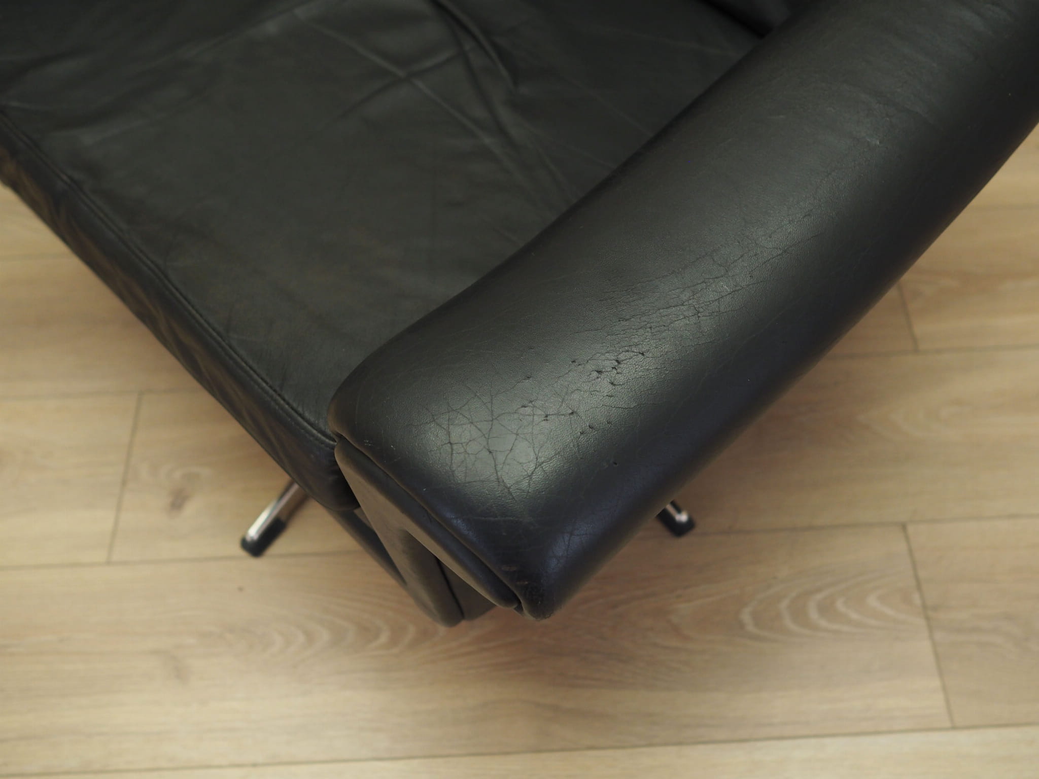 The leg is made of metal. The armchair is covered with original high quality natural leather. The leather has been made in black. We also offer a second, identical armchair and sofa, which together will create a unique living room set.